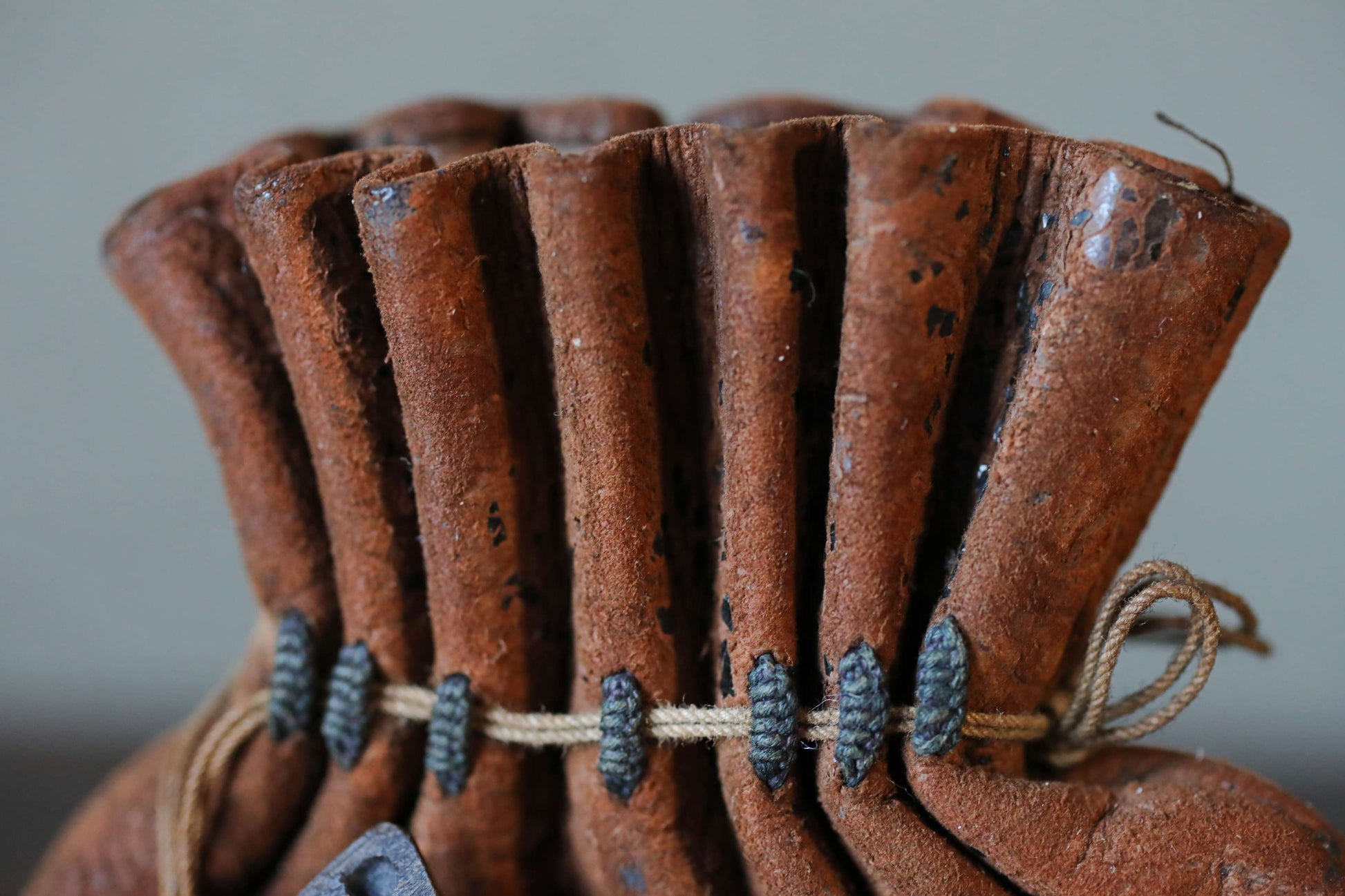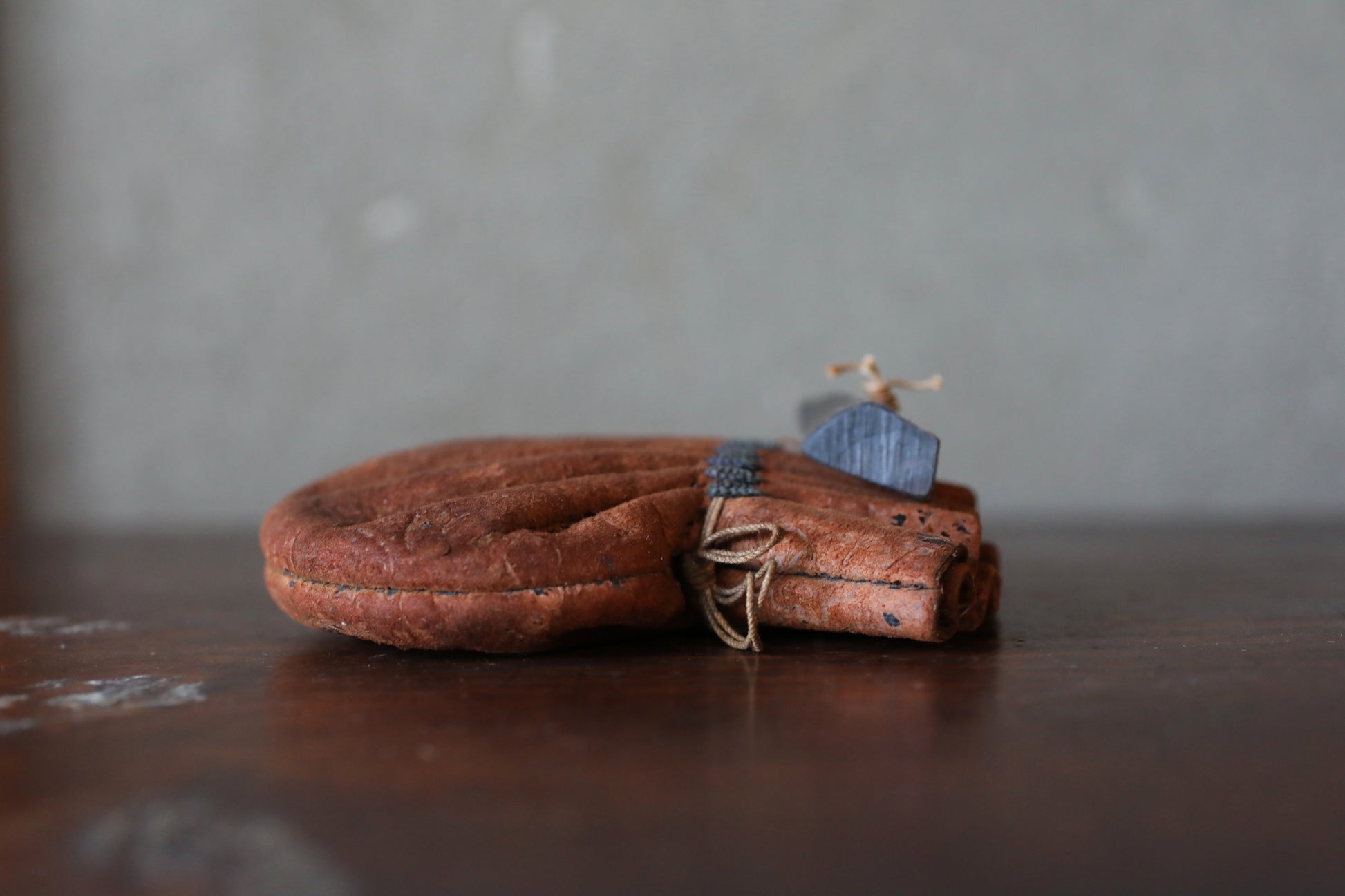 Upon closer inspection, the part where the cord passes through the pouch is carefully made with indigo-dyed thread. It's a very cool item with a great aged look.