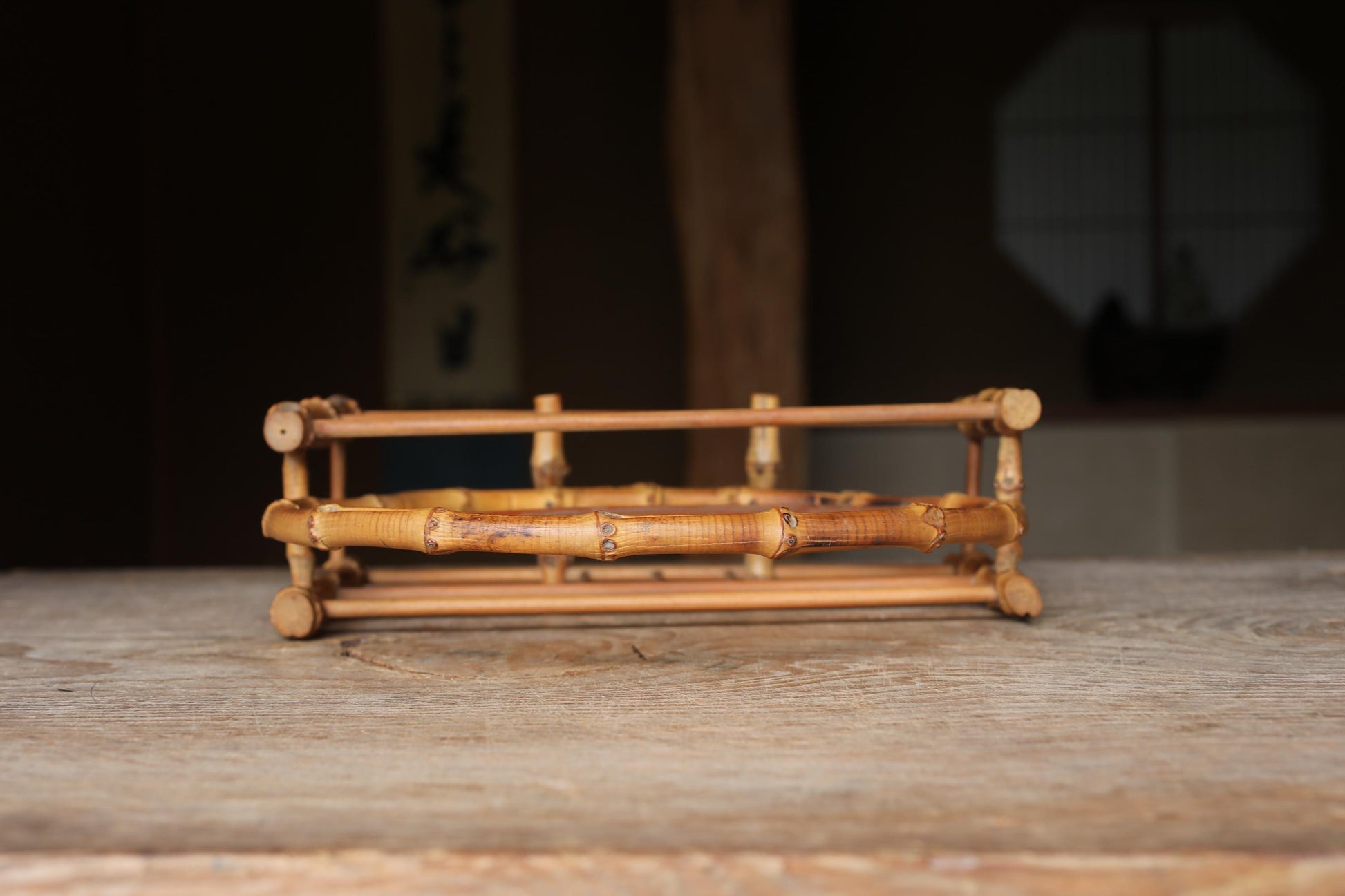 Made entirely by hand using bamboo as the material. As a craft material, bamboo is used as is, or processed into thin sheets or bark. This fan stand features a striking round shape and a design that makes use of the bamboo joints. Some wood is also used. Its cool atmosphere makes it ideal for summer.
