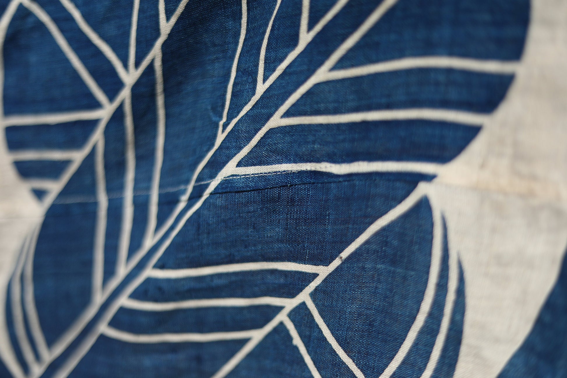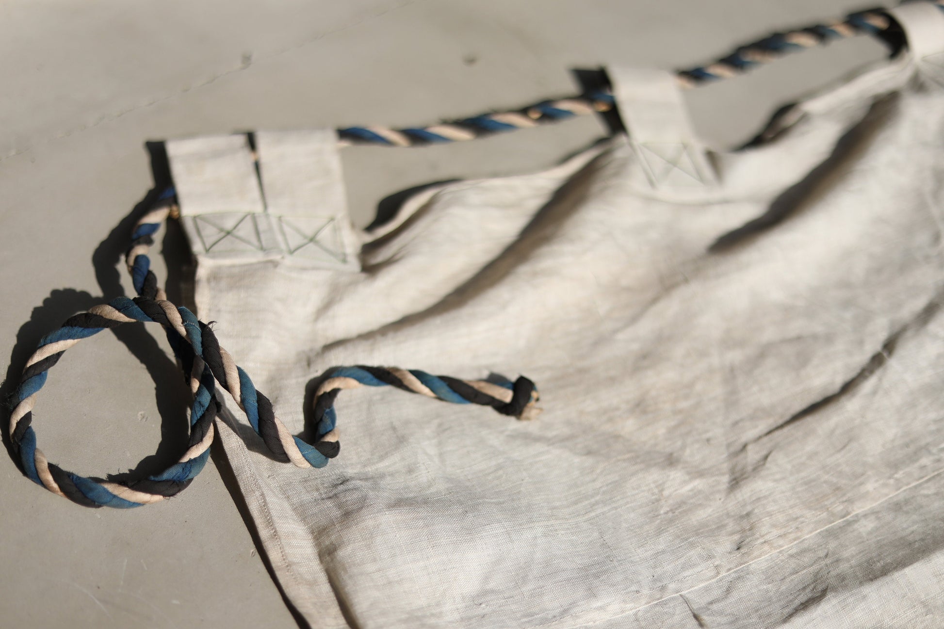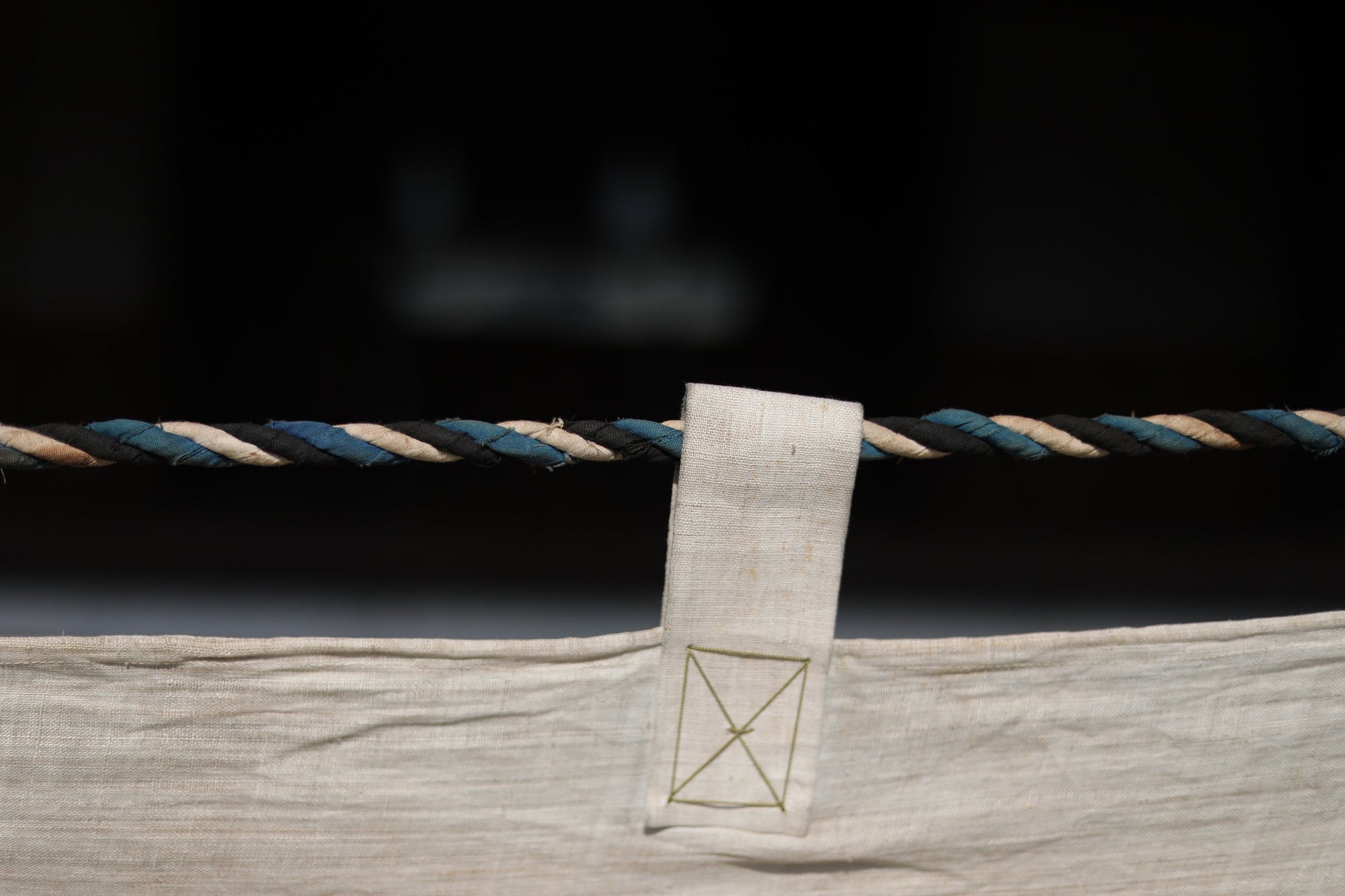 This is a rare and wonderful item from the late 1700s. It is very large and should be used outdoors or in a very large space. It is made entirely of natural linen. The cloth is taut and has discoloration from age, but that is also cool. The indigo color of the natural dyeing is very beautiful, and the strings are also all dyed in natural colors.