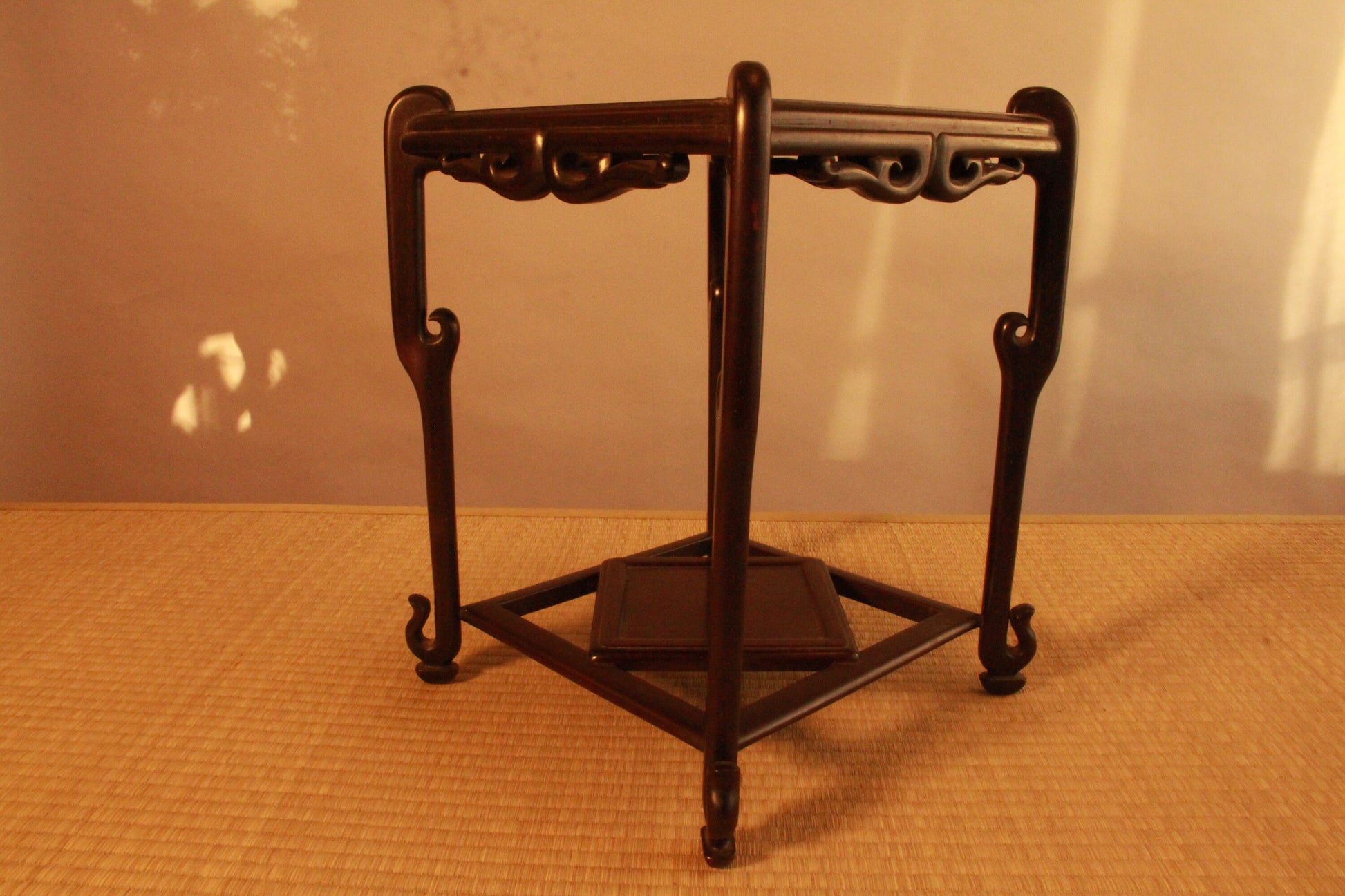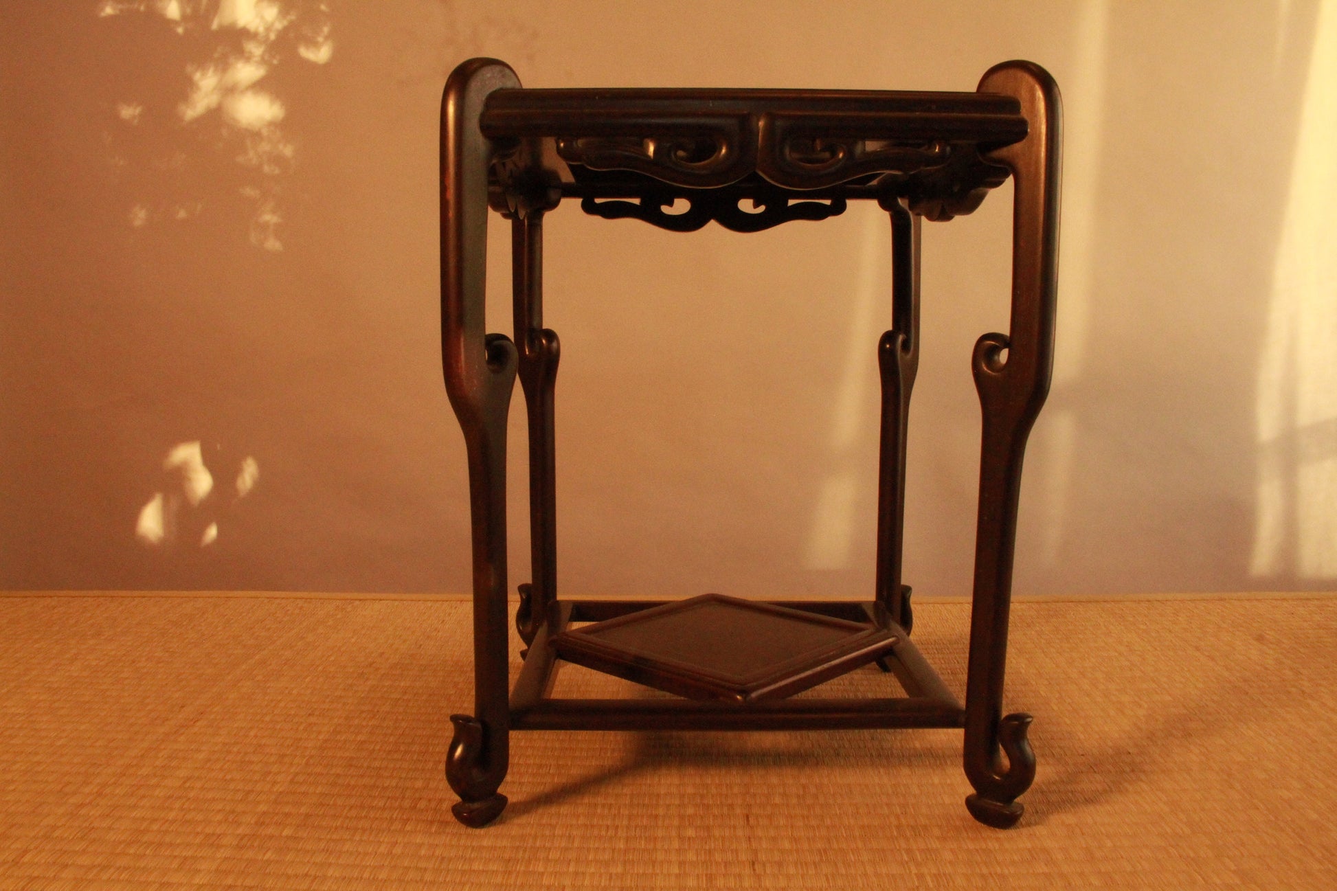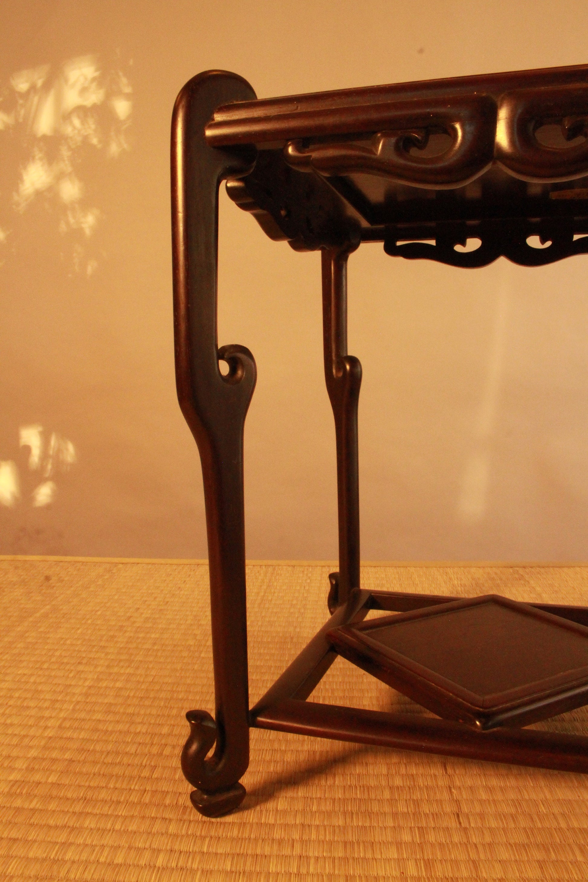 Decoration Stand Pedestal Karaki dark brown wood with double shelves and unique legs, Japanese antique utensil for Ikebana Bonsai Japanese furniture H13.2×10×10in.