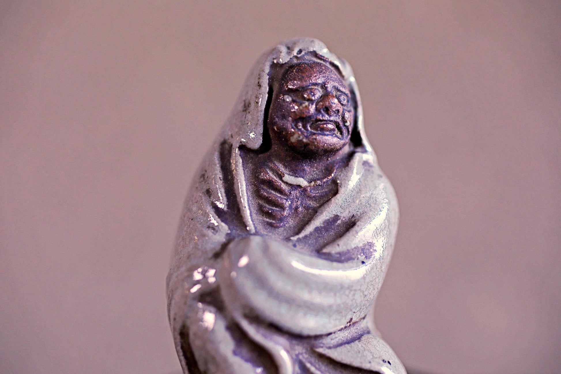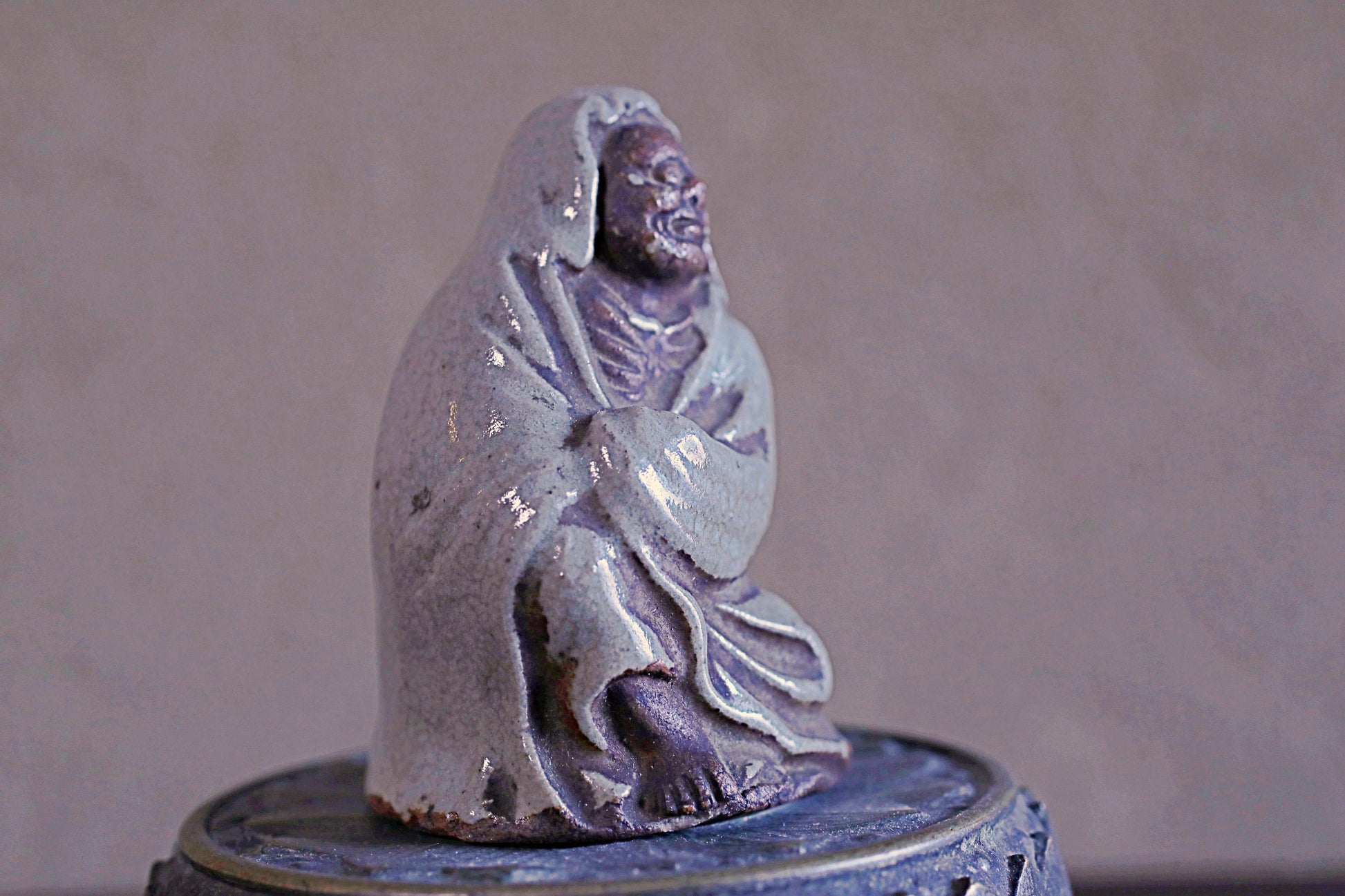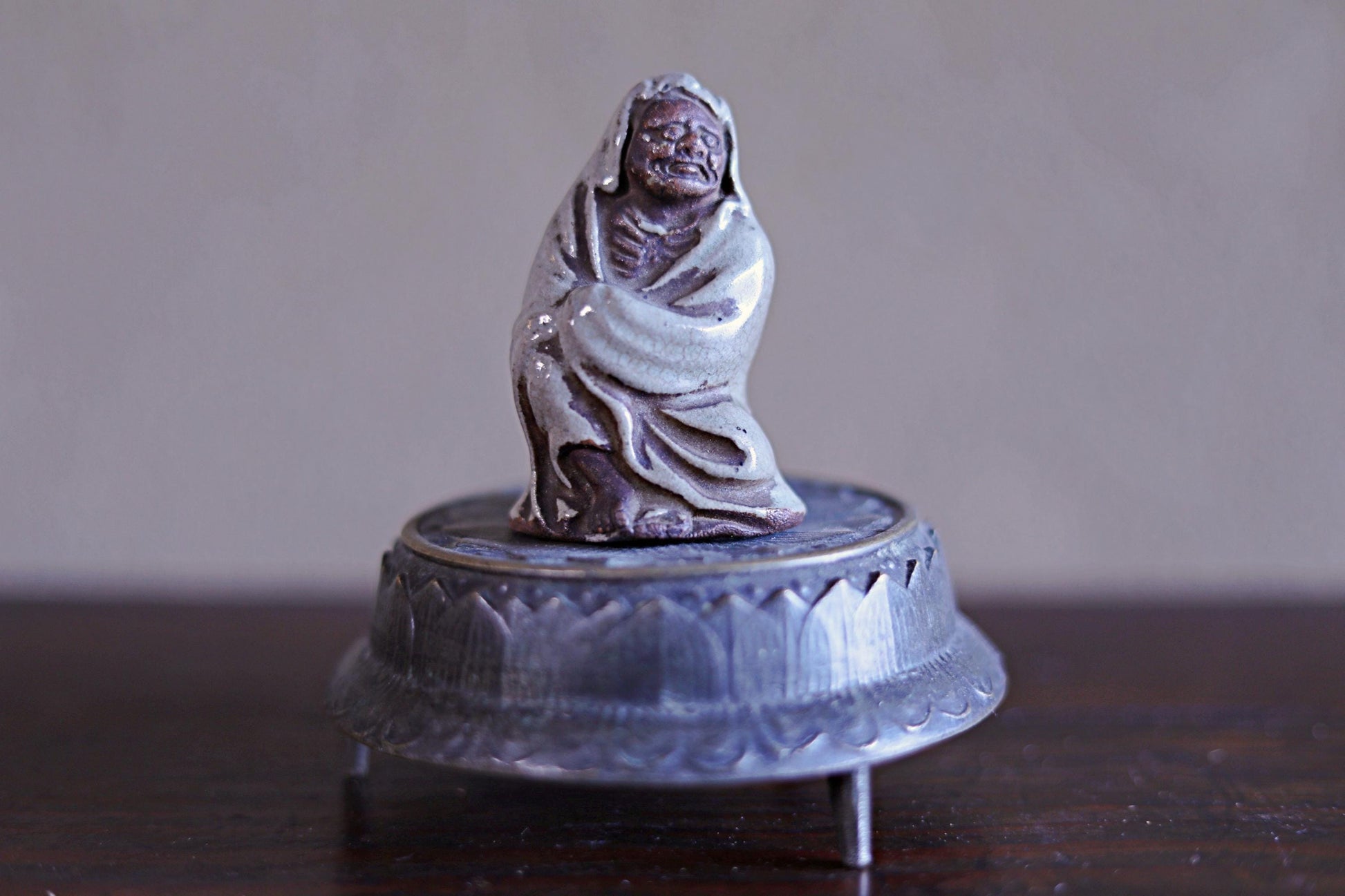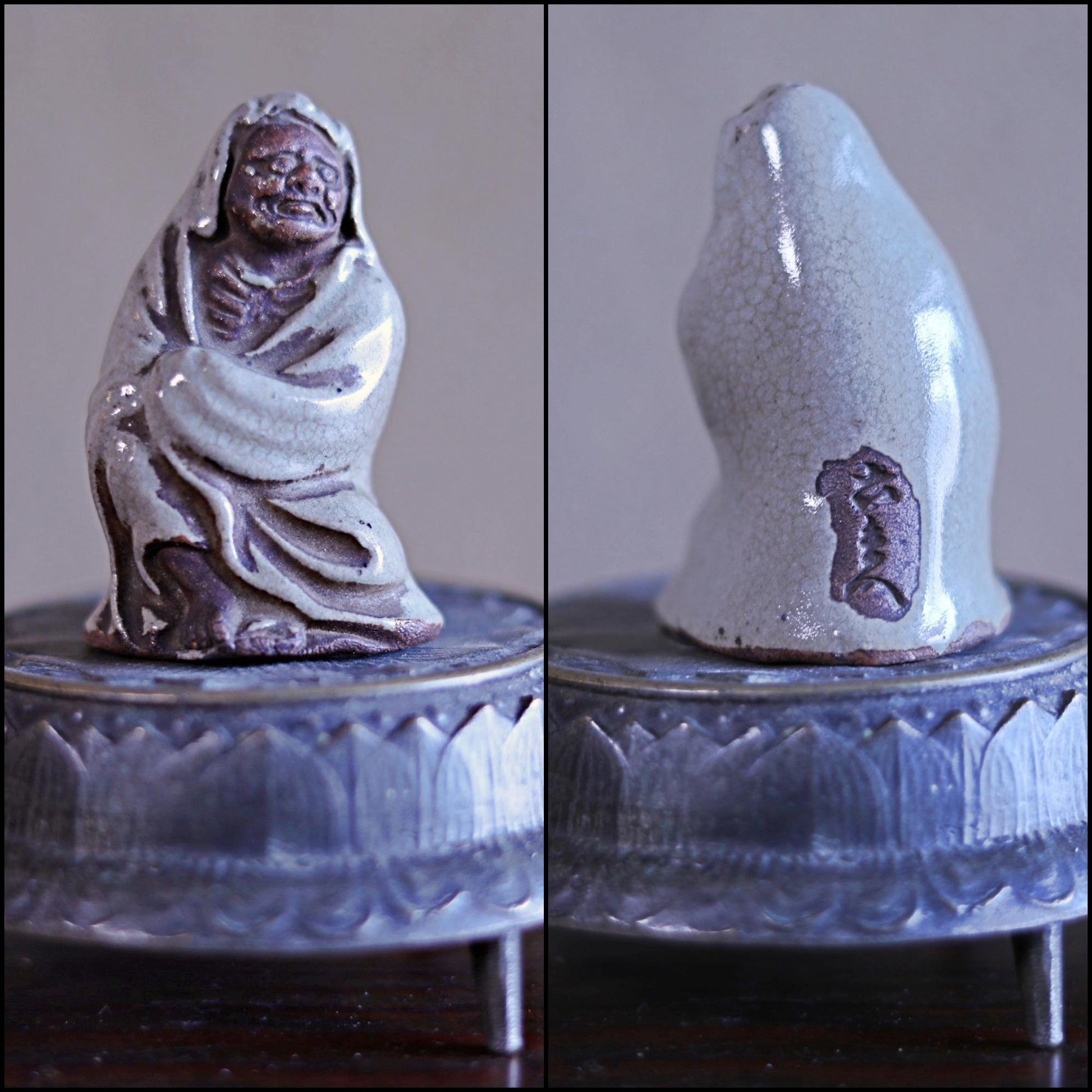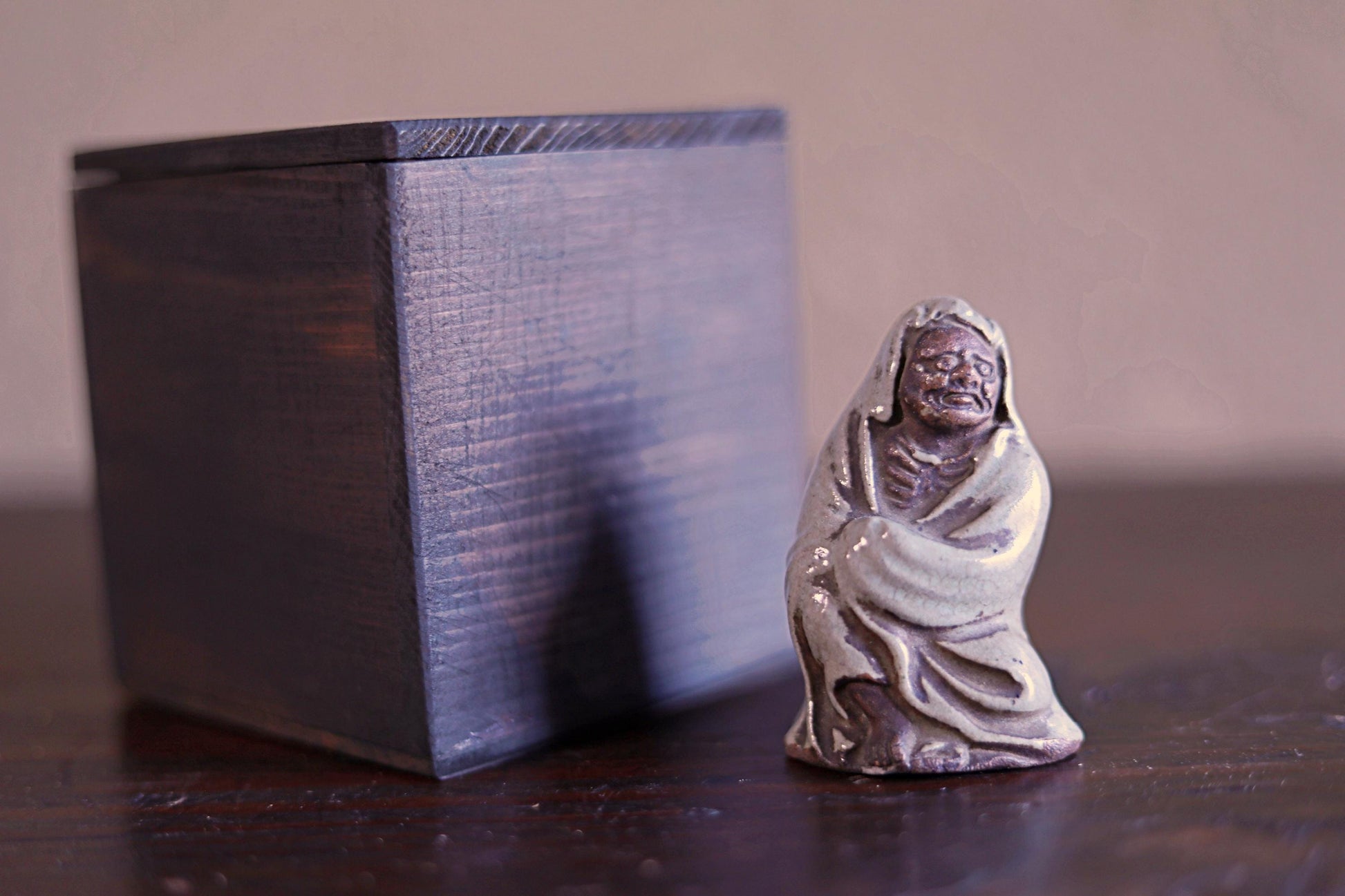 This Daruma has an atmosphere in the form of a rather stern-looking, cloth-clad figure standing. The color change over time is cool and there is a Chinese character carved on the back.