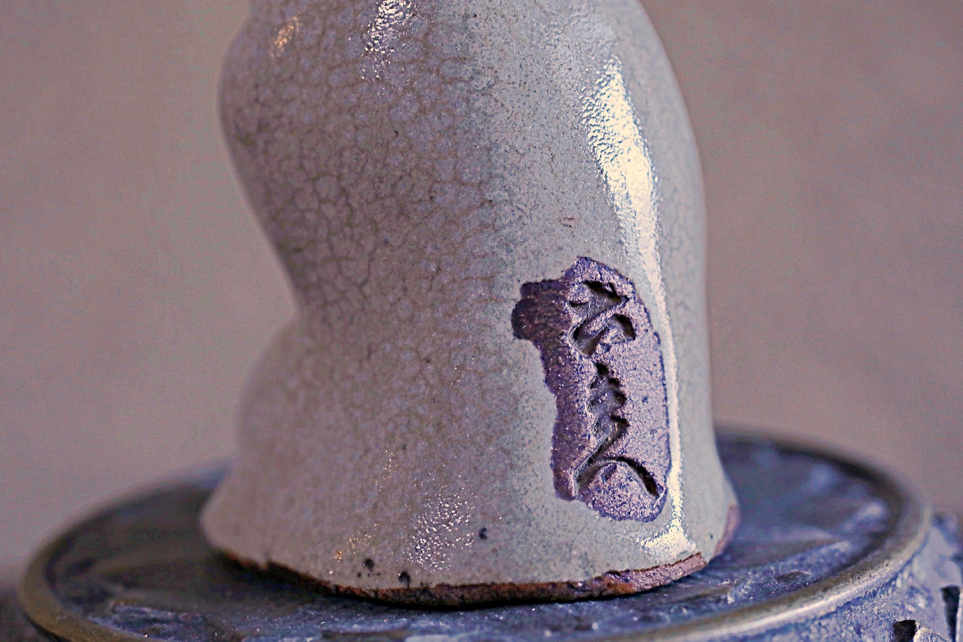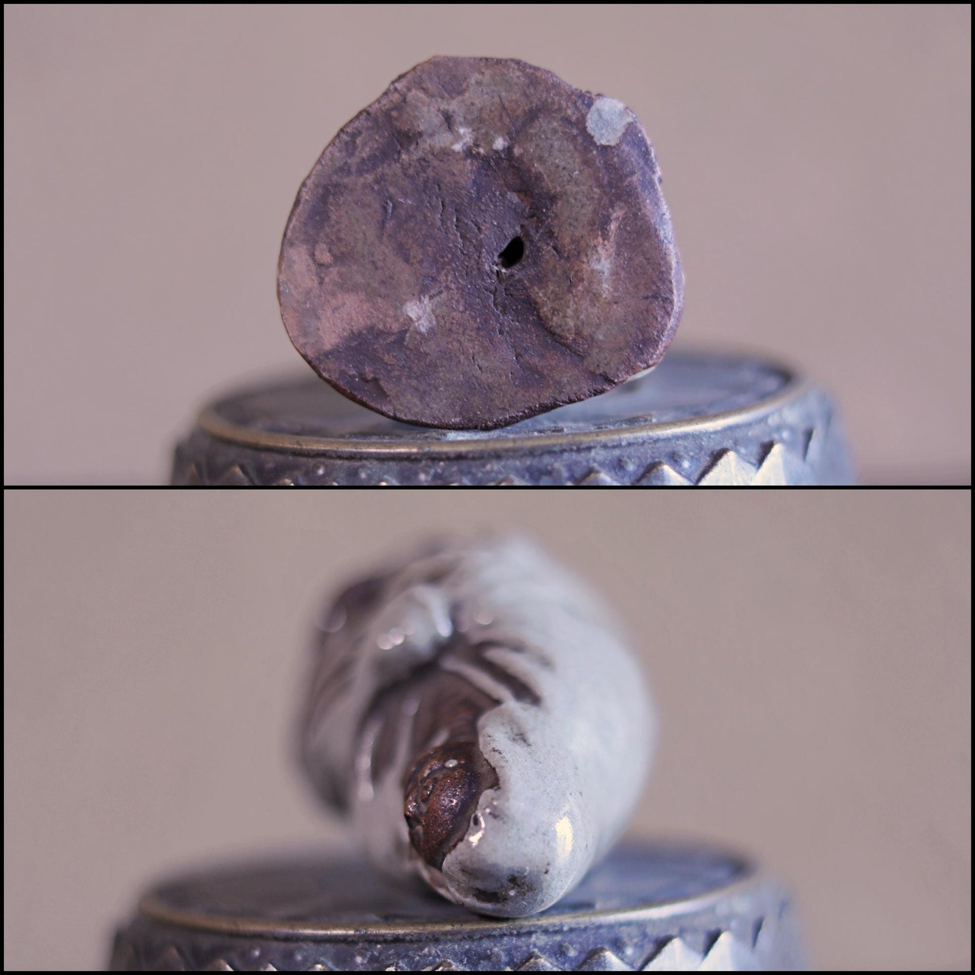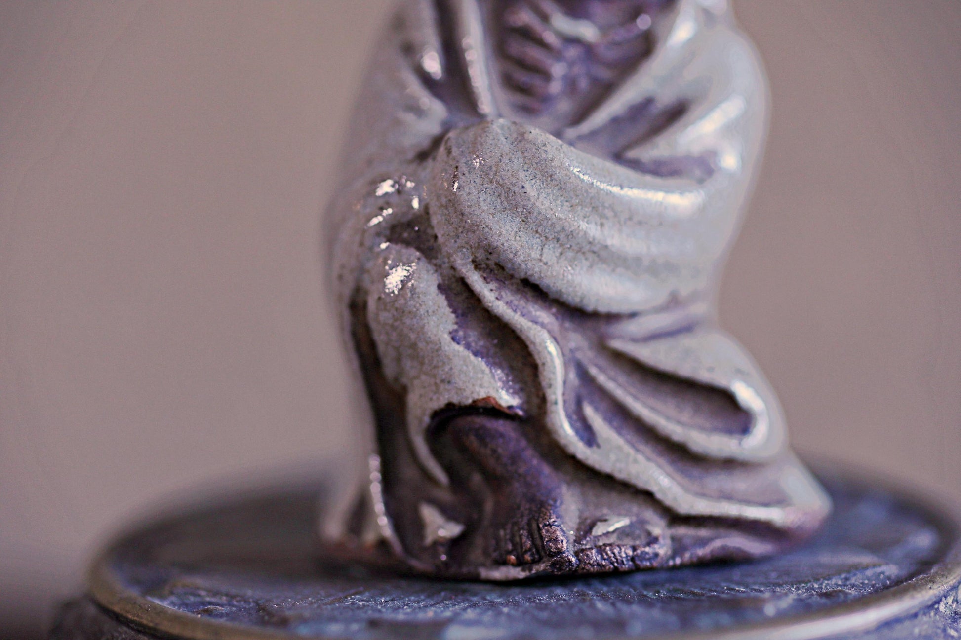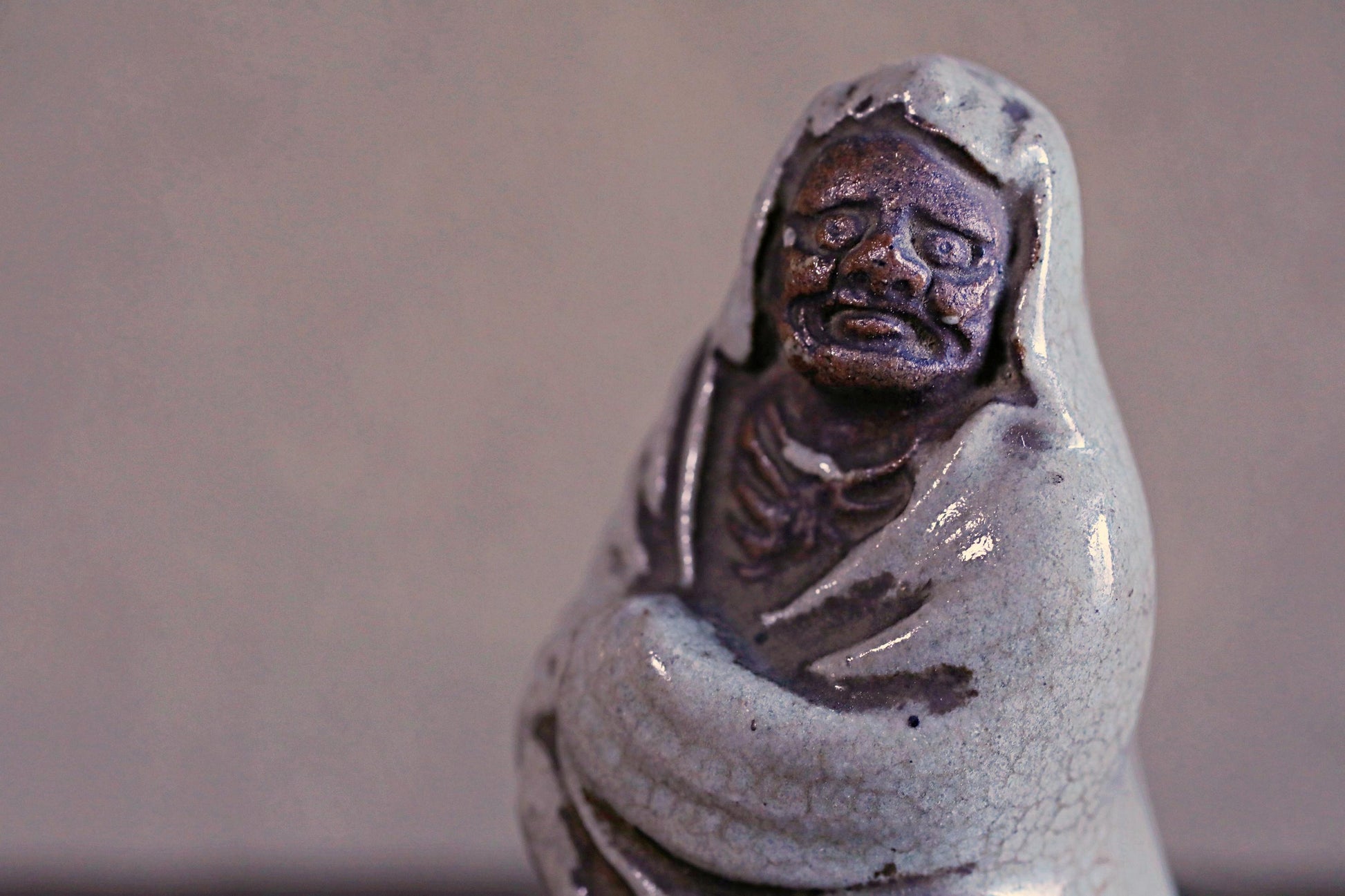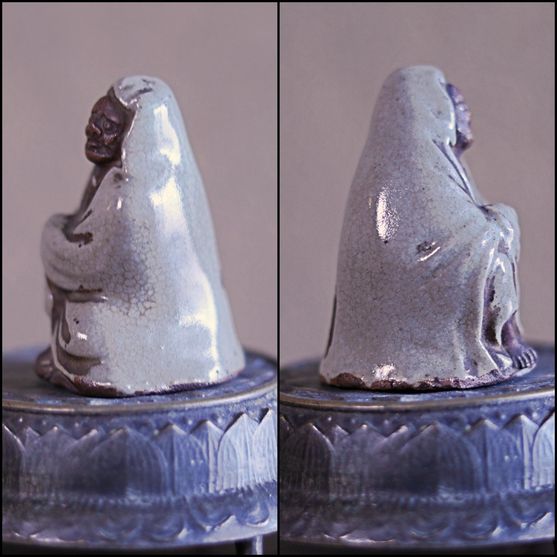 This Daruma has an atmosphere in the form of a rather stern-looking, cloth-clad figure standing. The color change over time is cool and there is a Chinese character carved on the back.