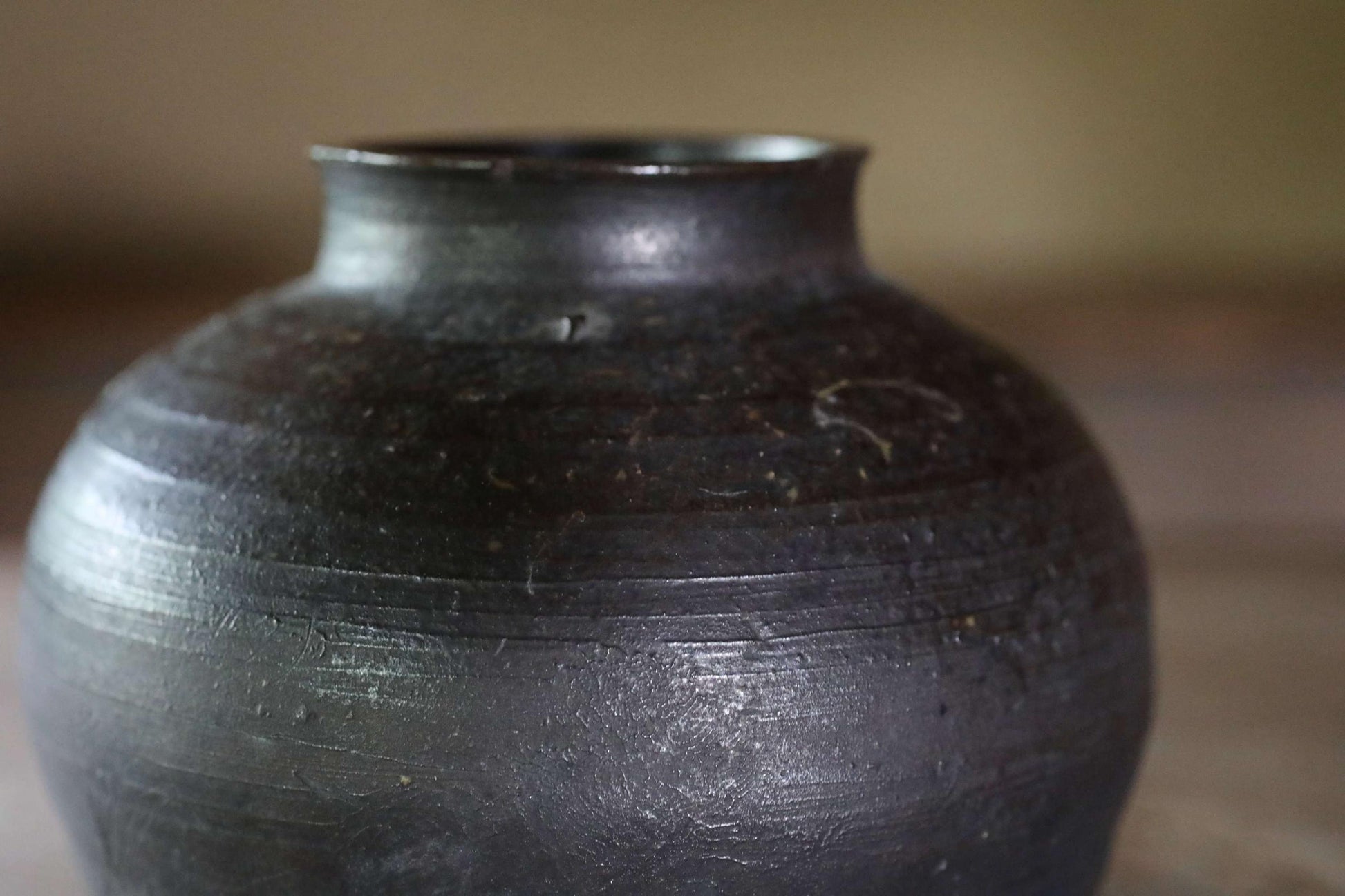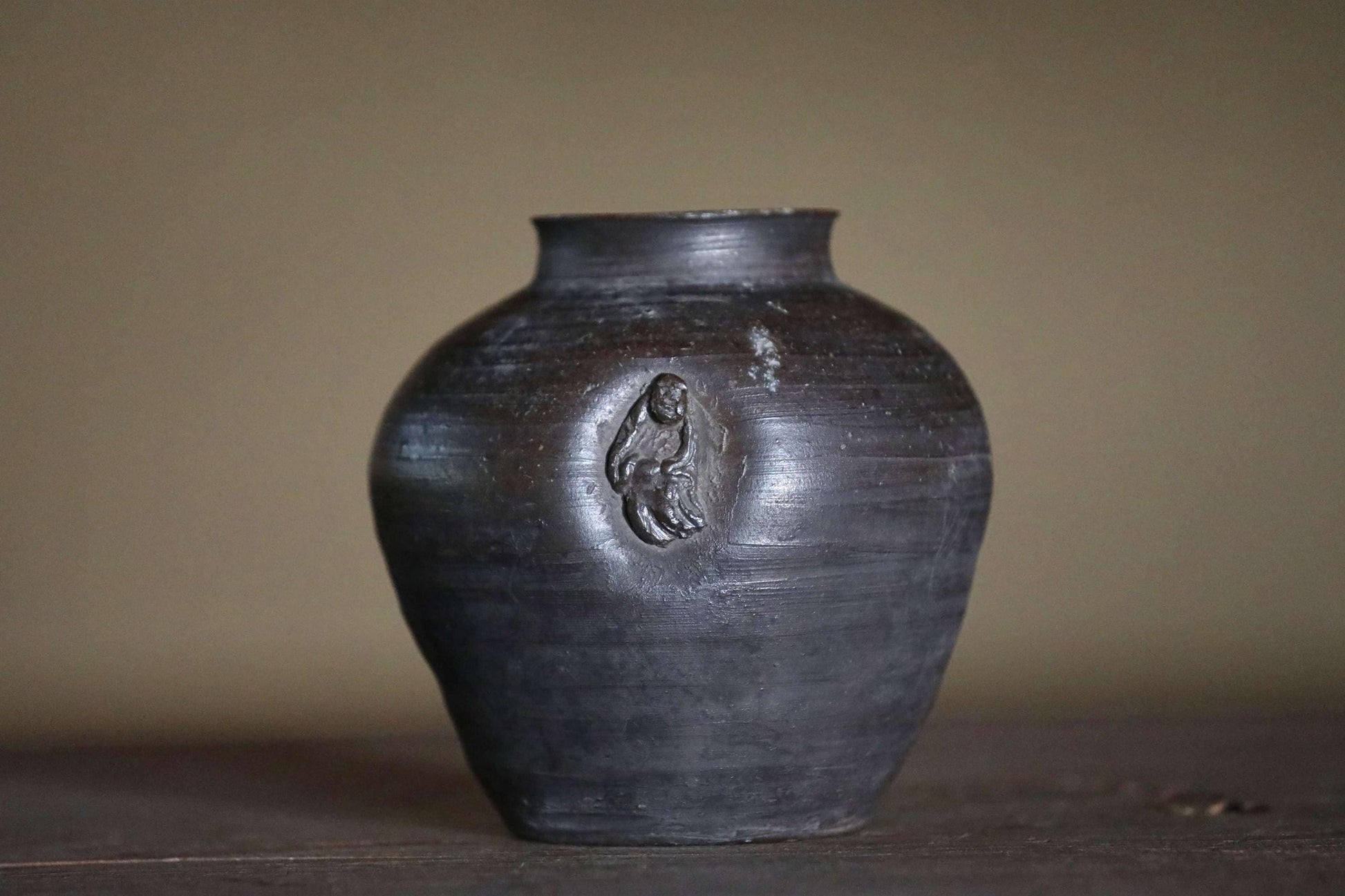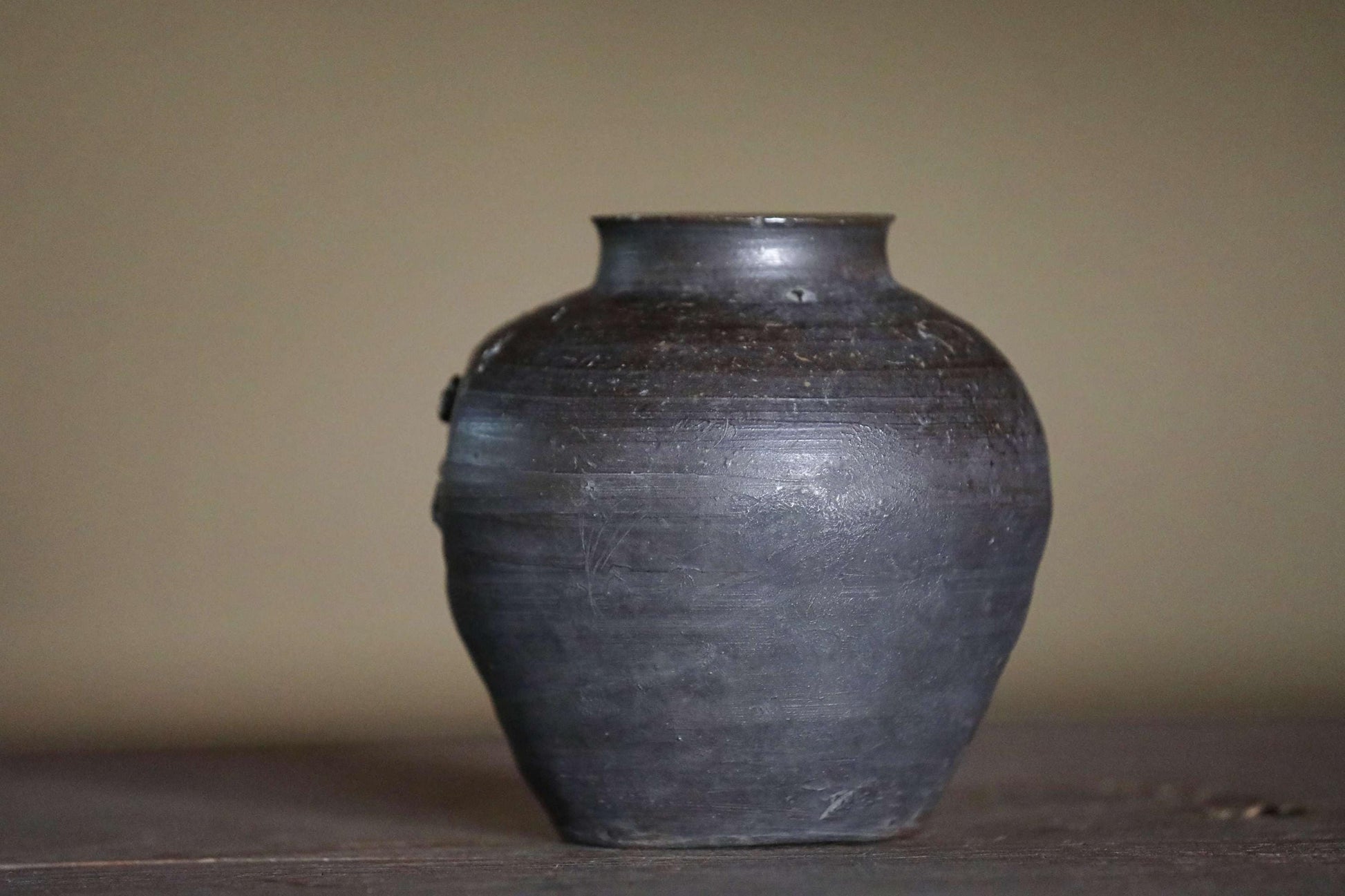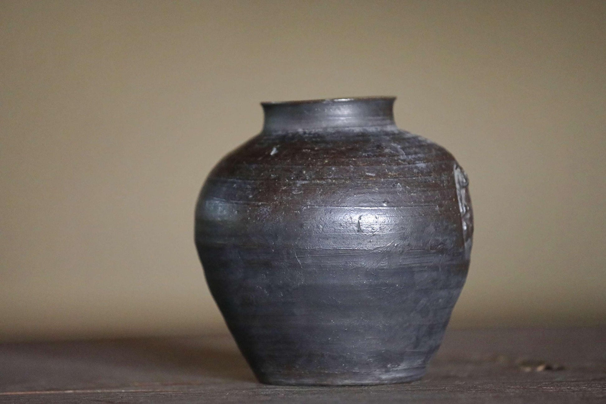 The warm, rustic texture of the clay, created by firing at high temperatures without glaze, is unique to Bizen ware. This one has a very cool deep, almost black hue.