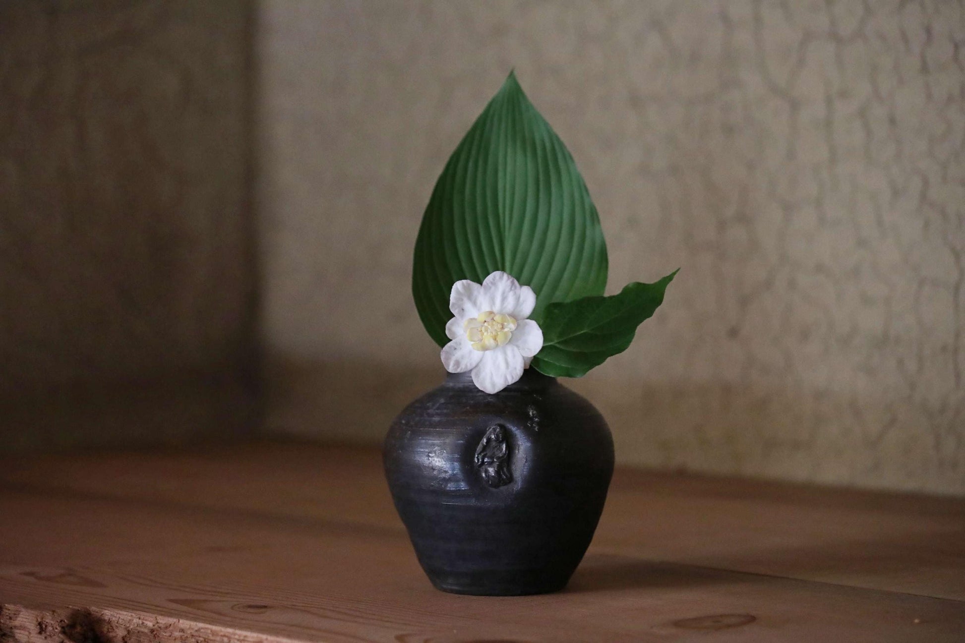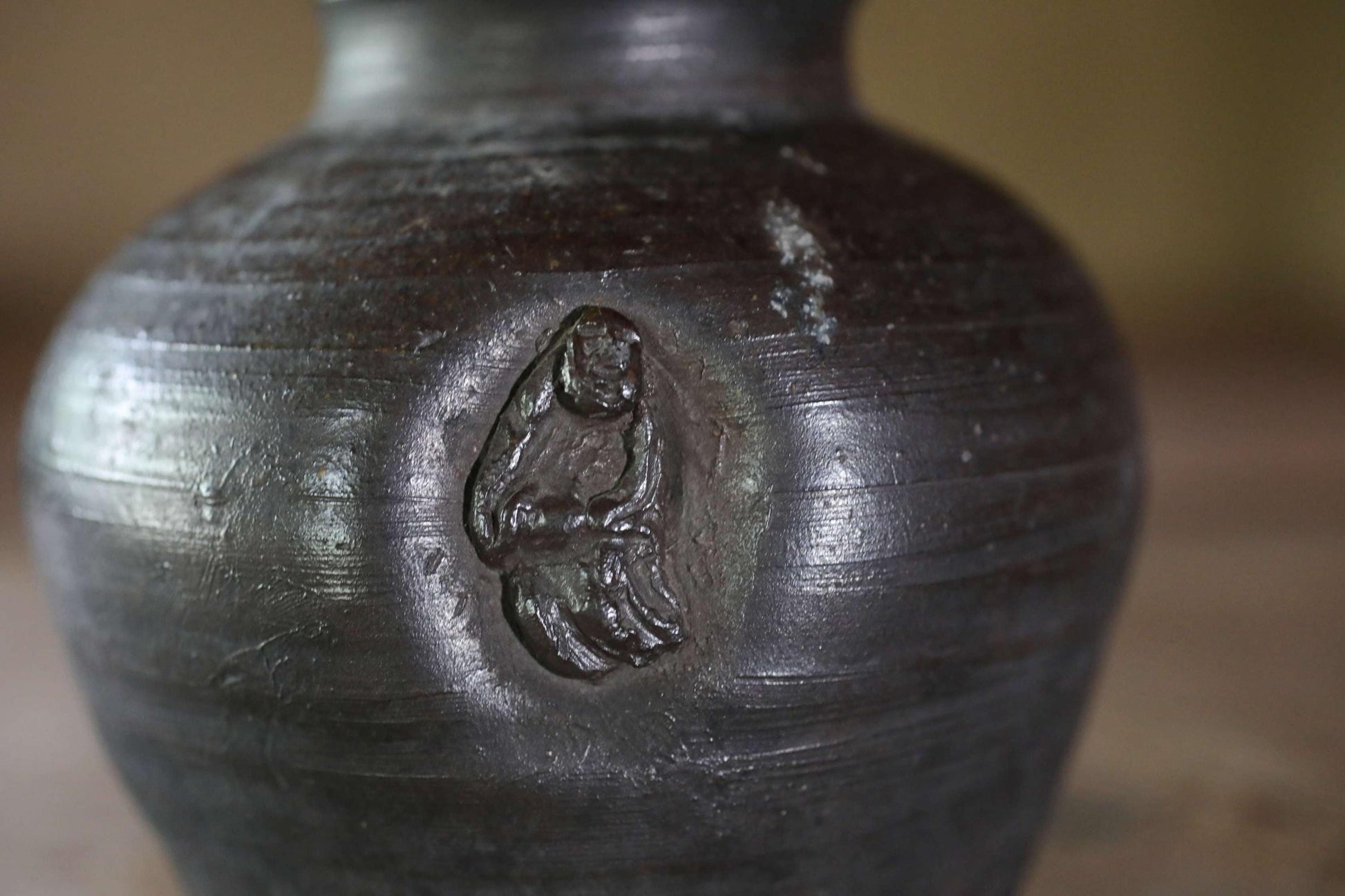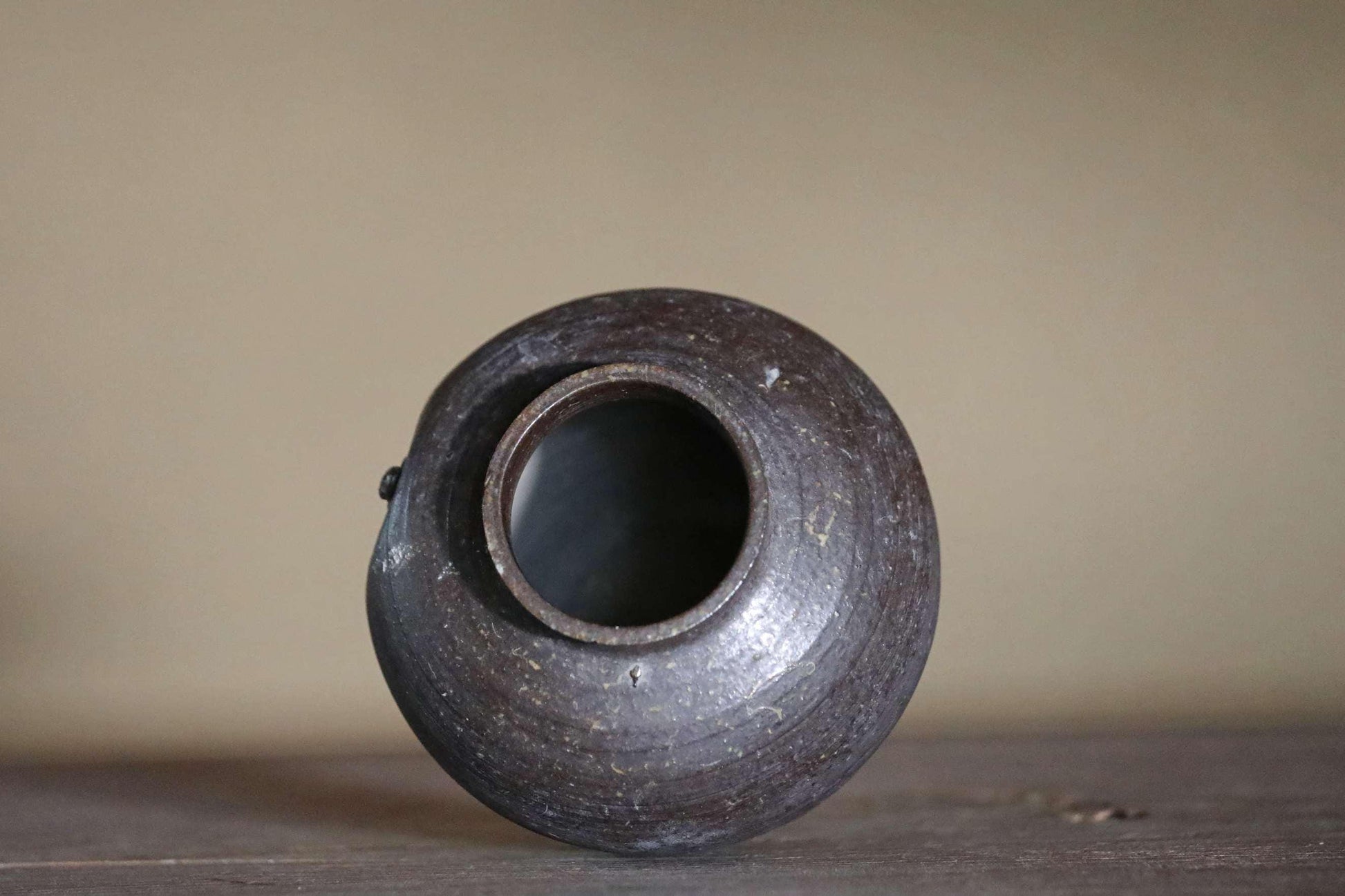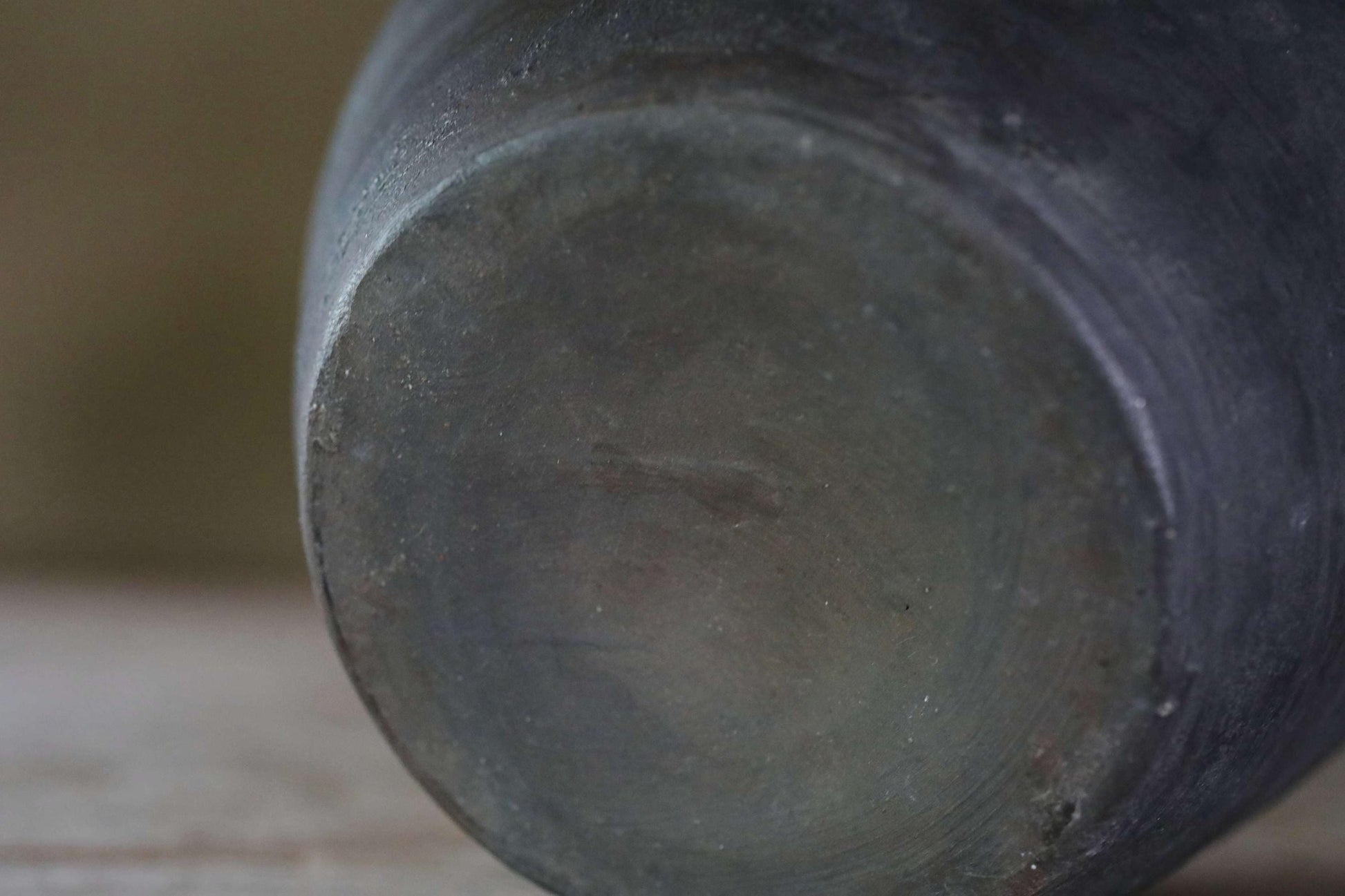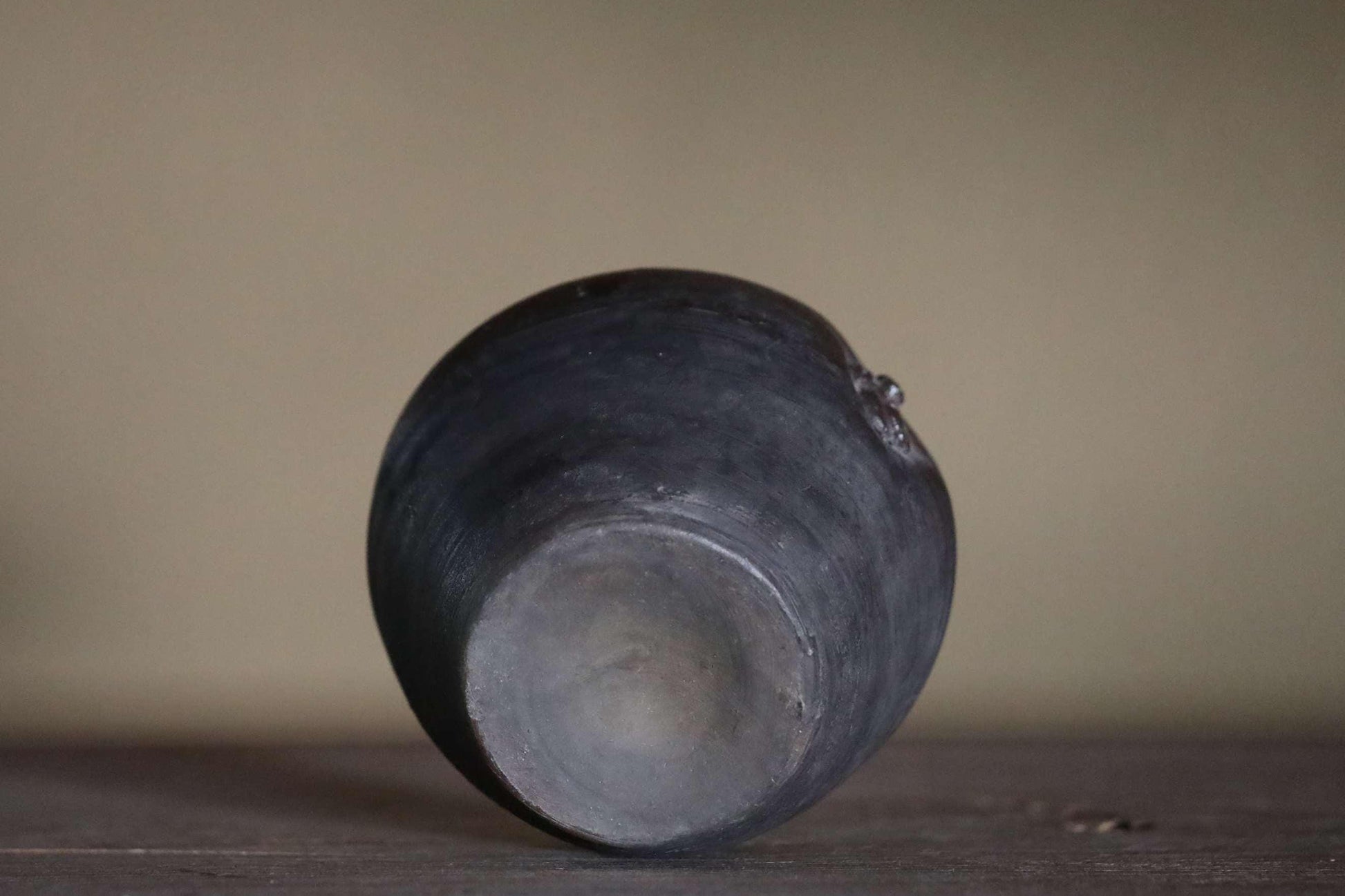 The warm, rustic texture of the clay, created by firing at high temperatures without glaze, is unique to Bizen ware. This one has a very cool deep, almost black hue.