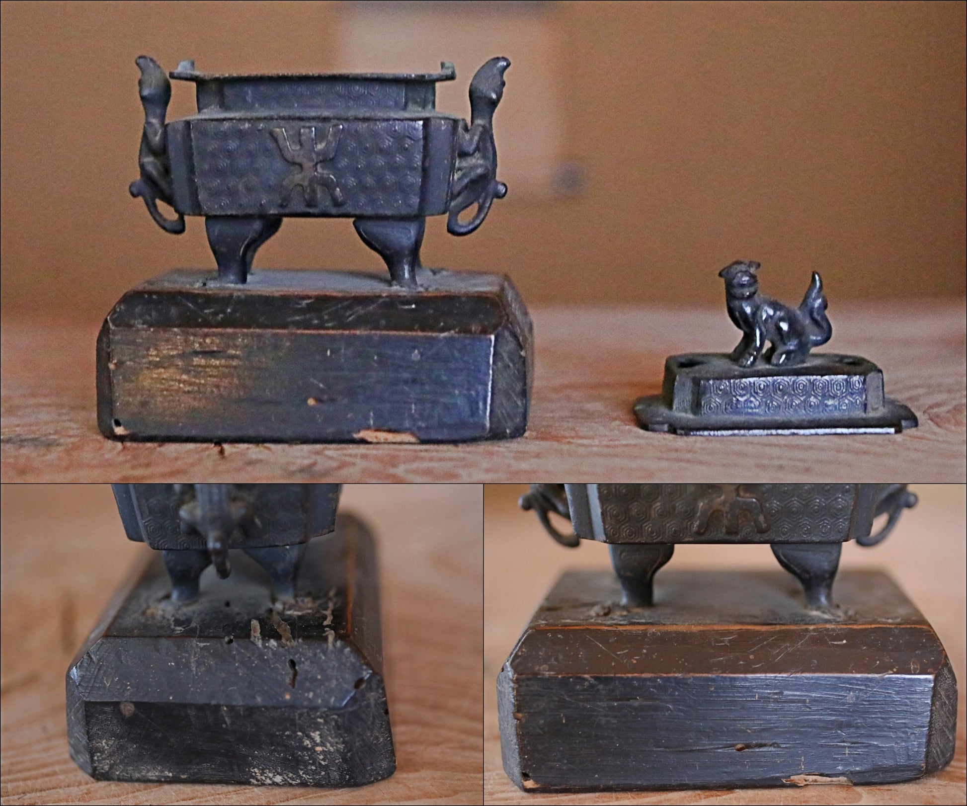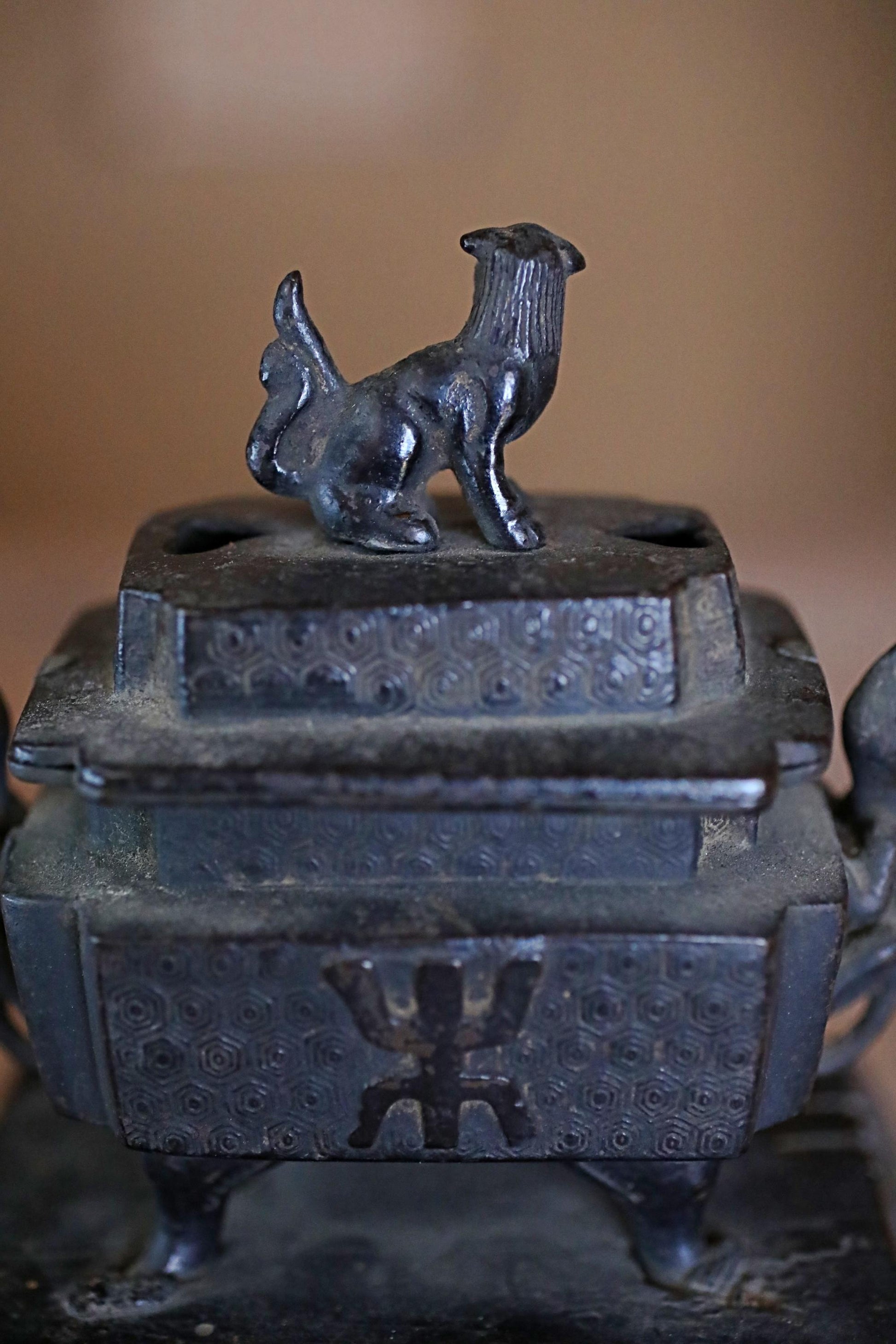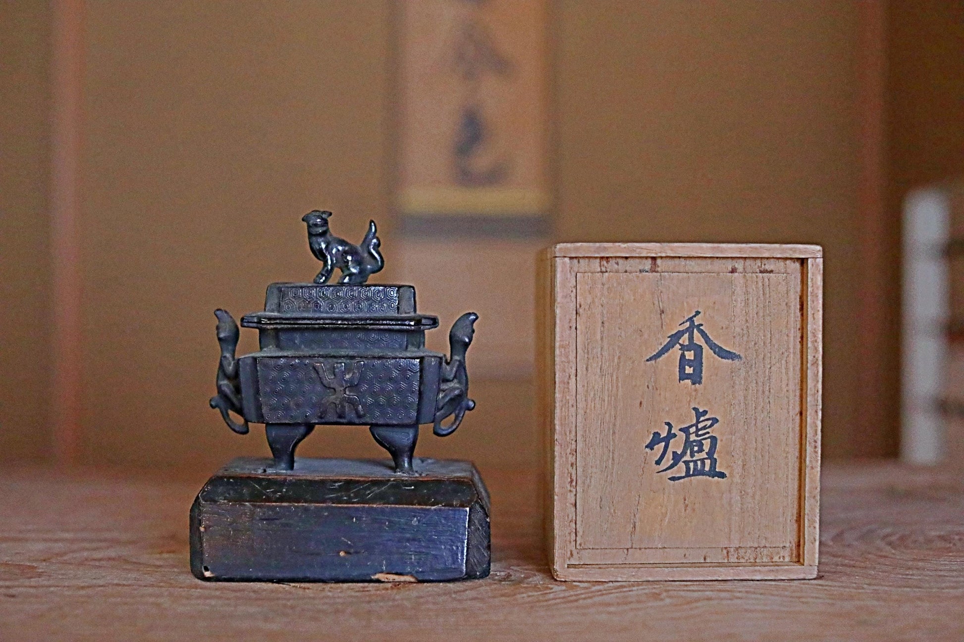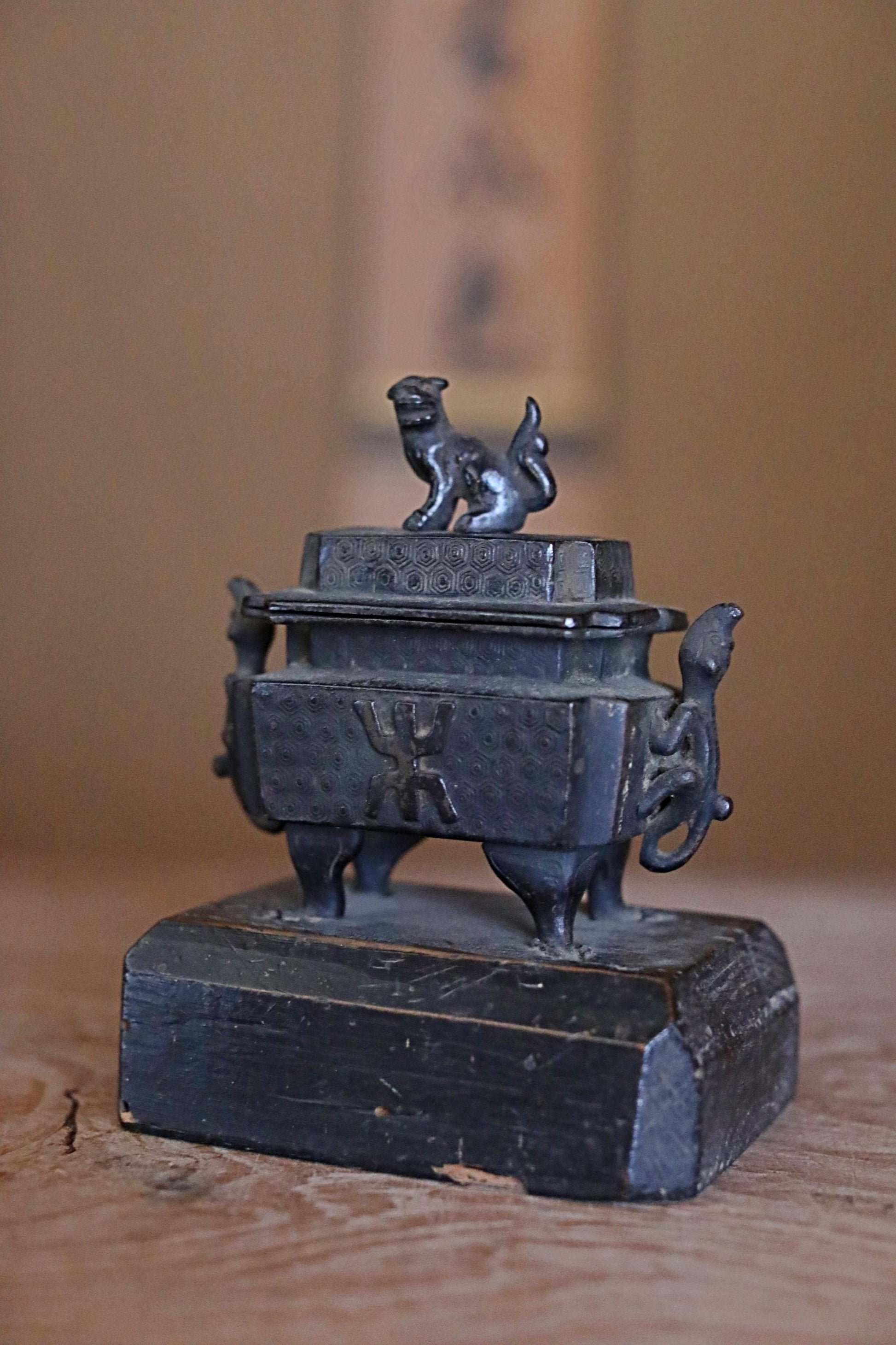 FINE! 1820s Japanese antique Bronze censer Koro shishi for repose of souls buddhist temple with box gecko lizard shogun Incense H6.3in/H16cm