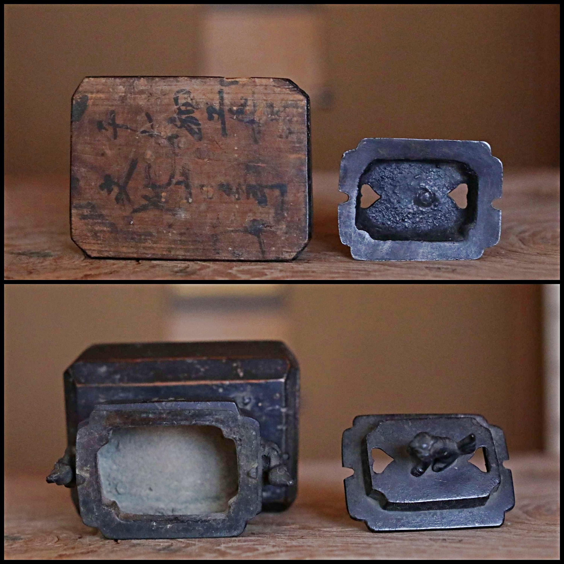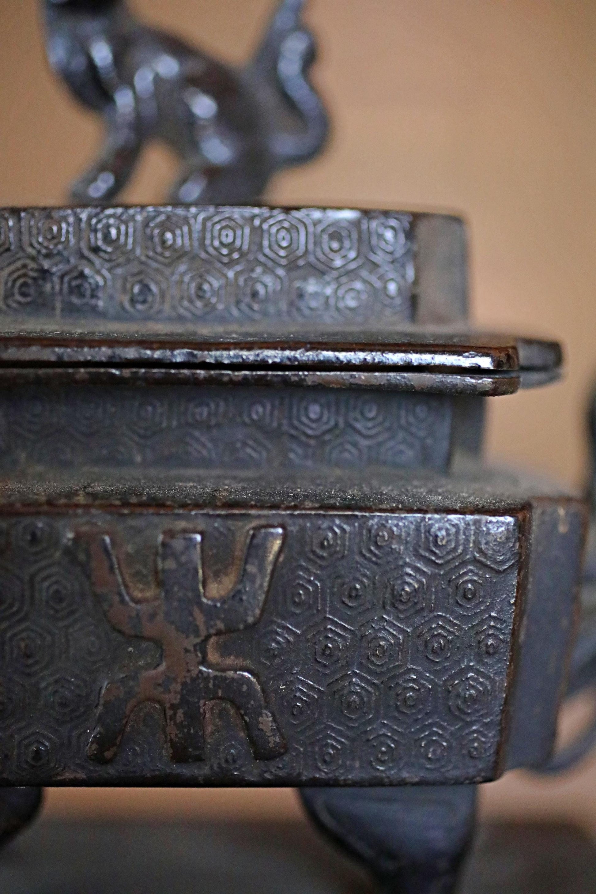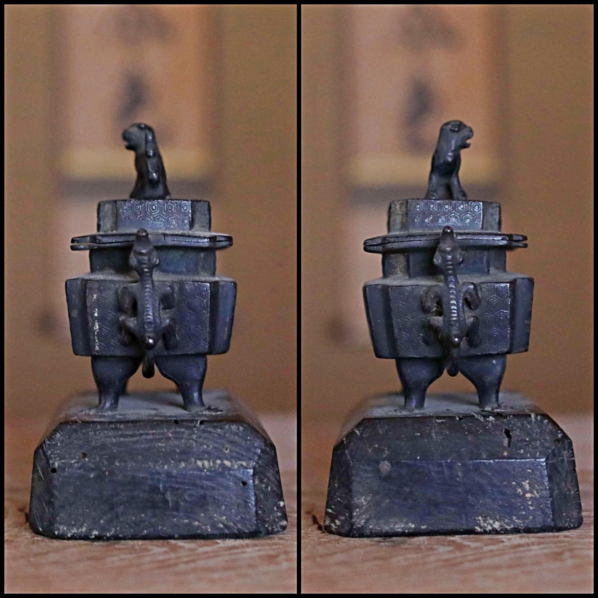 FINE! 1820s Japanese antique Bronze censer Koro shishi for repose of souls buddhist temple with box gecko lizard shogun Incense burner H6.3in/H16cm.