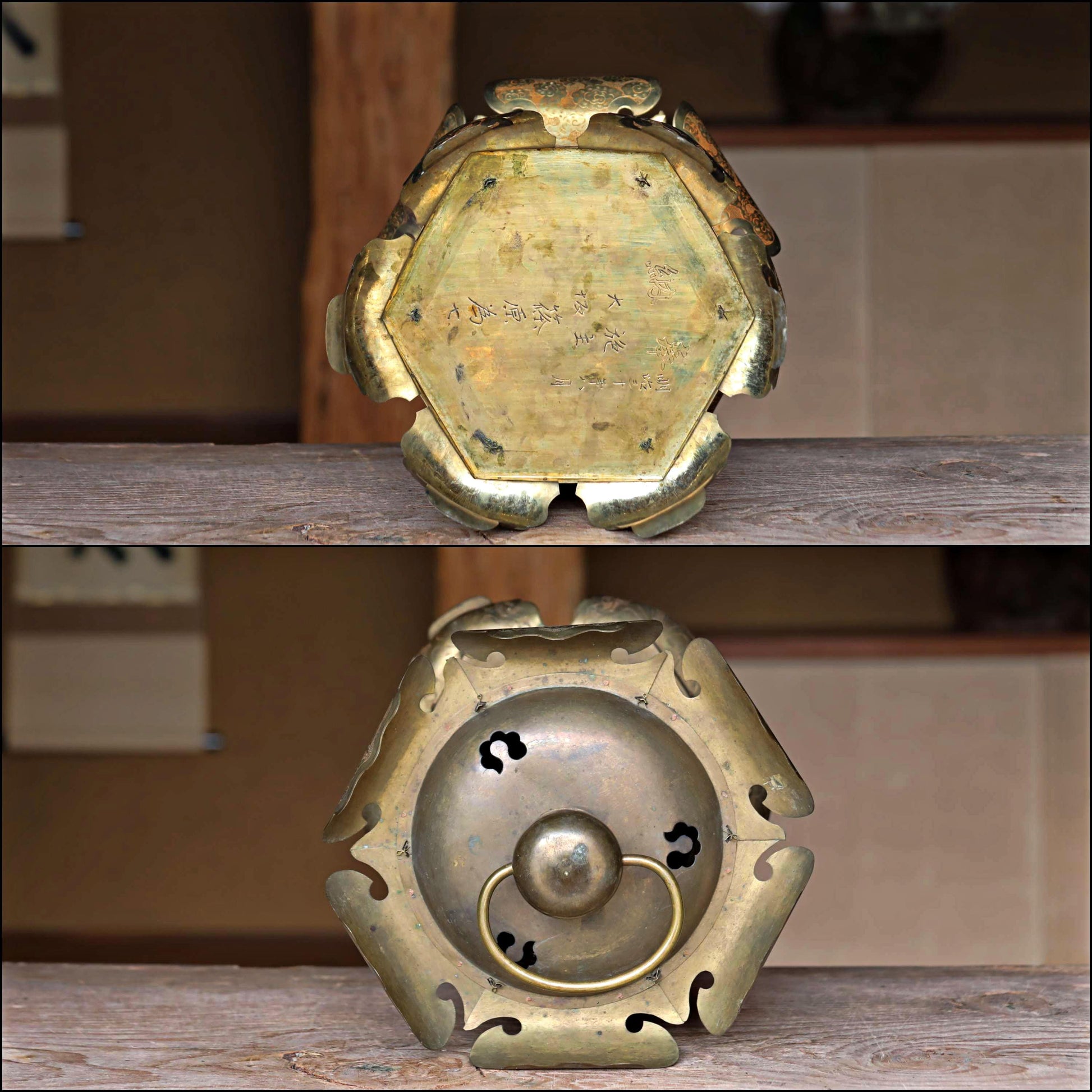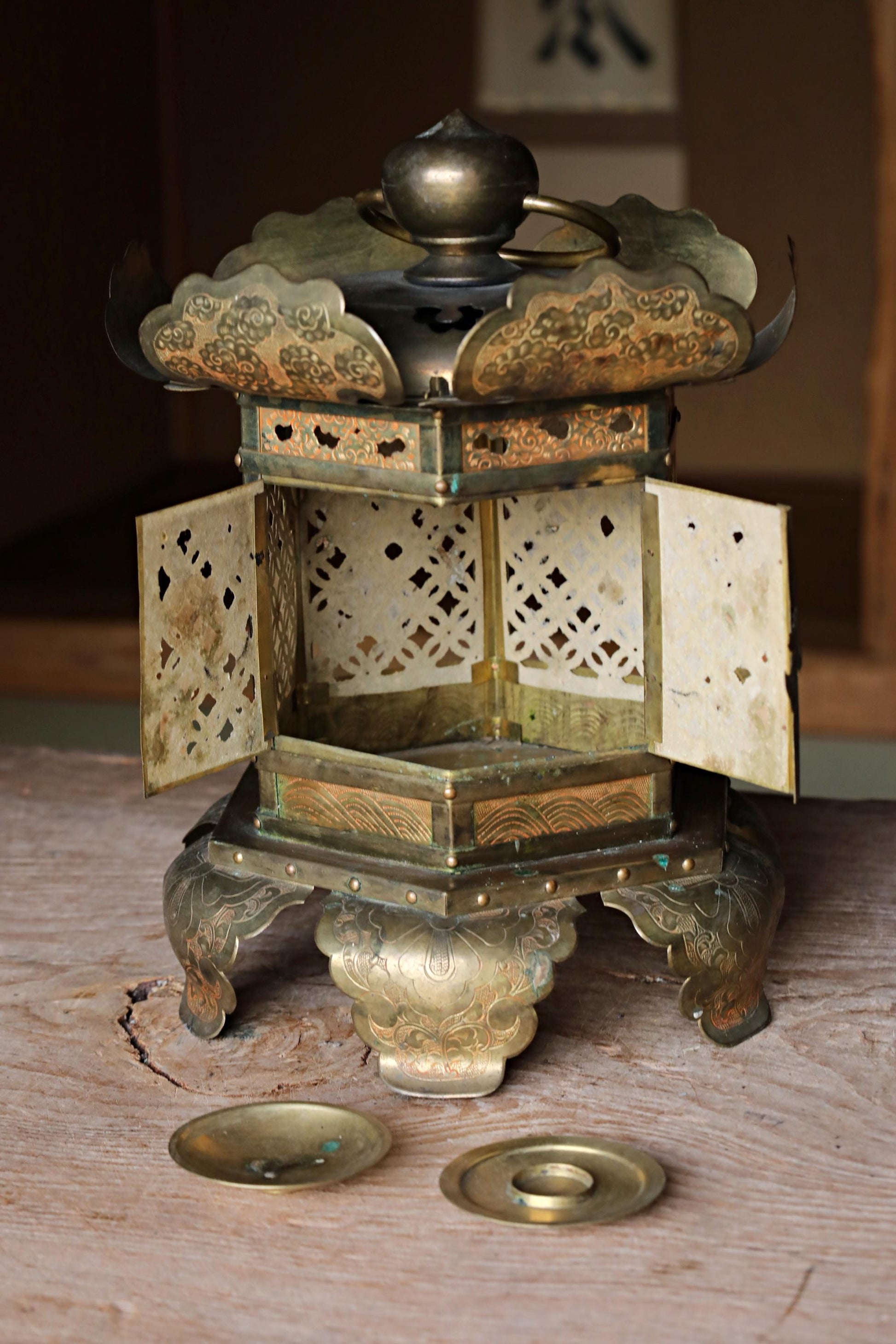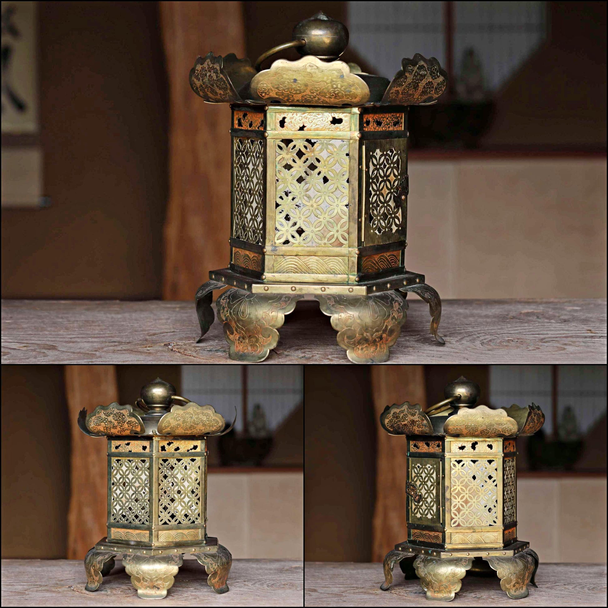 FINE! 1897s Japanese Antiques buddhist hanging lantern gold brass metal hexagonal , lotus design, from Buddhist temple H13.8in/H35cm