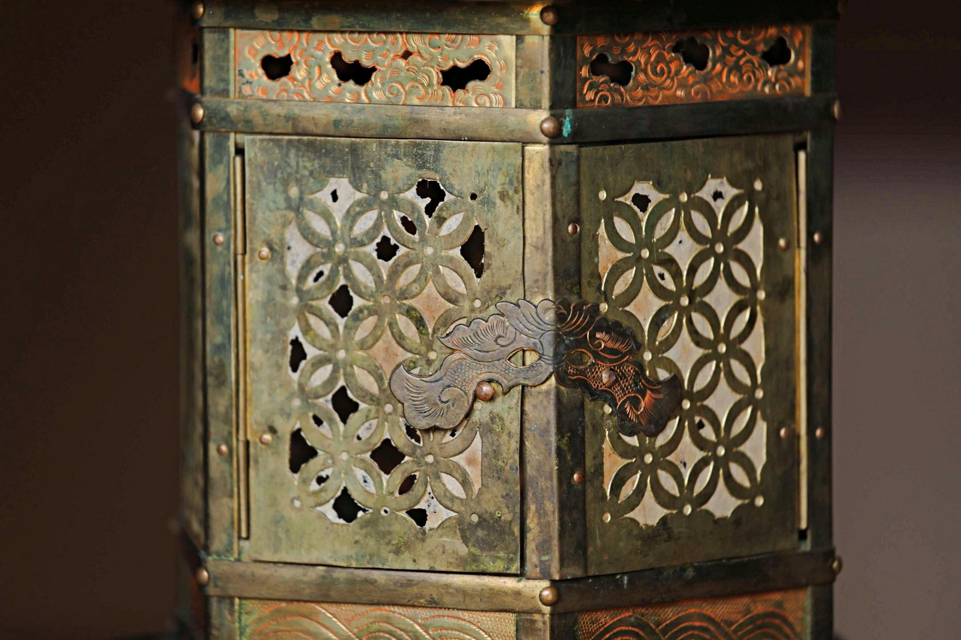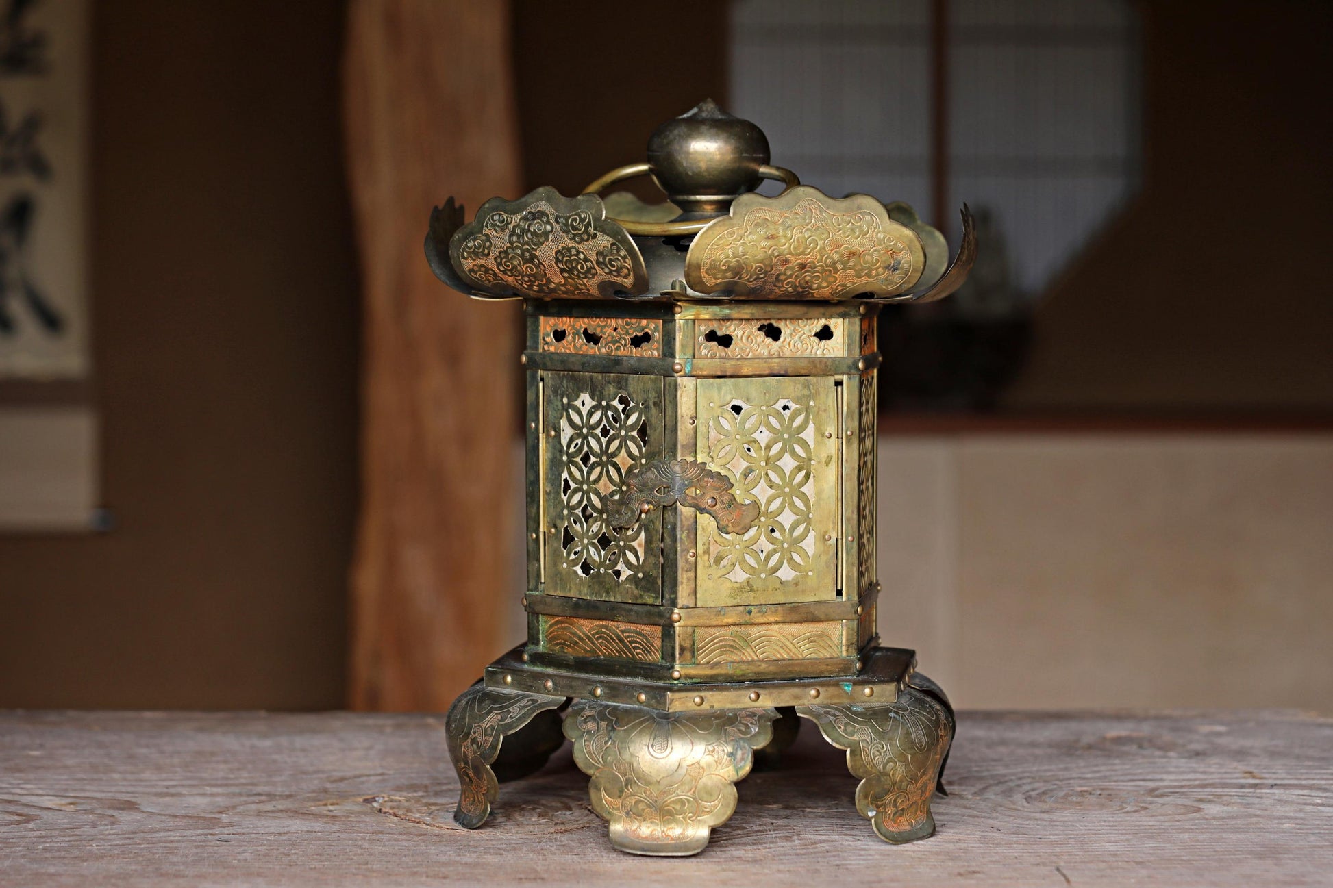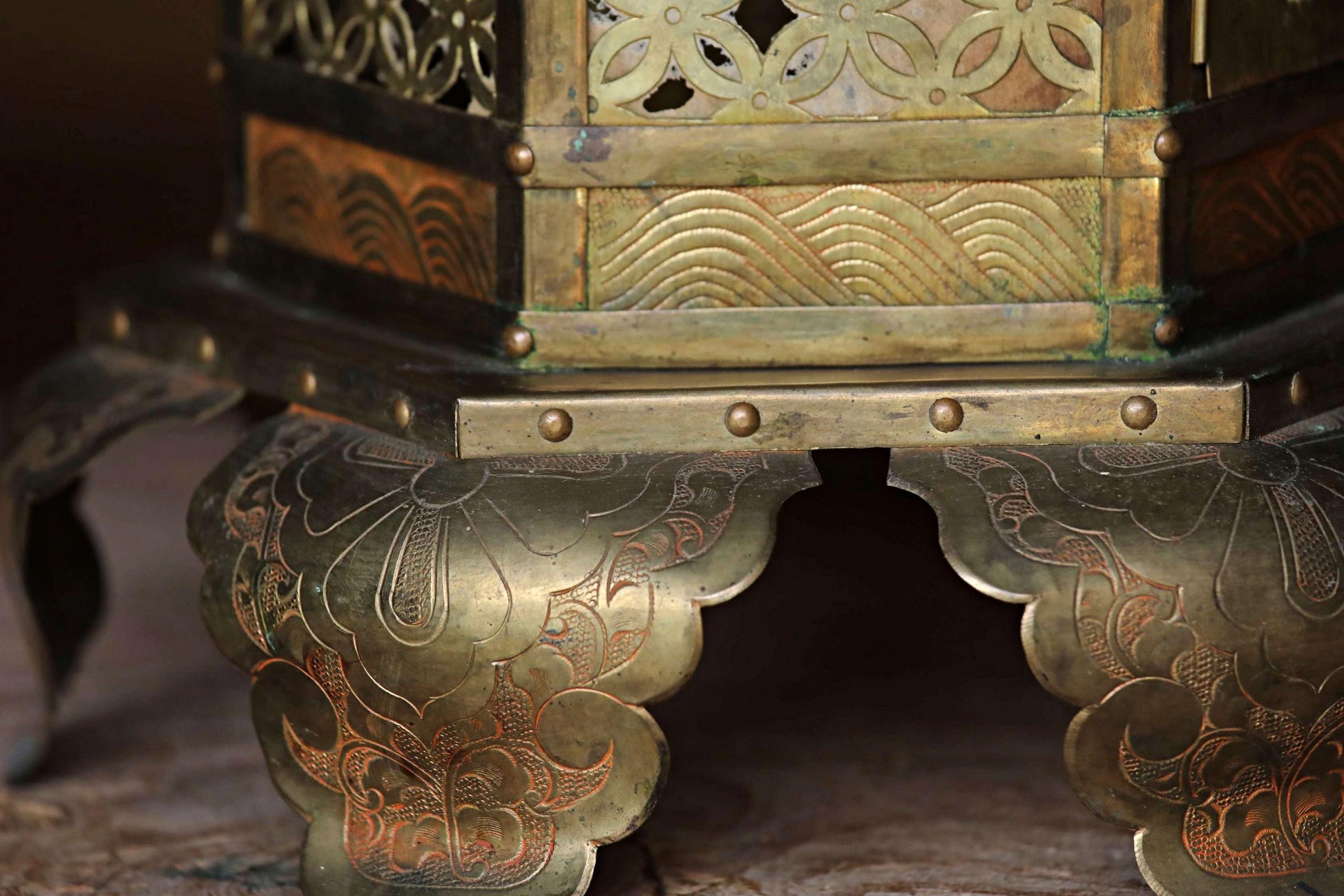FINE! 1897s Japanese Antiques buddhist hanging lantern gold brass metal hexagonal , lotus design, from Buddhist temple H13.8in/H35cm
