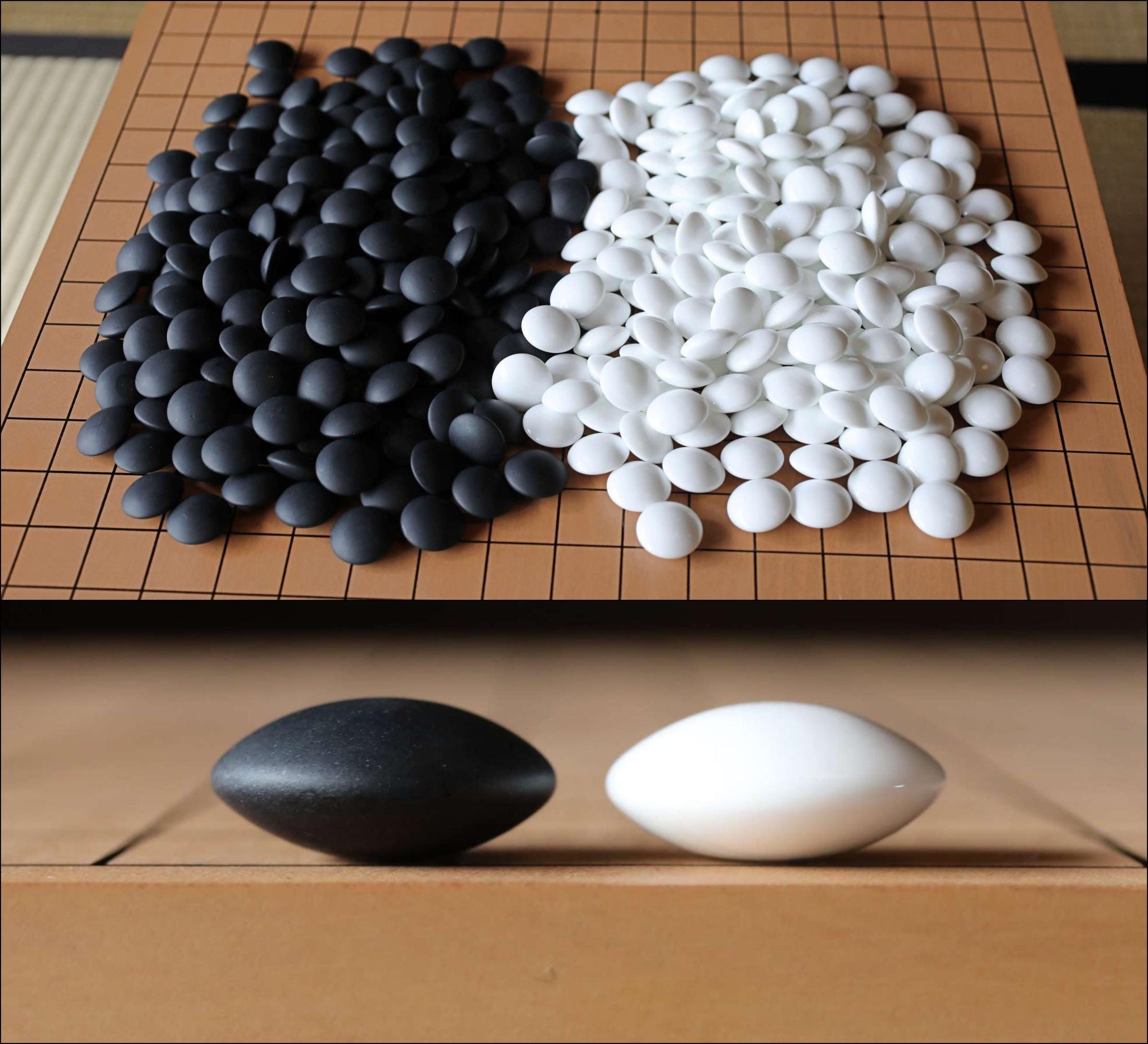 The black go stones are made of a stone called Nachiguro and the white ones are made of glass. All 180 white stones and 181 black stones are present. Thick and beautiful stone.