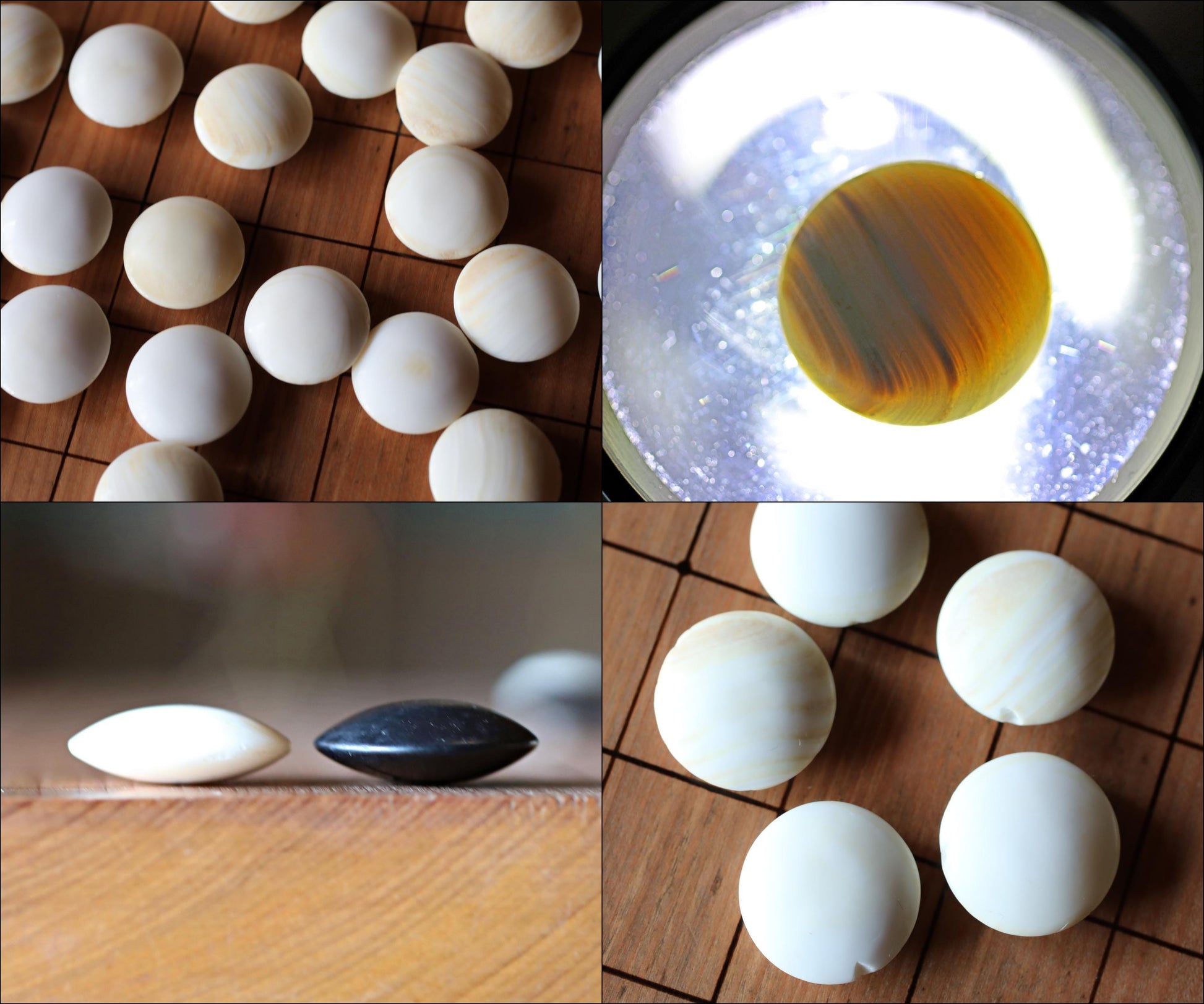 This set is a luxury item. This is because the stones are made of natural clam shells and are set in beautiful condition. There are just a little less than 10 tiny chips, but these clam go stones are very valuable and expensive for the go stones alone. The set includes 175 white stones and 181 black stones.