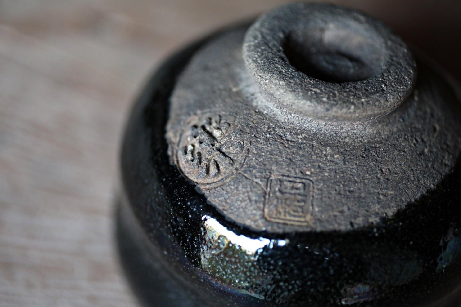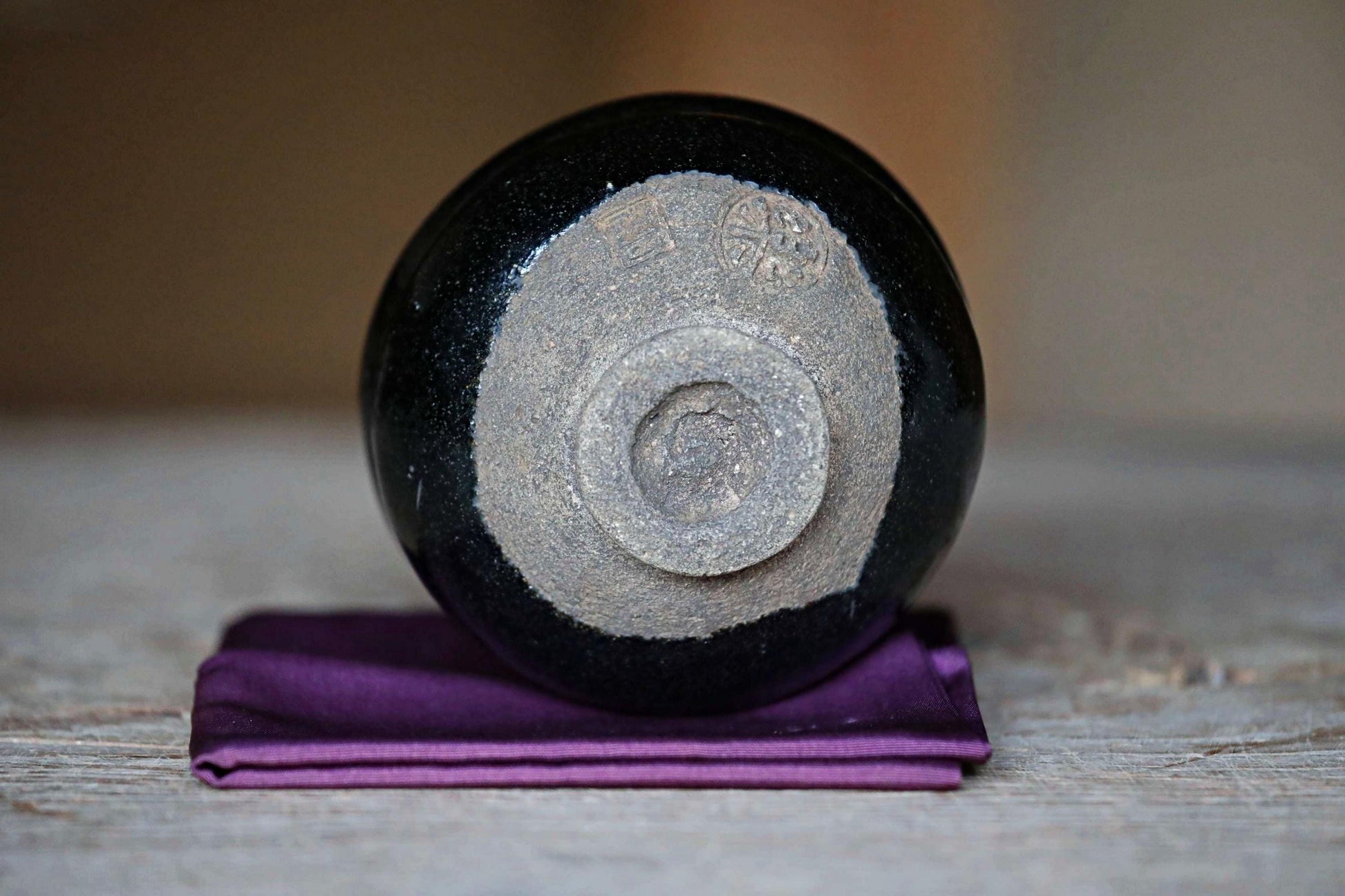 This black Raku teacup offers the interest of hand-twisting. It is called 黒楽Kuro Raku, a style of tea bowl loved by 利休Rikyu. It is handmade by Ishiharu Kato who had a kiln in Nagoya. There is a Kanji character mark and signature on the back side.