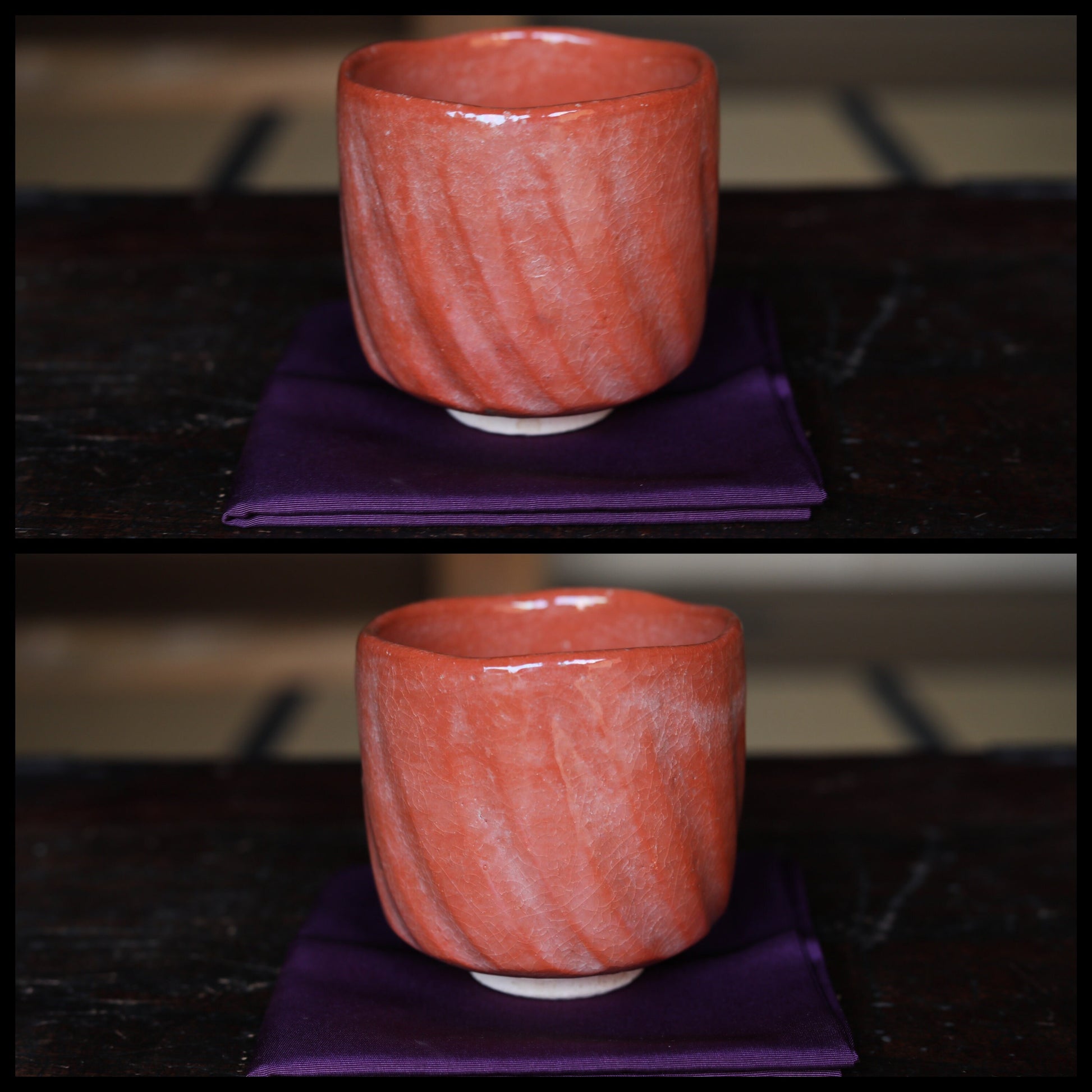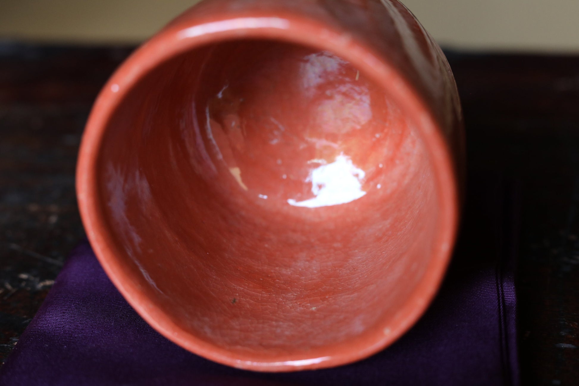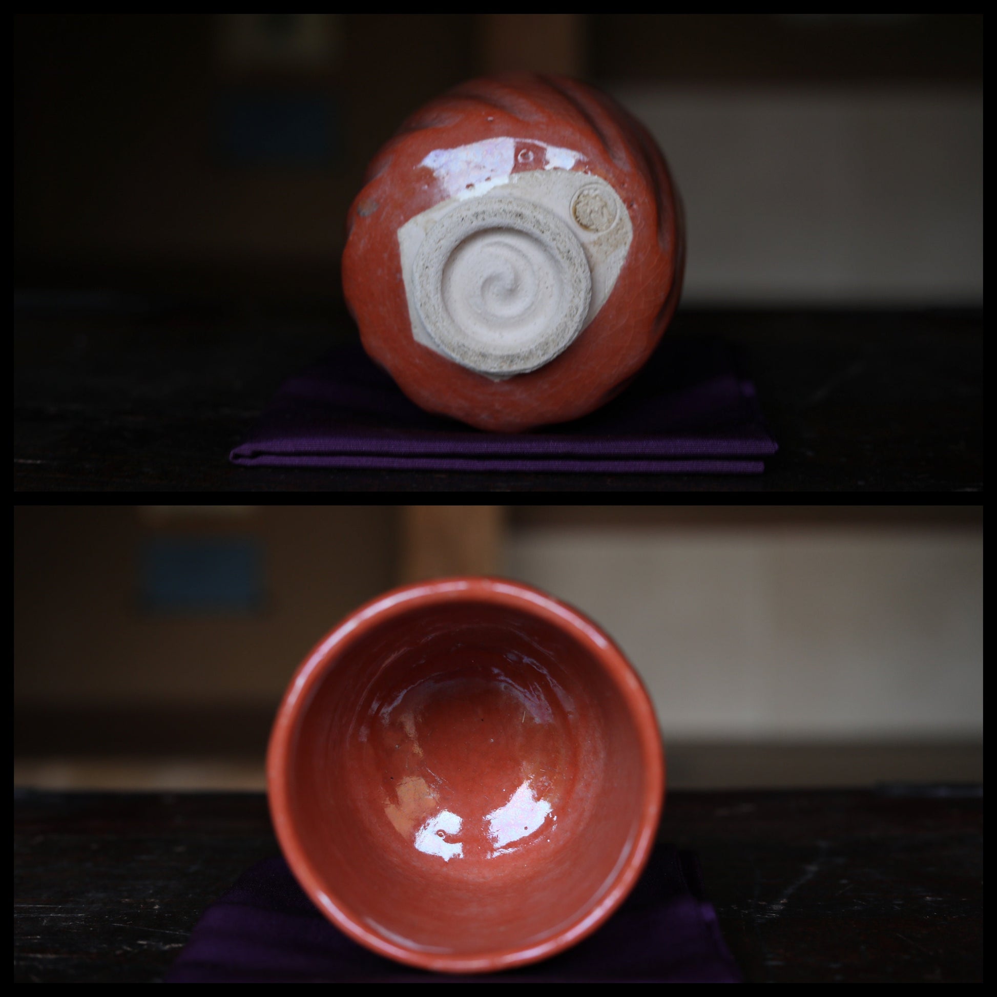 The name is called 赤楽Aka-raku, which is made by applying iron oxide clay to the bare clay to give it a red color and then firing it with a transparent glaze (Uwagusuri).