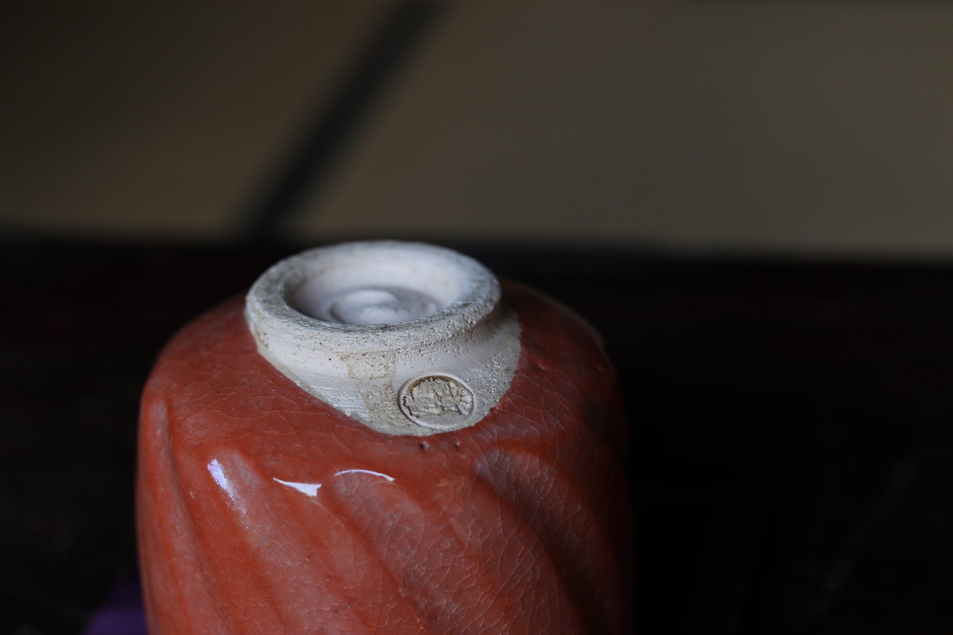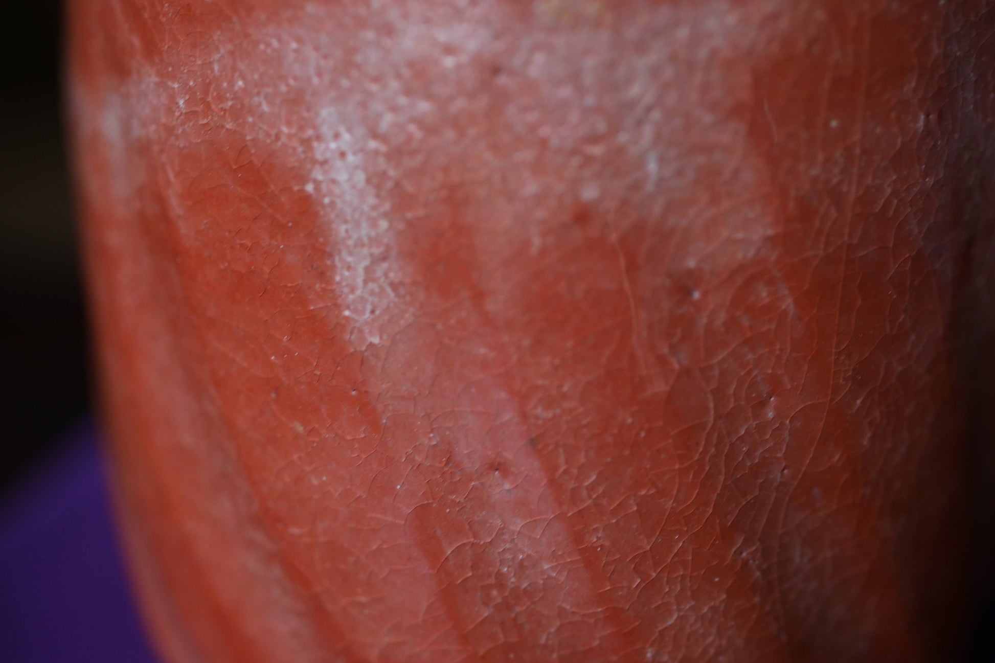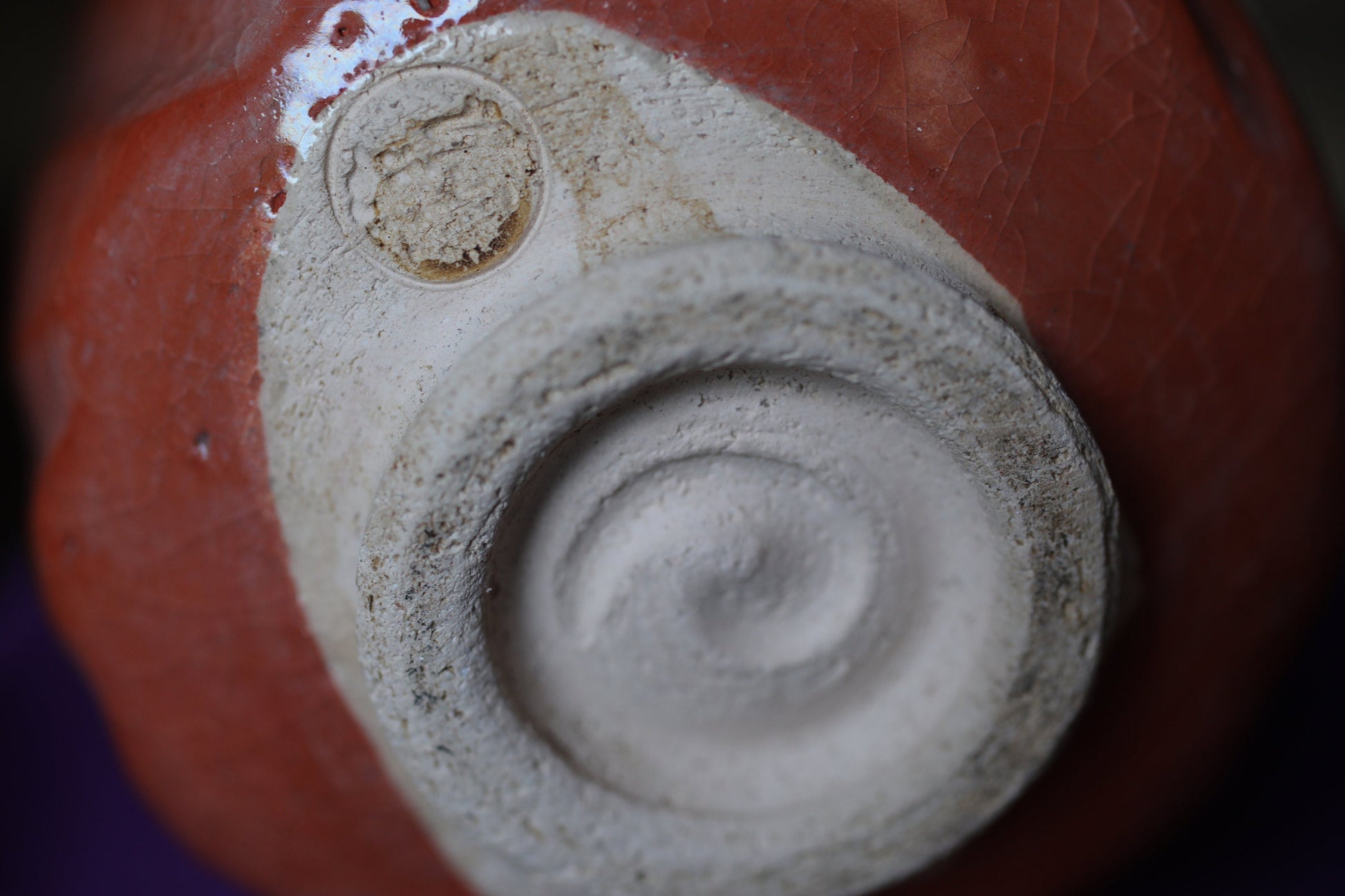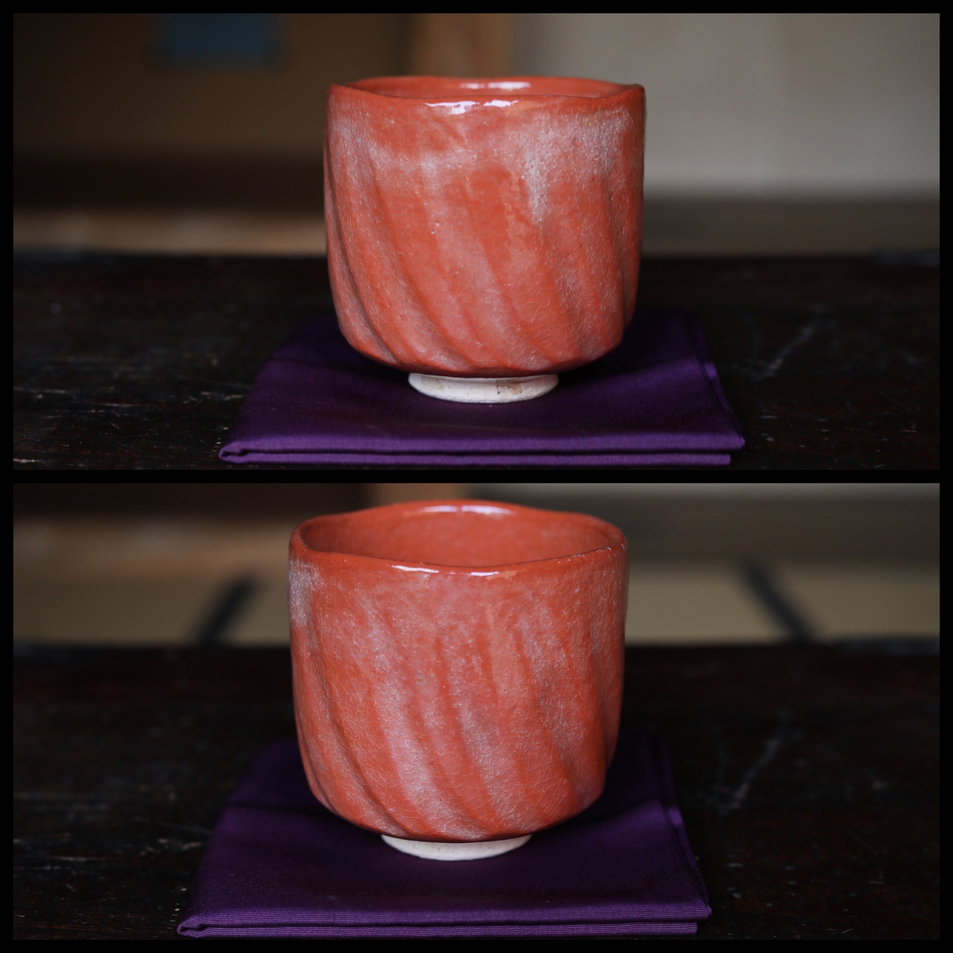 The name is called 赤楽Aka-raku, which is made by applying iron oxide clay to the bare clay to give it a red color and then firing it with a transparent glaze (Uwagusuri).