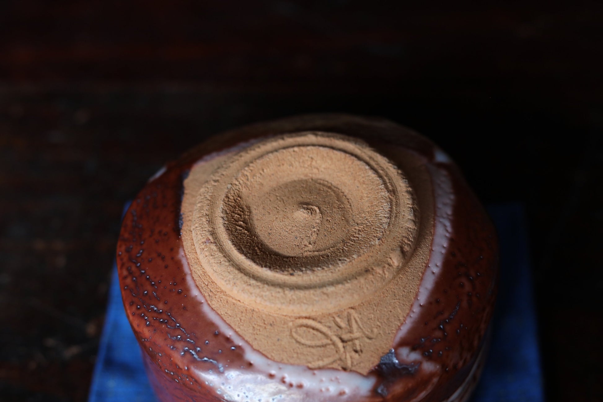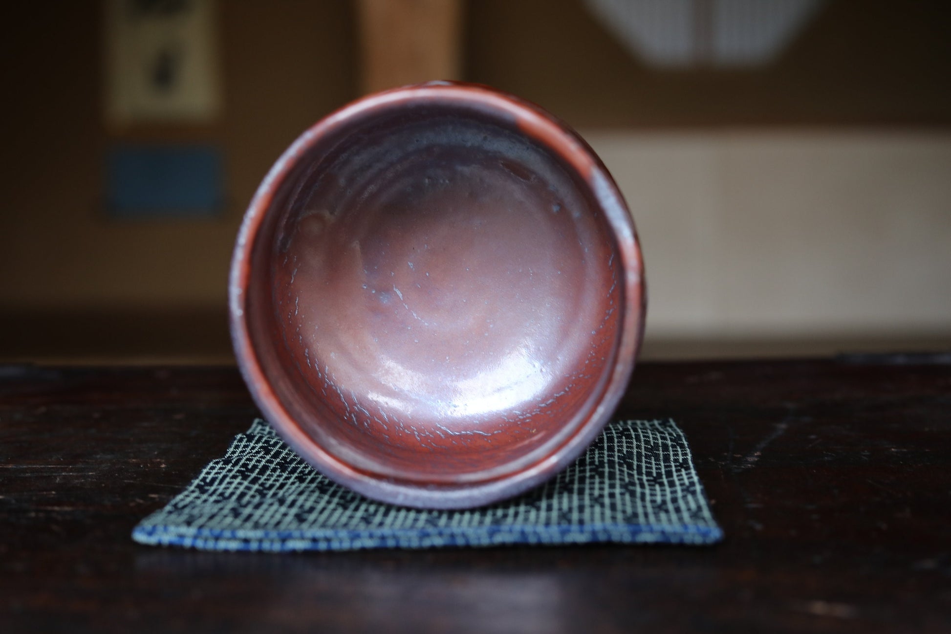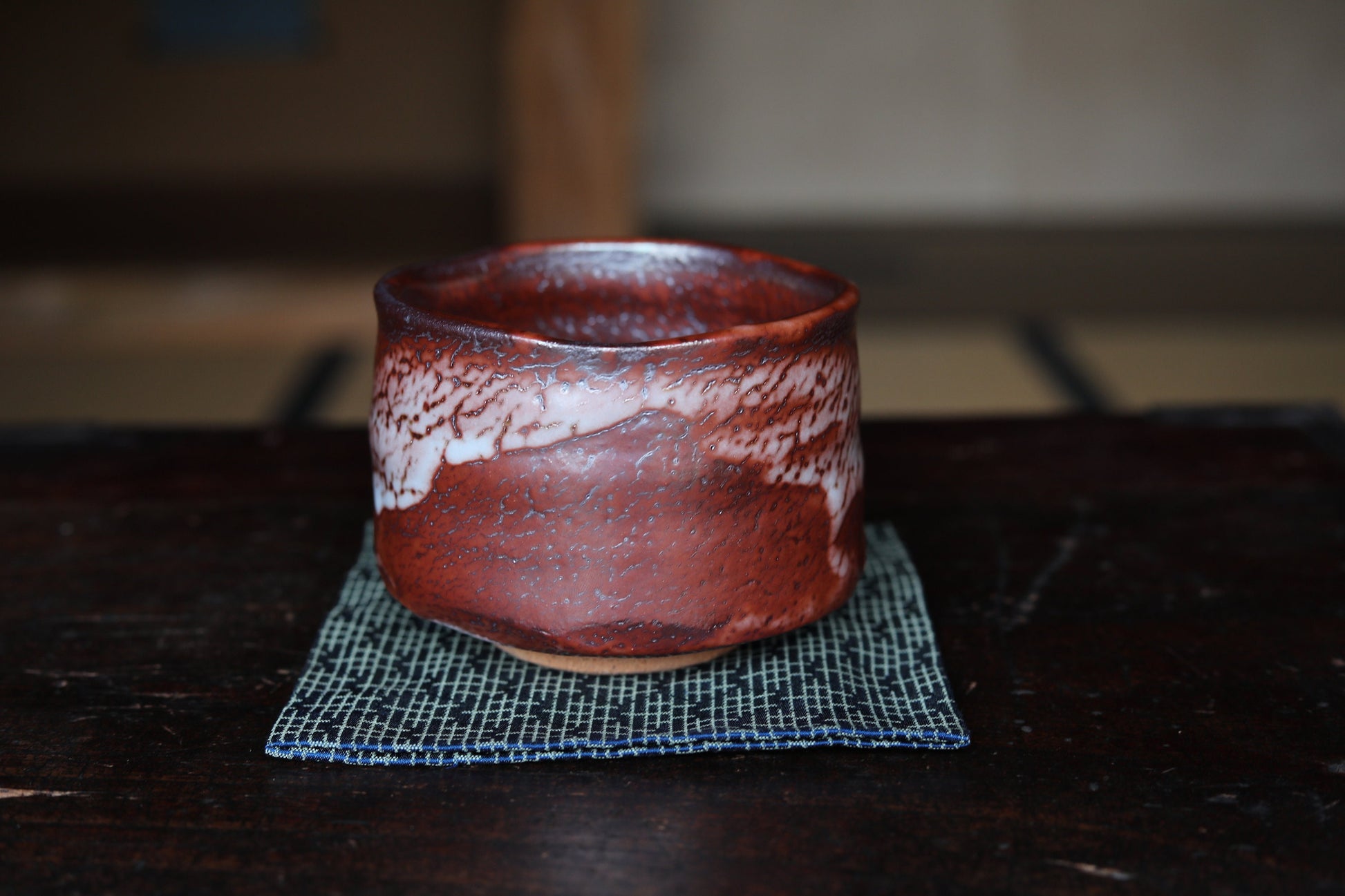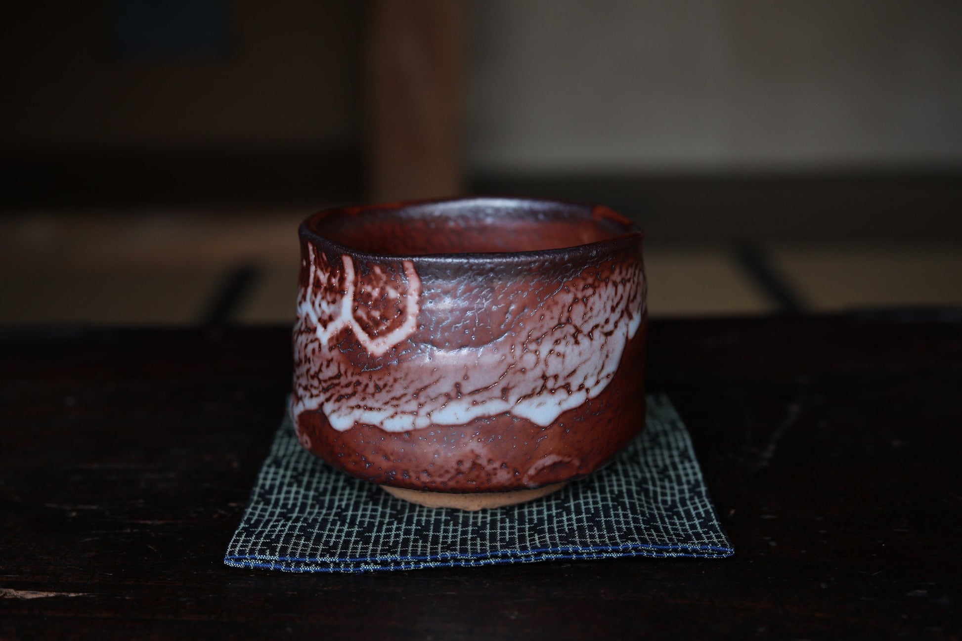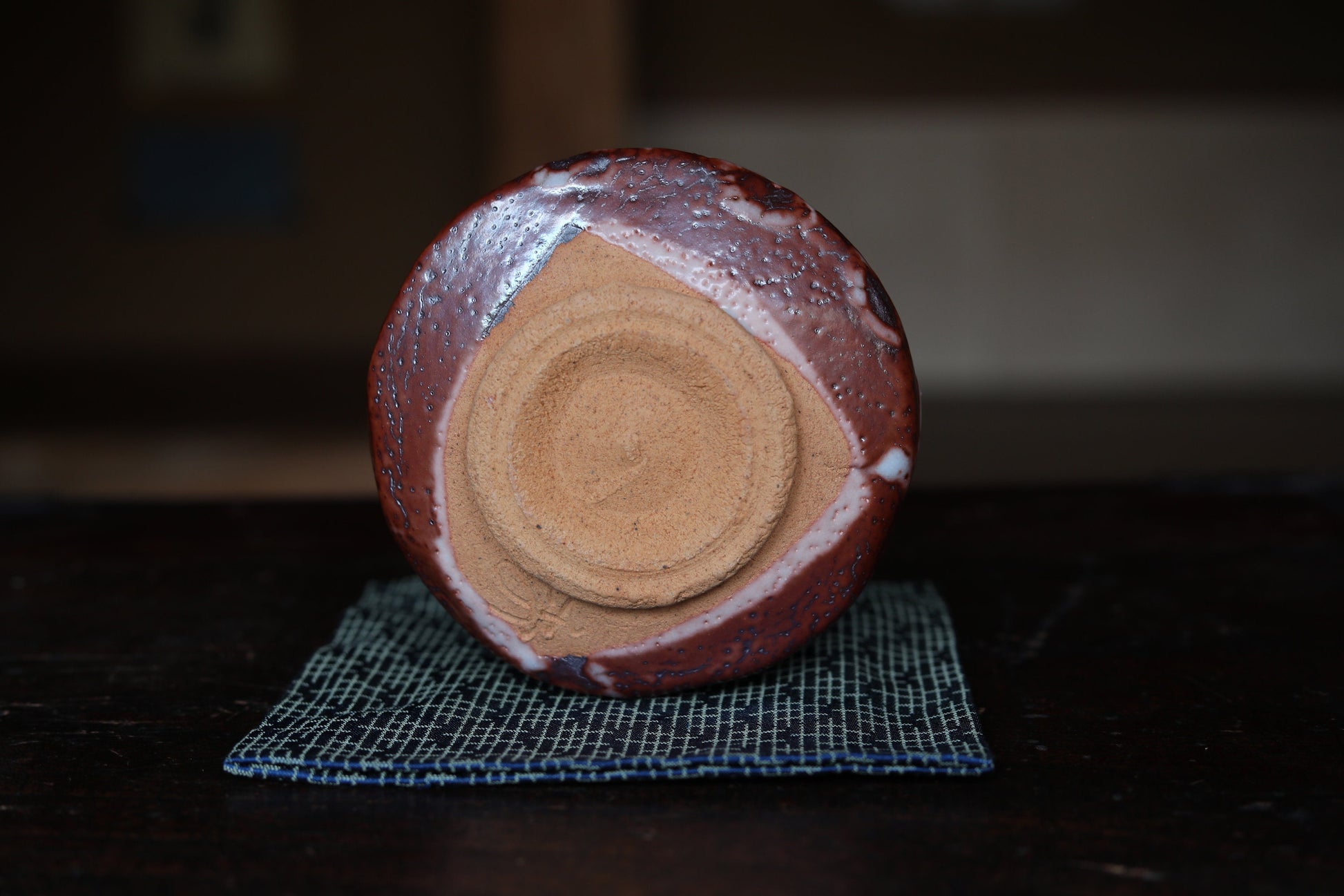 This Shino ware is a type of Shino ware called 赤志野Akashino. The base is coated with iron mud and then fired with a feldspar glaze to give it a light red color and a warm, soft feel.