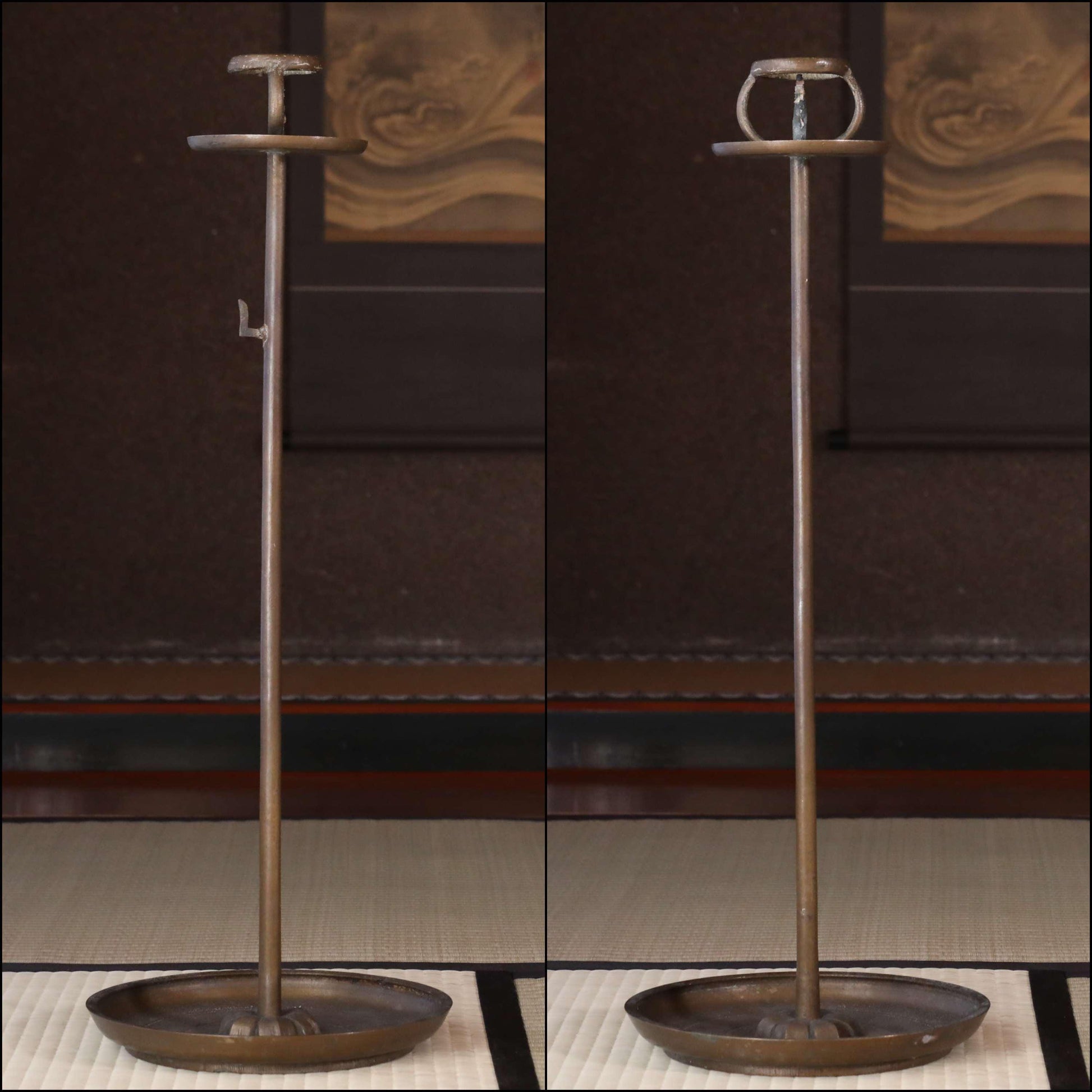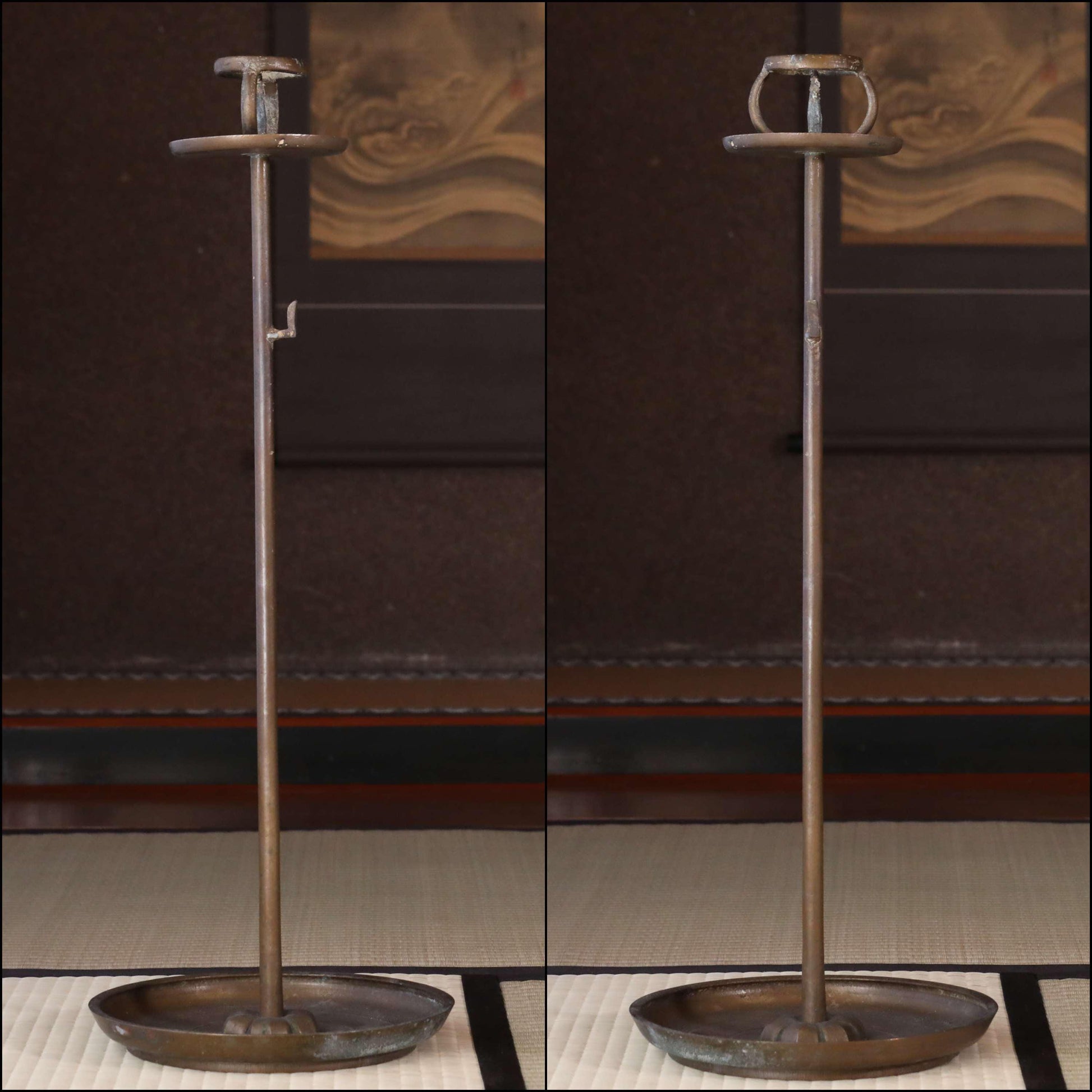 FINE! Japan Antique 1870s bronze candle stand tall Candlestick metal Lantern Shokudai hand craft SAMURAI Buddhist temple Edo H27.2in/H69cm