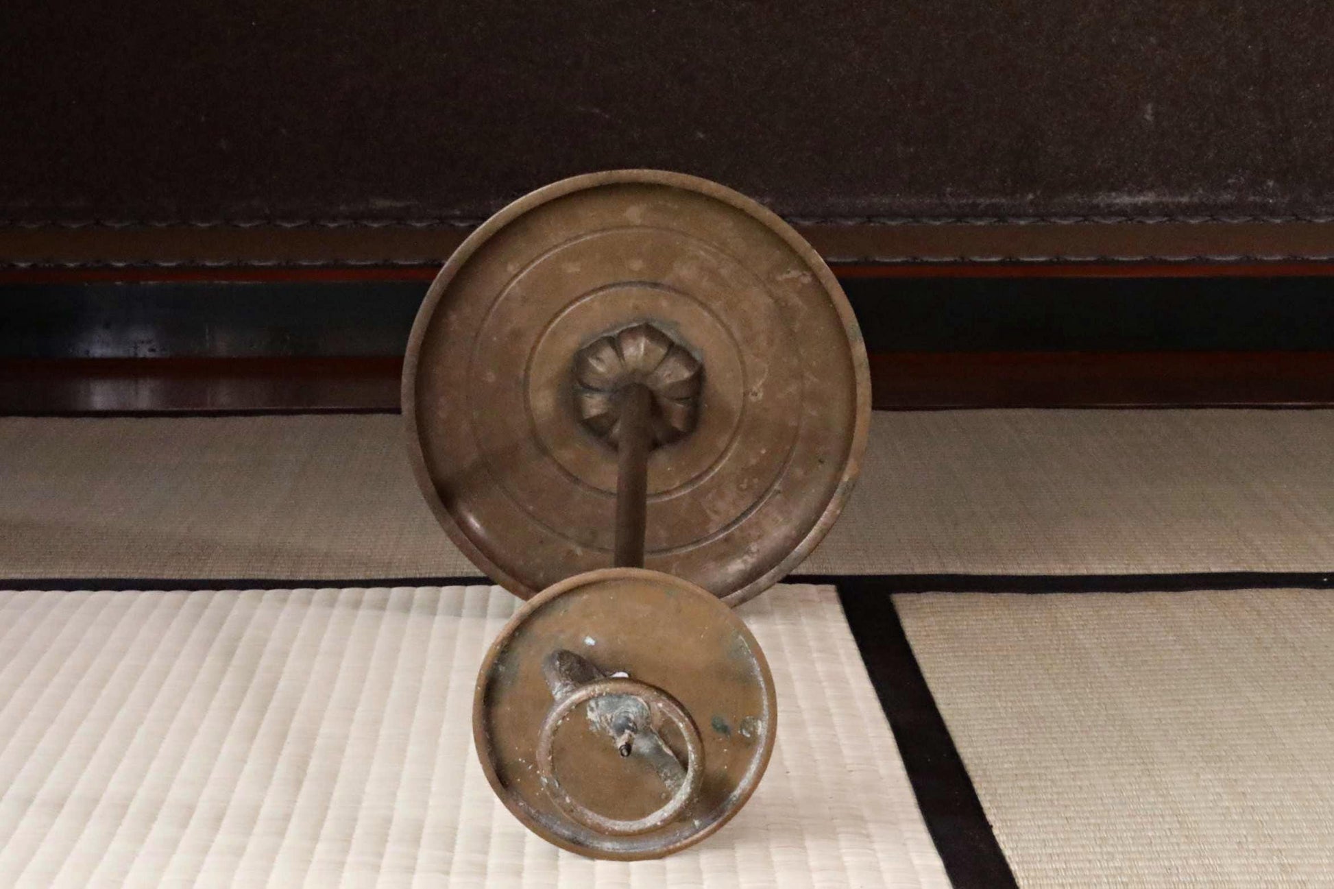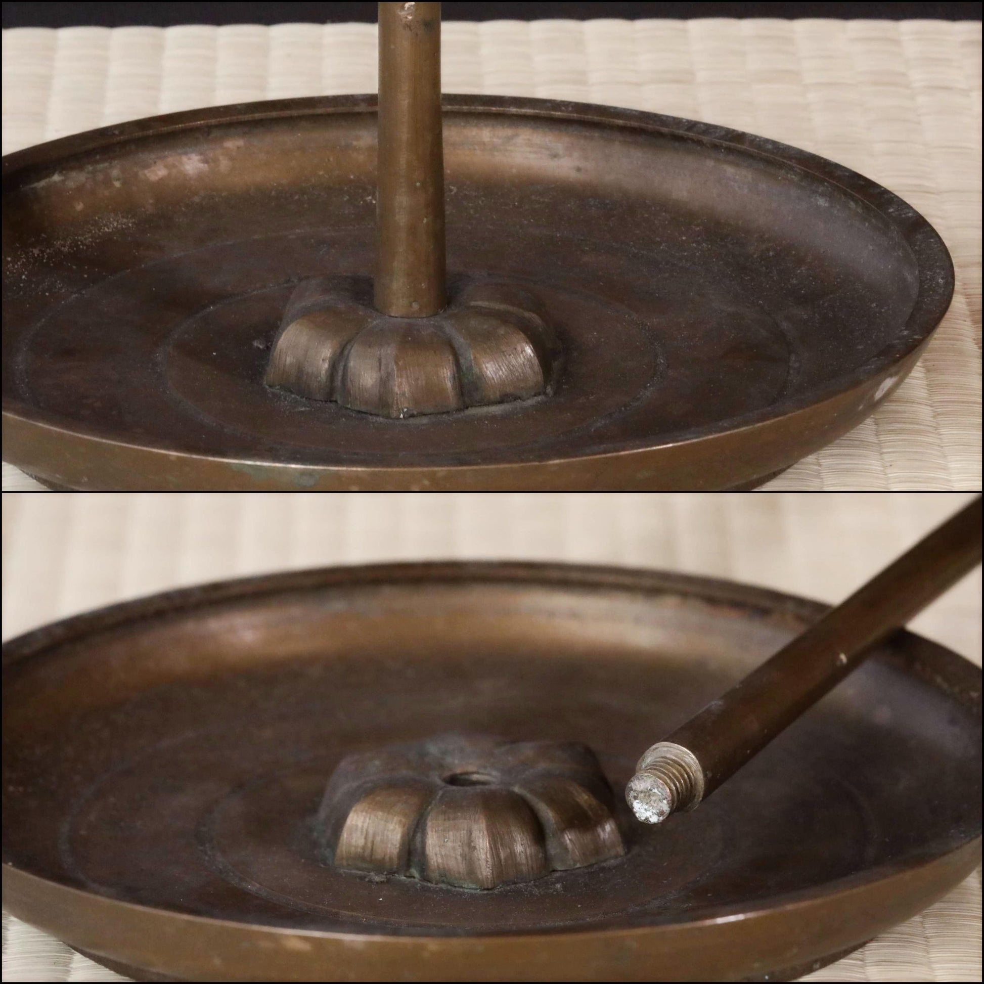 The entire candelabra is made of bronze. It was made in the 3rd year of Meiji era. It is very solid and sturdy. The insert is screwed so there is no wobble and it is very stable. The insert is beautifully designed like a flower.