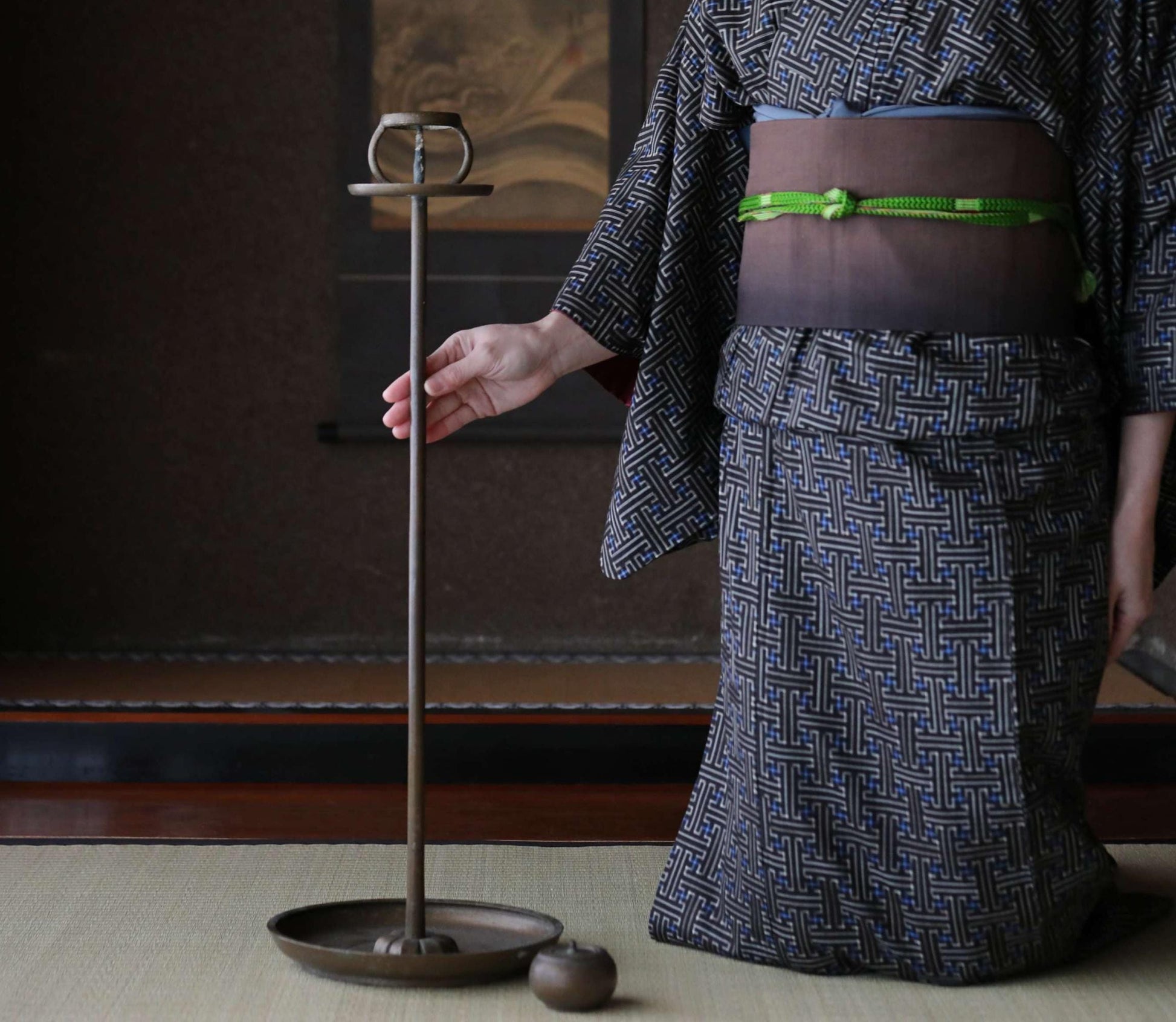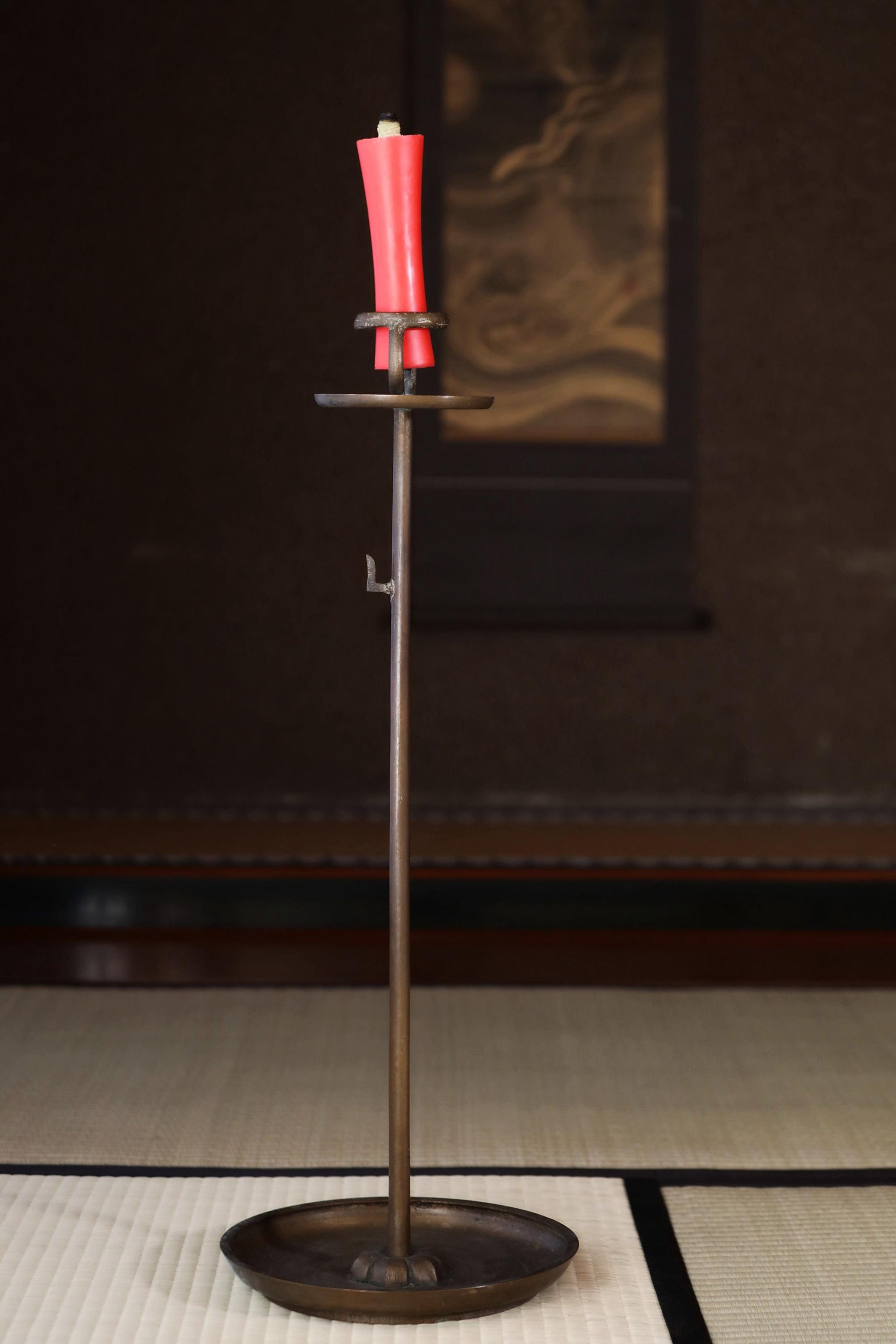 FINE! Japan Antique 1890s bronze candle stand tall Candlestick metal Lantern Shokudai hand craft SAMURAI Buddhist temple Edo H27.2in/H69cm.