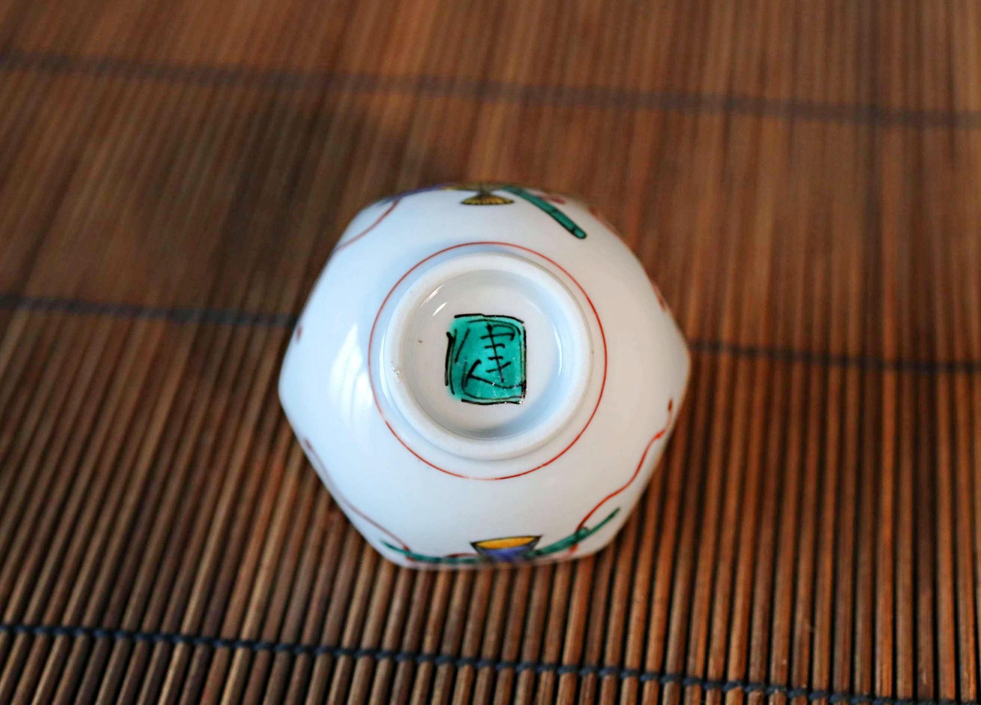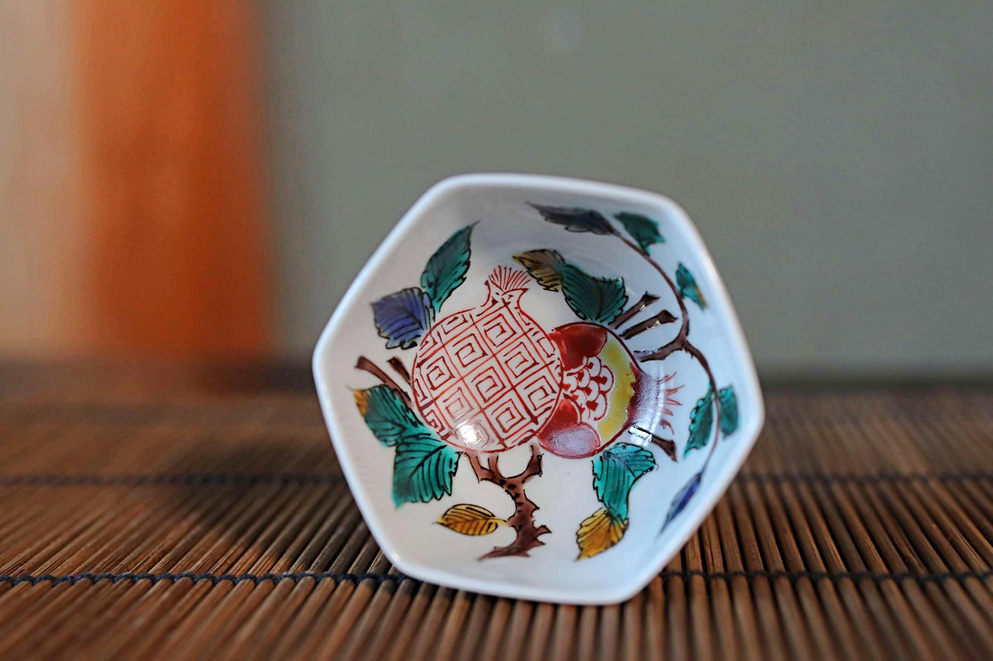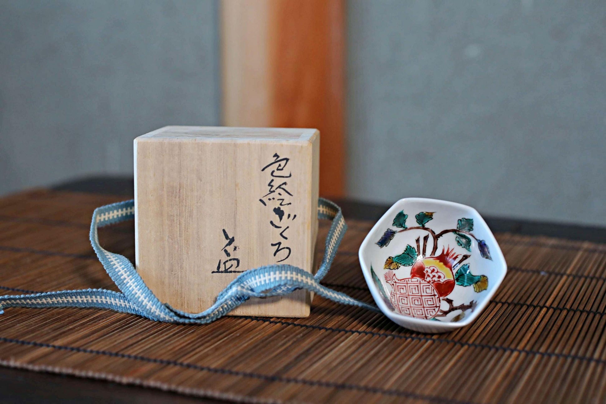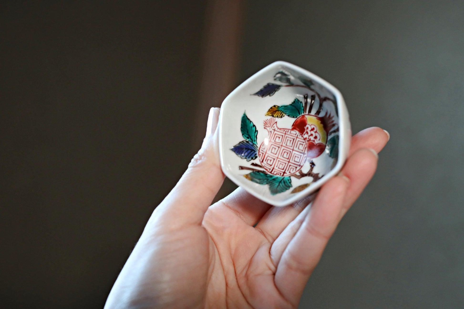 Japanese vintage 九谷 kutani ware Sake Cup with flowers pomegranate porcelain cup beautiful hand painting sign wooden box For GIFT 2.4in/6cm.
