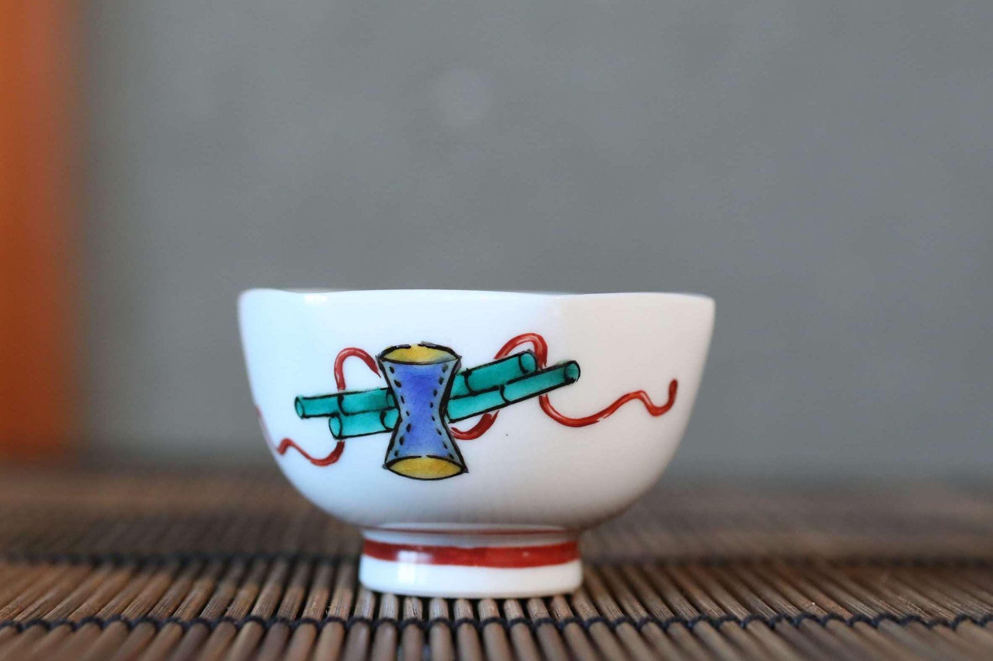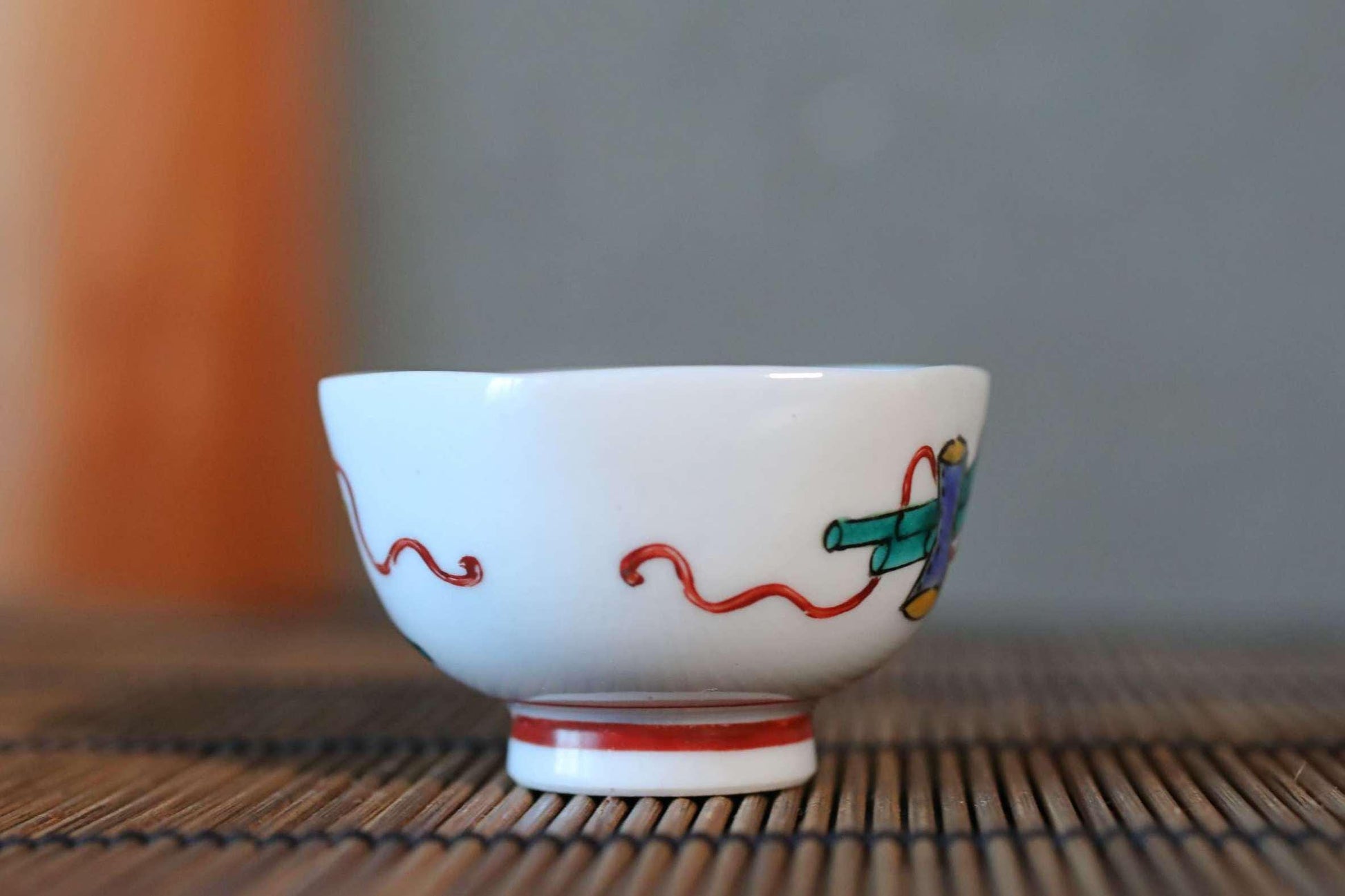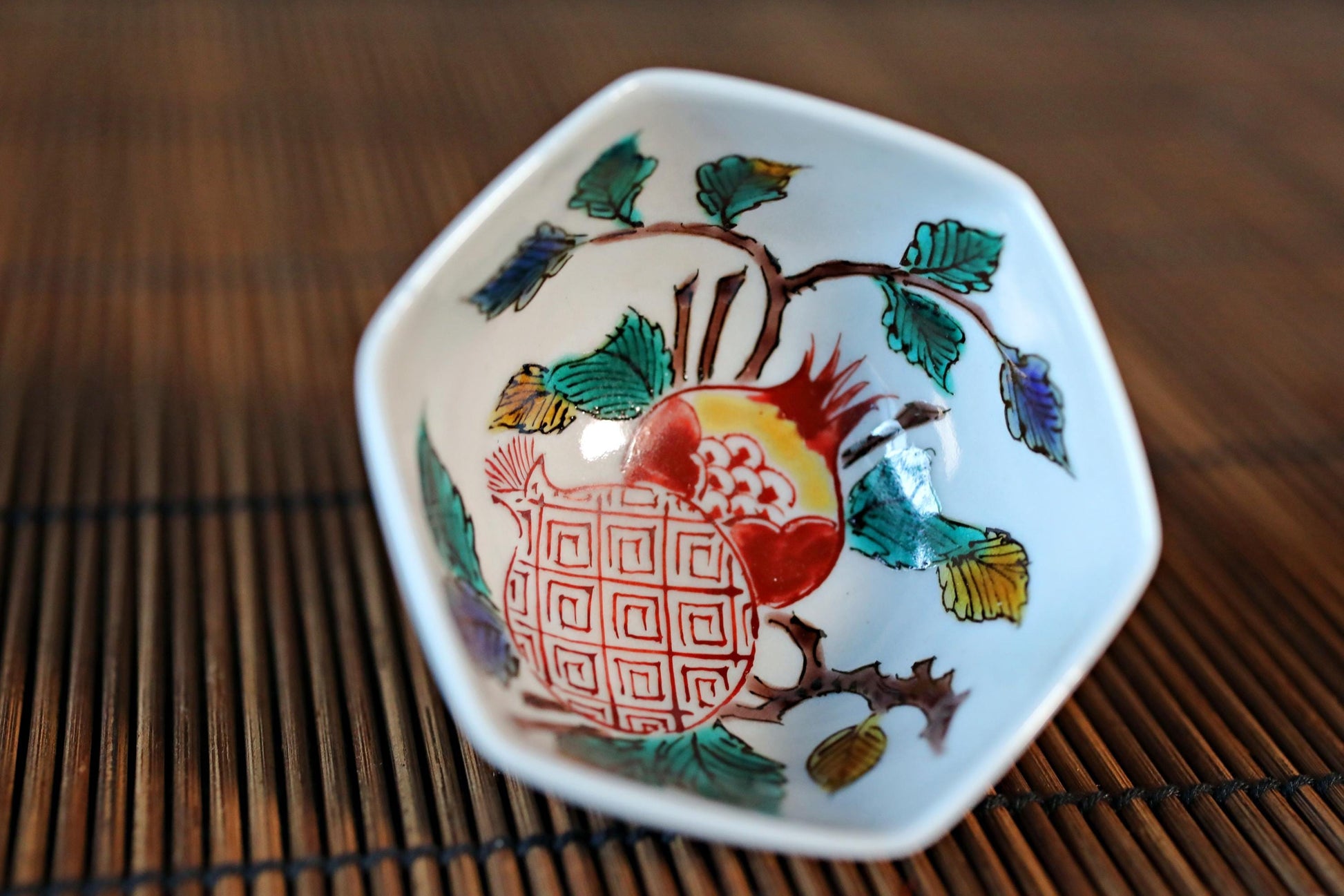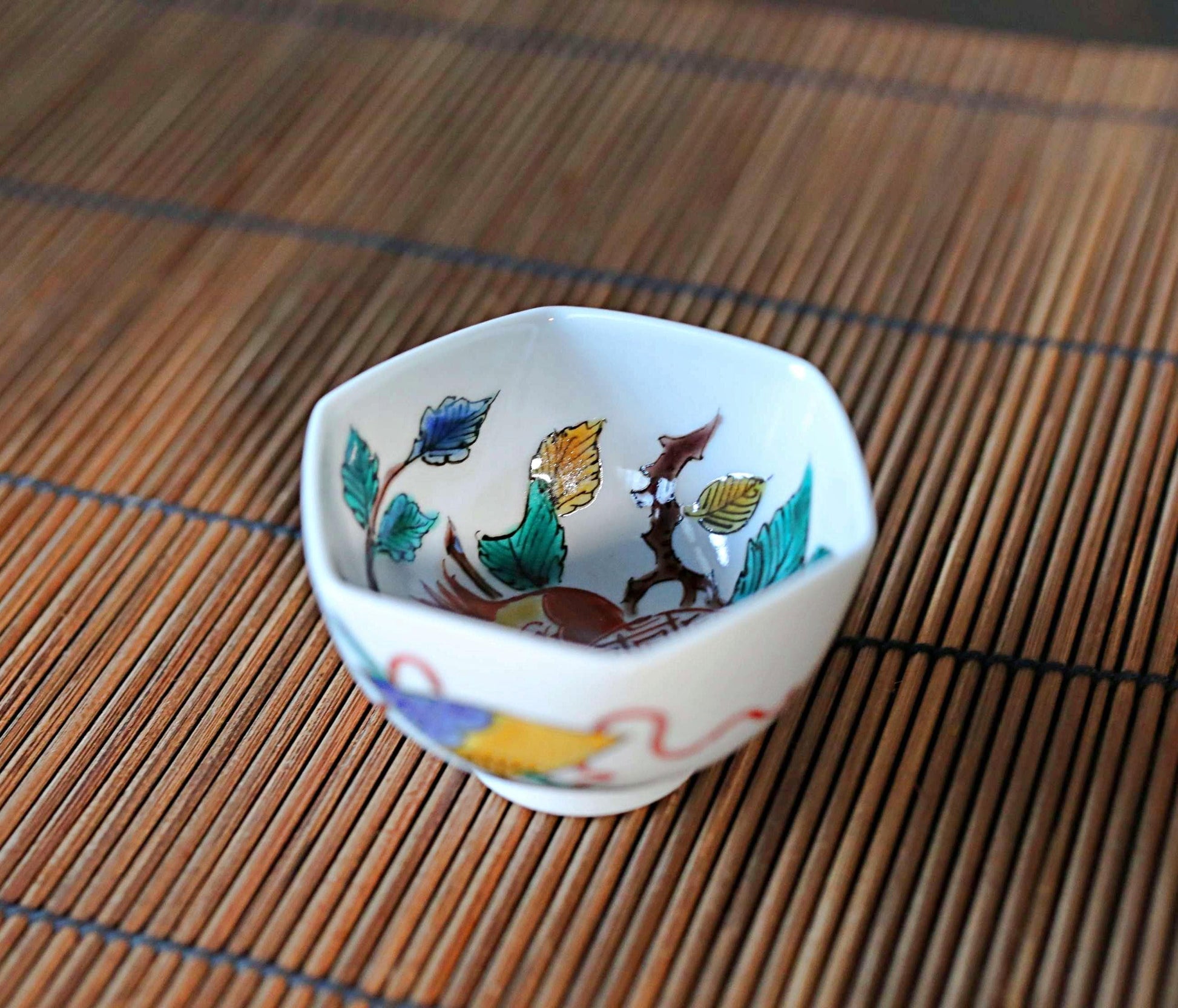 Japanese vintage 九谷 kutani ware Sake Cup with flowers pomegranate porcelain cup beautiful hand painting sign wooden box For GIFT 2.4in/6cm.