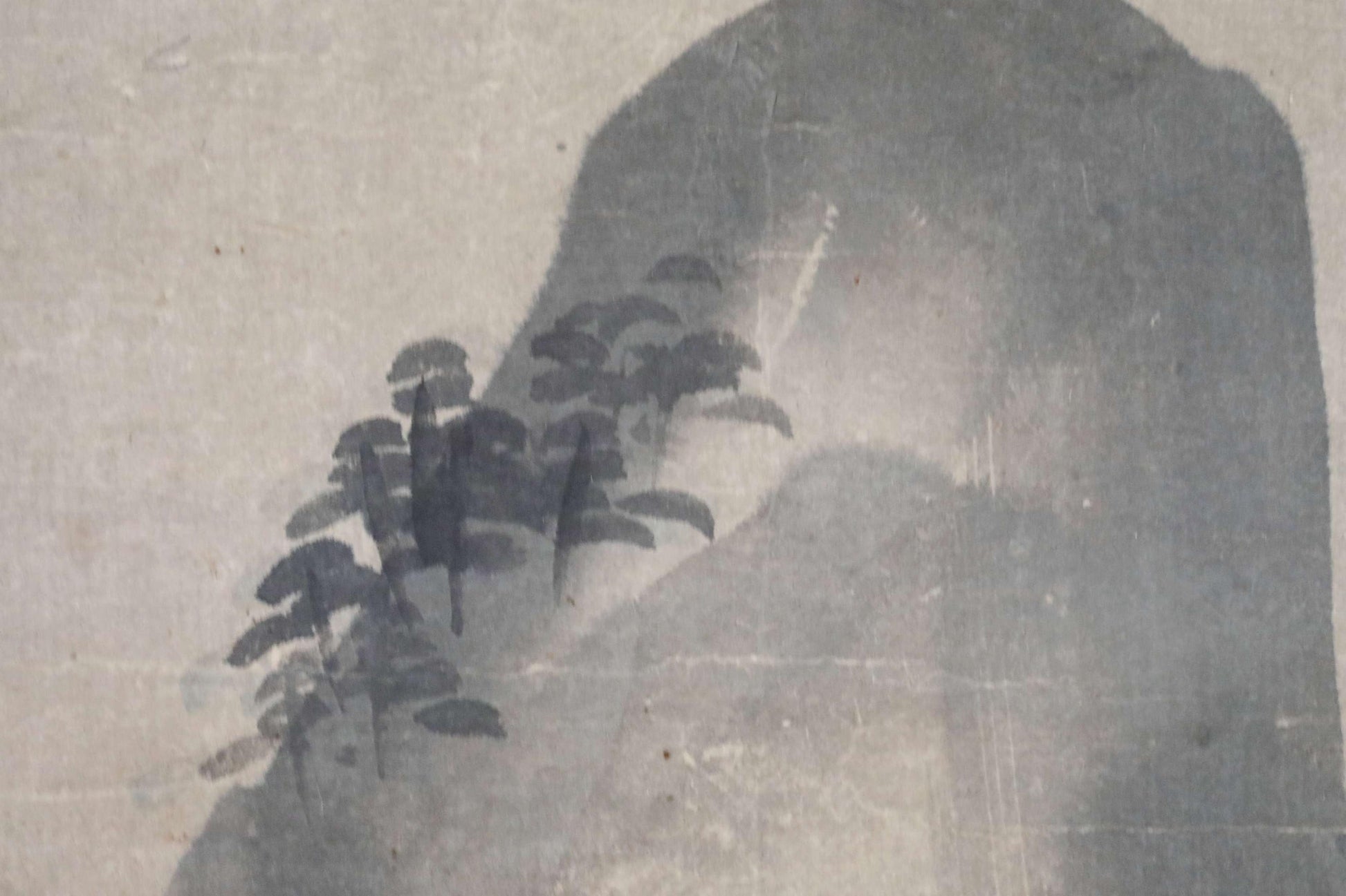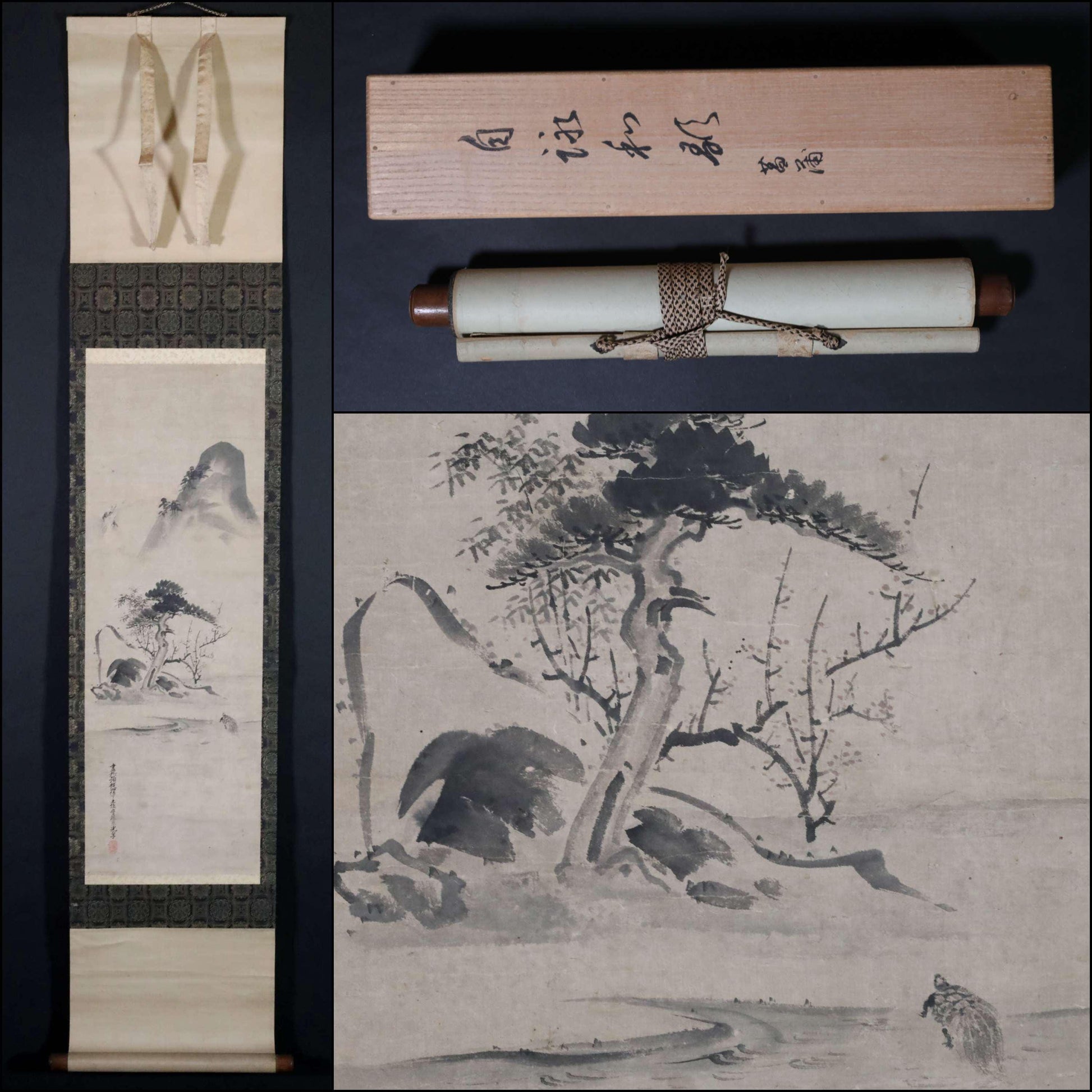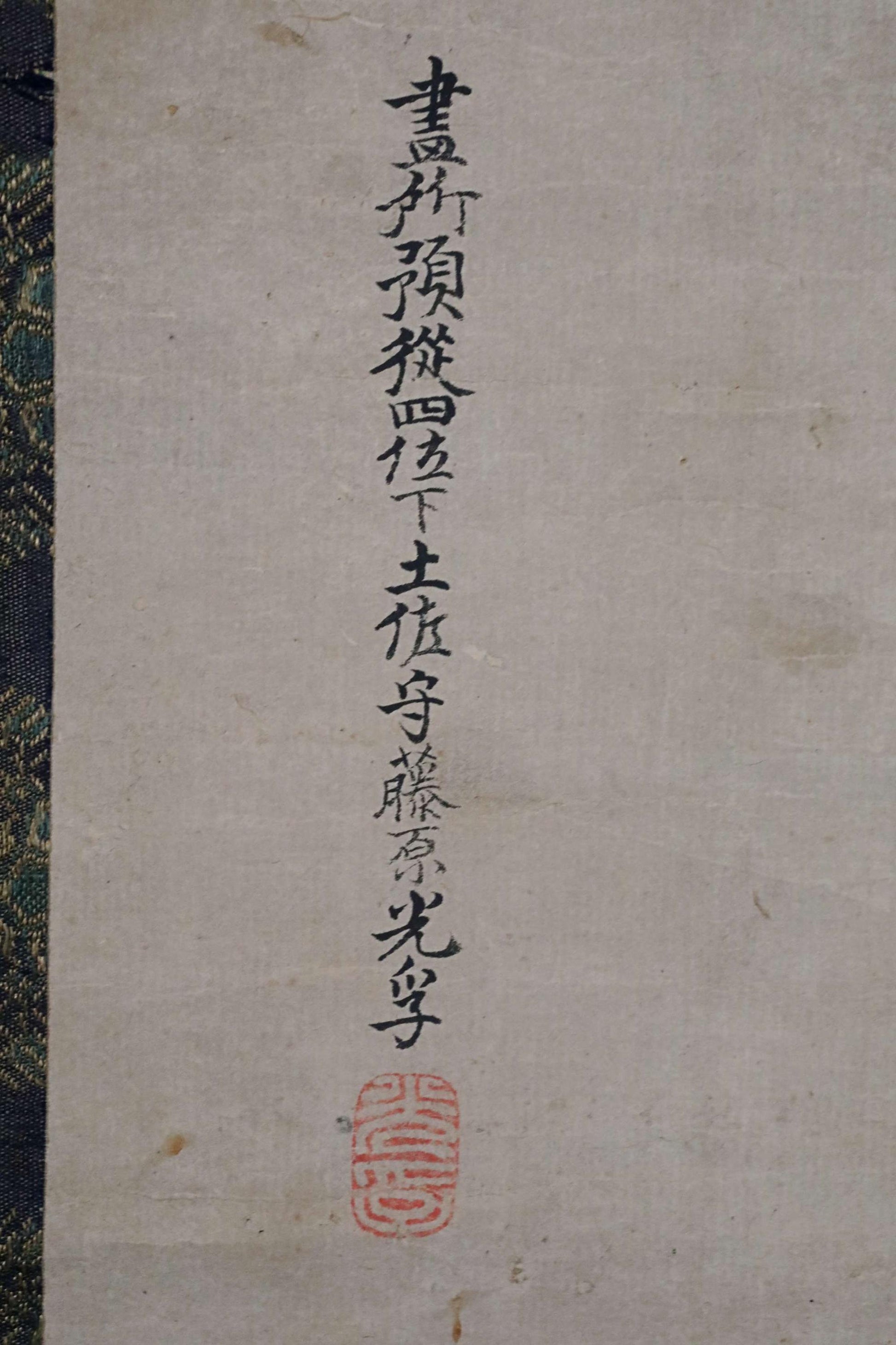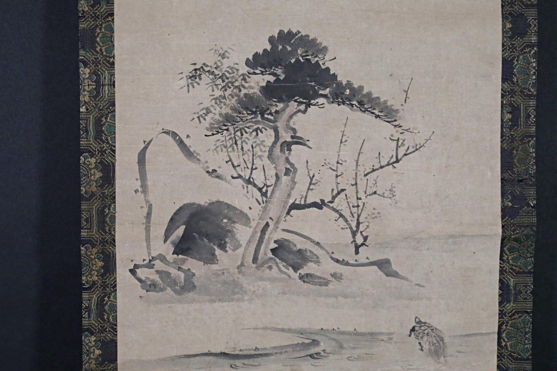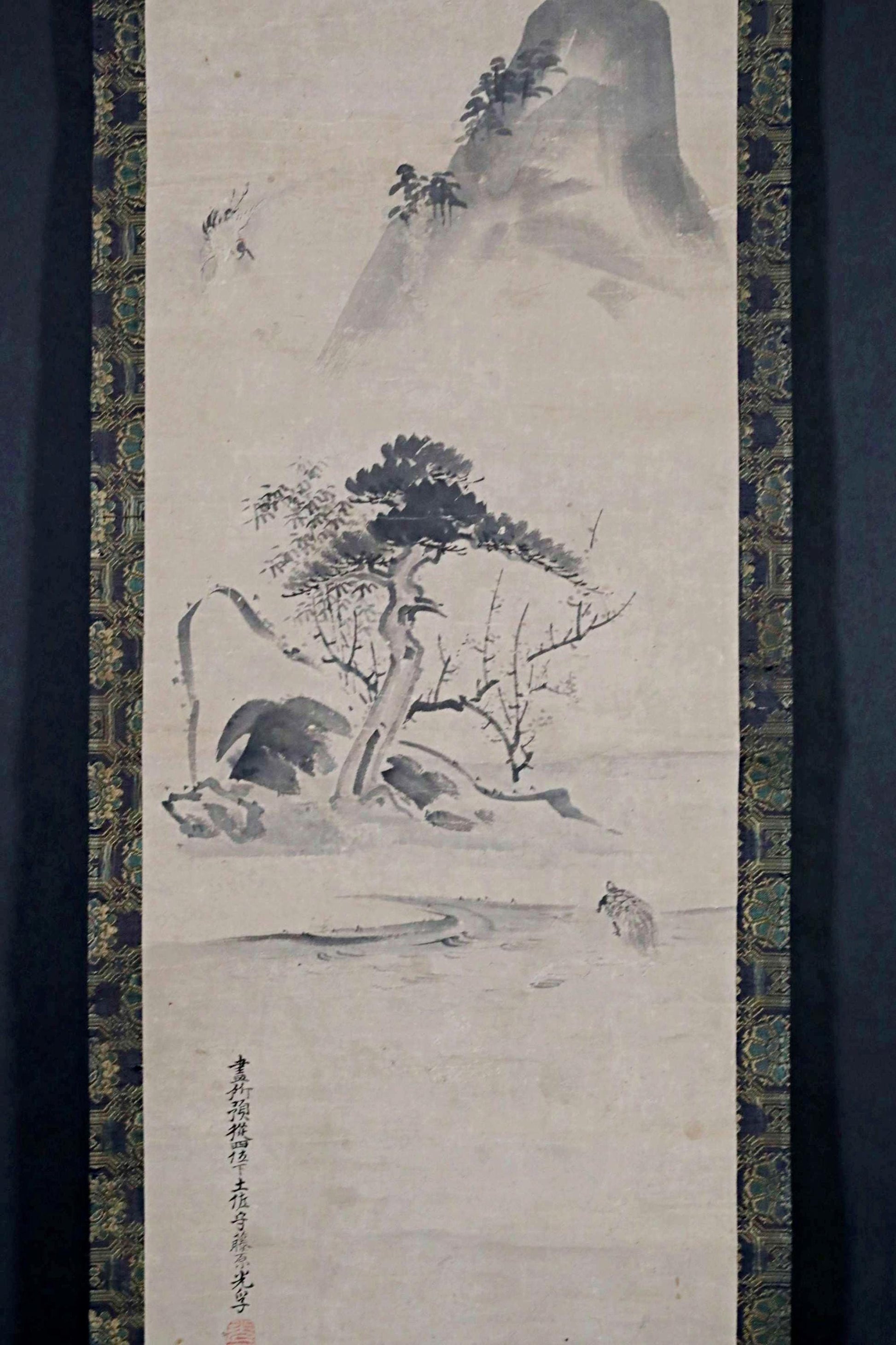 This hanging scroll (kakejiku) features an old painting by 土佐光孚 Tosa Mitsuzane (1818-1829), a painter of the Tosa School, created during the Edo period. The surrounding silk mounting was redone in the Showa era. The box is also not original. Because of this, the scroll is in very good condition and can be displayed and enjoyed immediately. This particular scroll is rendered solely with varying shades of ink, a style known as ink wash painting (suibokuga). Tosa Mitsuzane was born into a lineage of Tosa School painters in Kyoto, who served the Imperial Palace and court as official artists for generations.