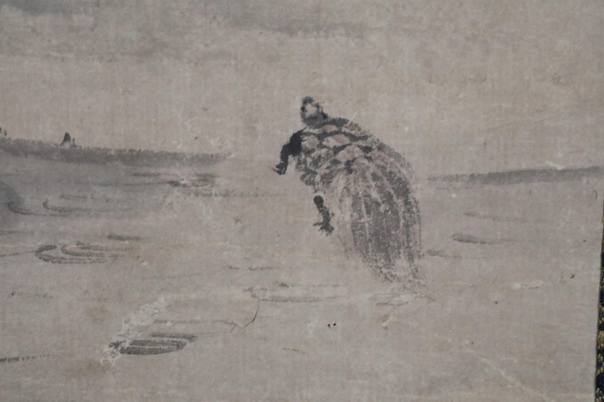 If you look closely at this hanging scroll, you'll see a charming depiction of a flying crane and a turtle looking up at it. In the center, there are auspicious Japanese symbols: pine, bamboo, and plum trees. The unique way space is utilized without over-detailing is quite interesting. Up close, the cranes, expressed with minimal lines, are splendid. It's painted on paper, with silk mounting, and wooden roller ends.