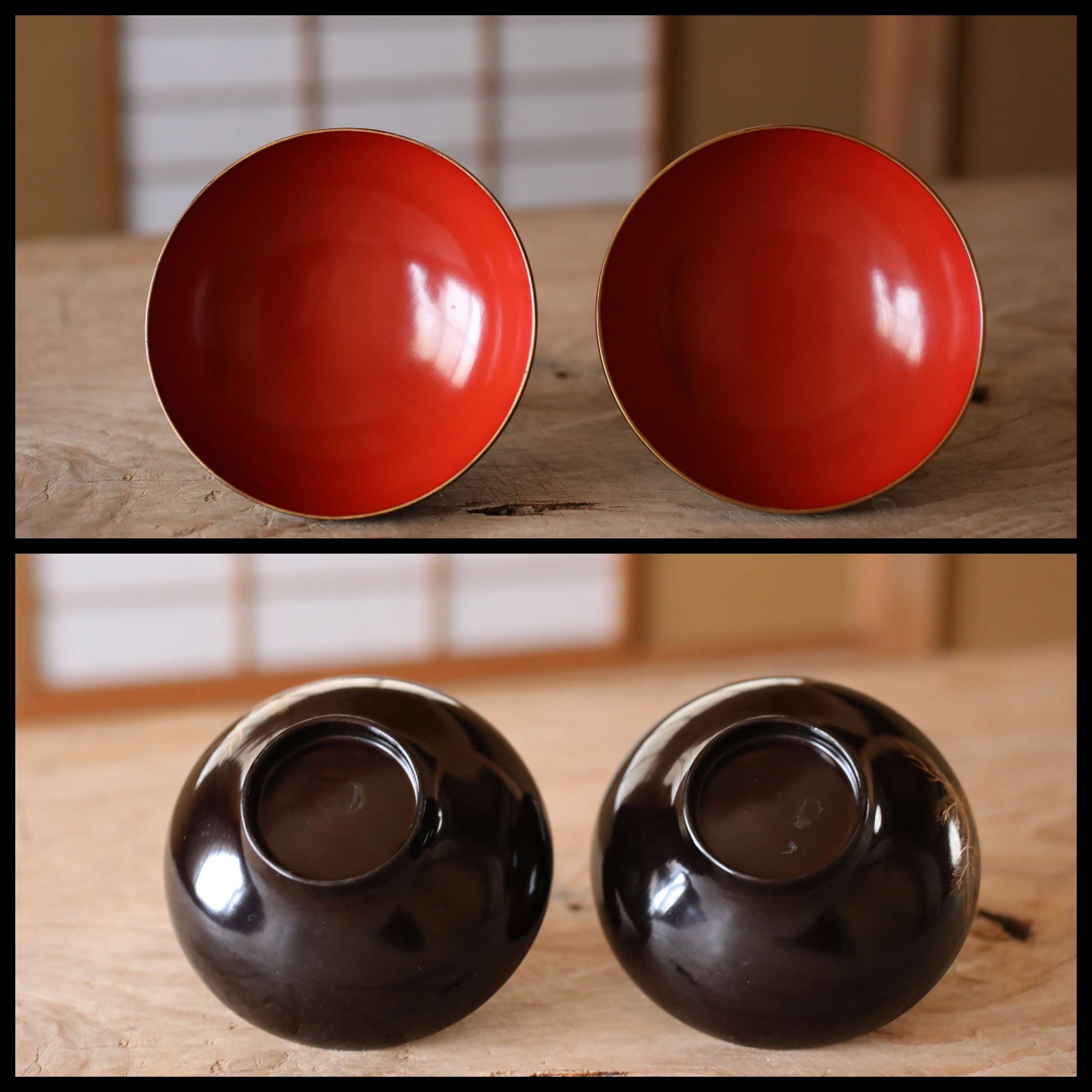 FINE! Japanese antique 1800s Urushi lacquer bowls set of 2, Owan miso cups pine tree design black gold lacquer tableware EDO hand craft