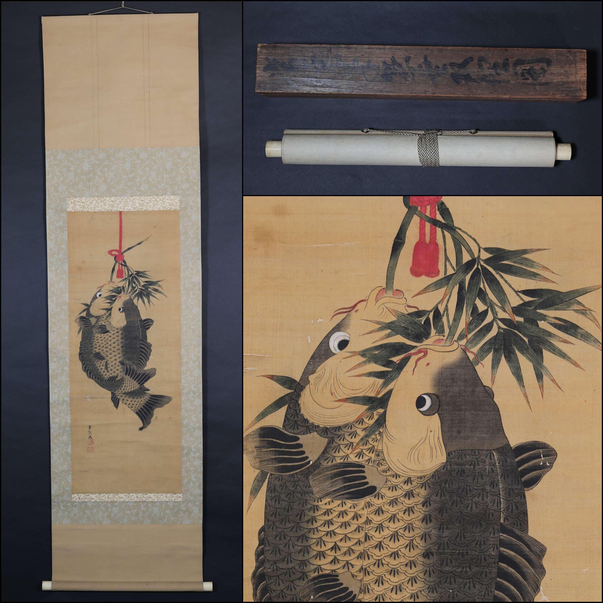 FINE! Japanese antique 1800s watercolor painting scroll fine painted fish carps, KAKEJIKU with signed seal H64.2in/H163cm