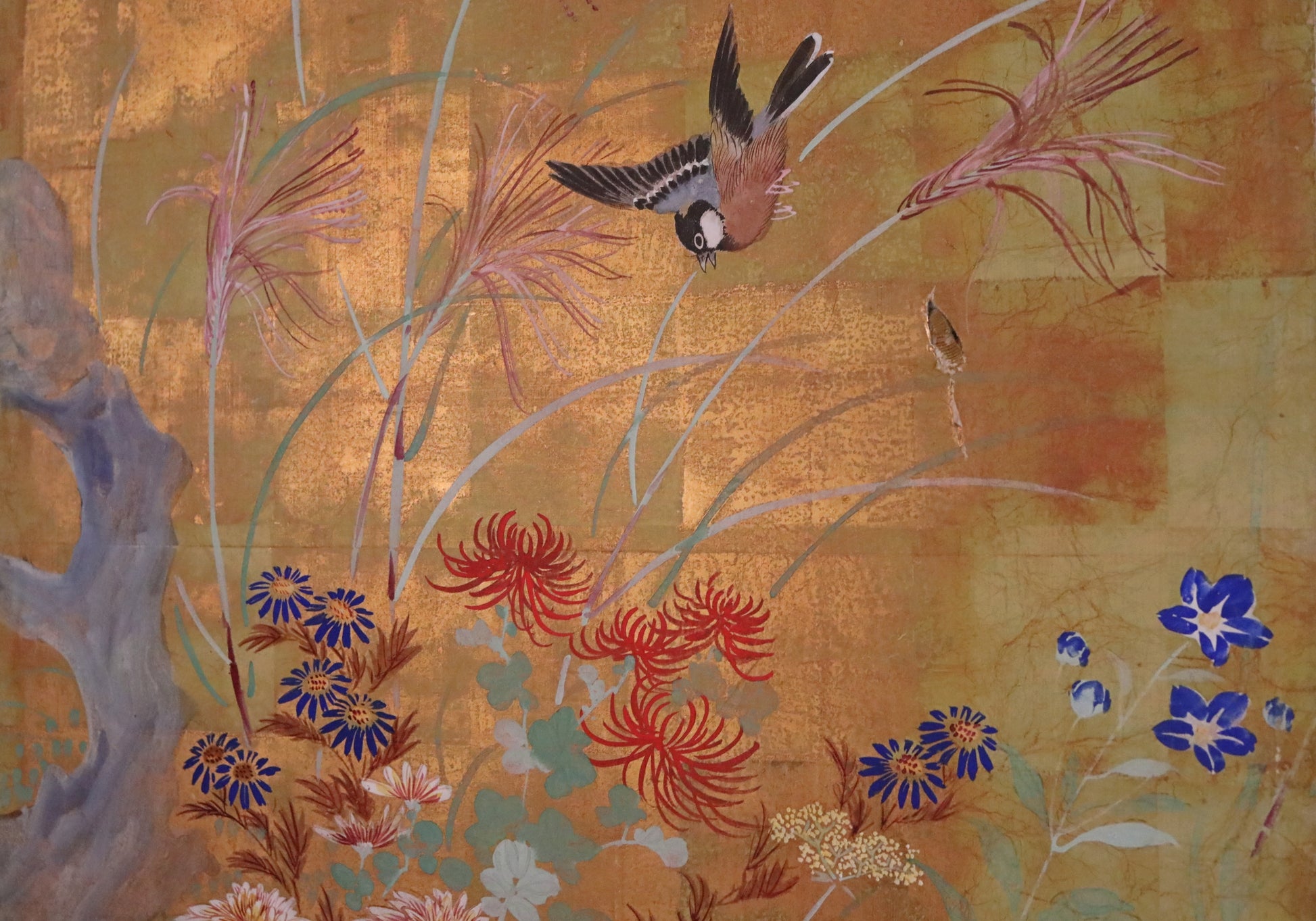 This folding screen is a reproduction of a painting by Yamamoto Baiitsu (1783-1856), a Nanga painter from Nagoya during the Edo period. It was painted 1960s. Baiitsu was known as a master of flower-and-bird paintings. Although there is no signature on this piece, it was originally part of a pair, and one of the other pieces is signed “Baitsu.” However, this piece is not his work.