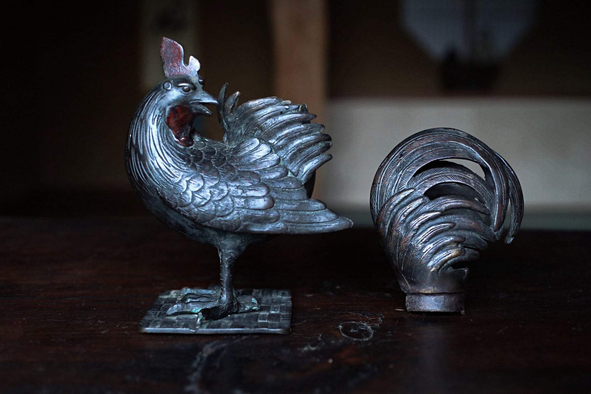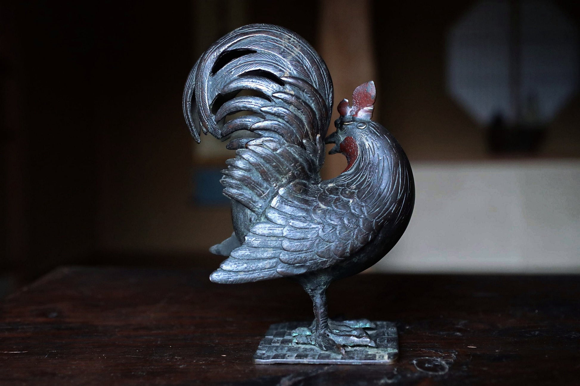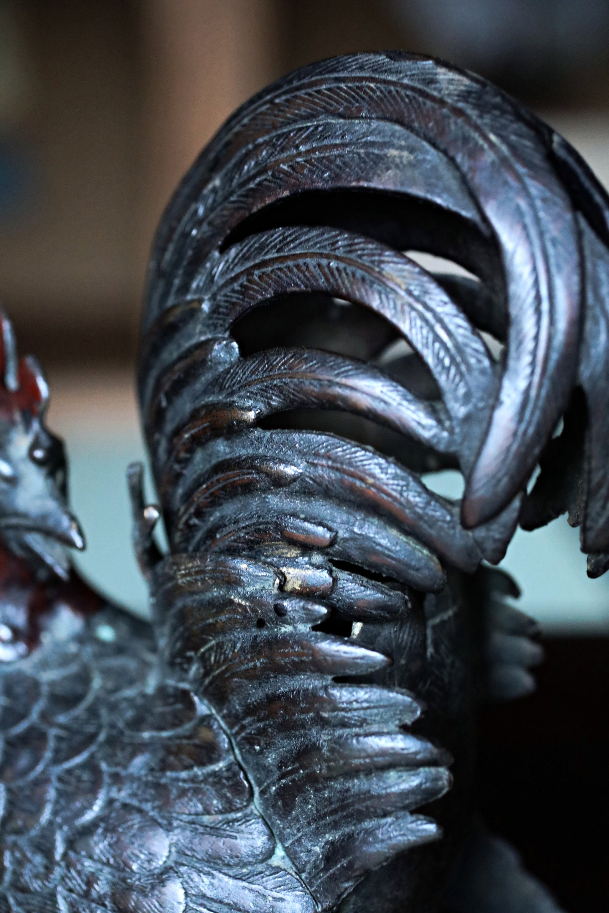 FINE! Japanese antique 1910s Bronze bird statue censer Koro cock Ondori rooster with wooden, animal Incense burner For GIFT H9.3in/H23.5cm