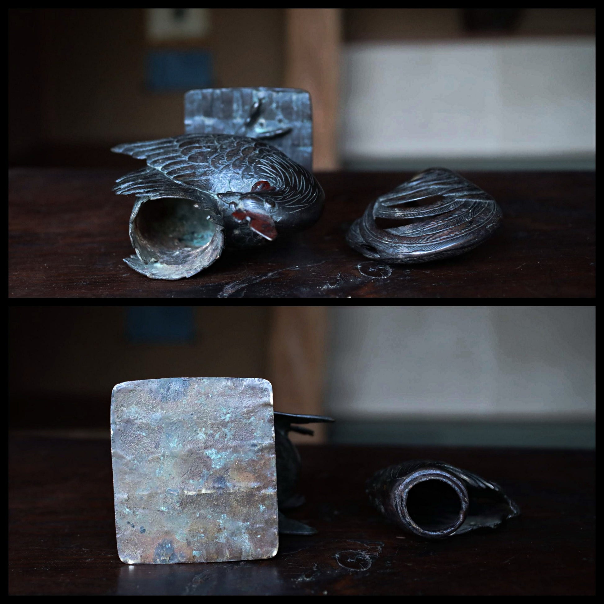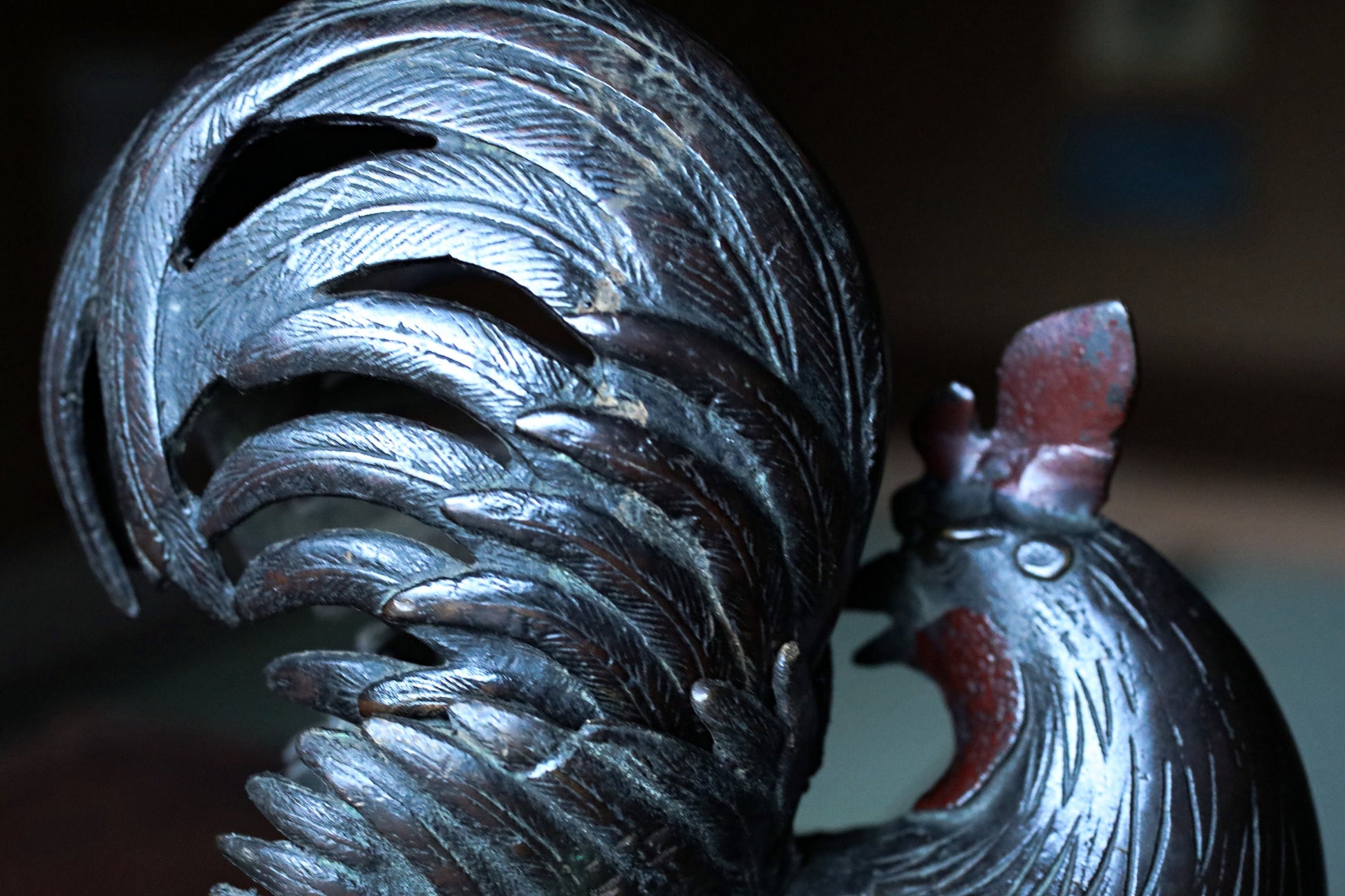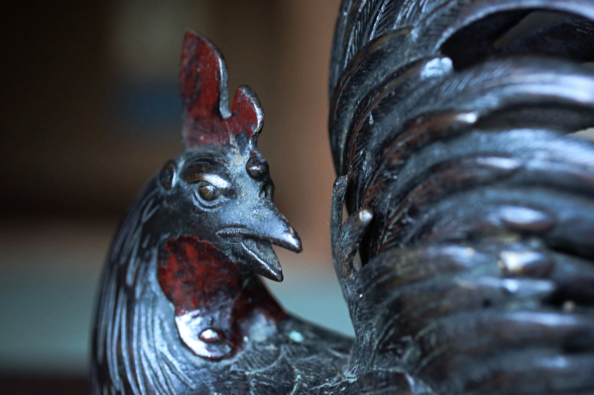 FINE! Japanese antique 1910s Bronze bird statue censer Koro cock Ondori rooster with wooden, animal Incense burner For GIFT H9.3in/H23.5cm