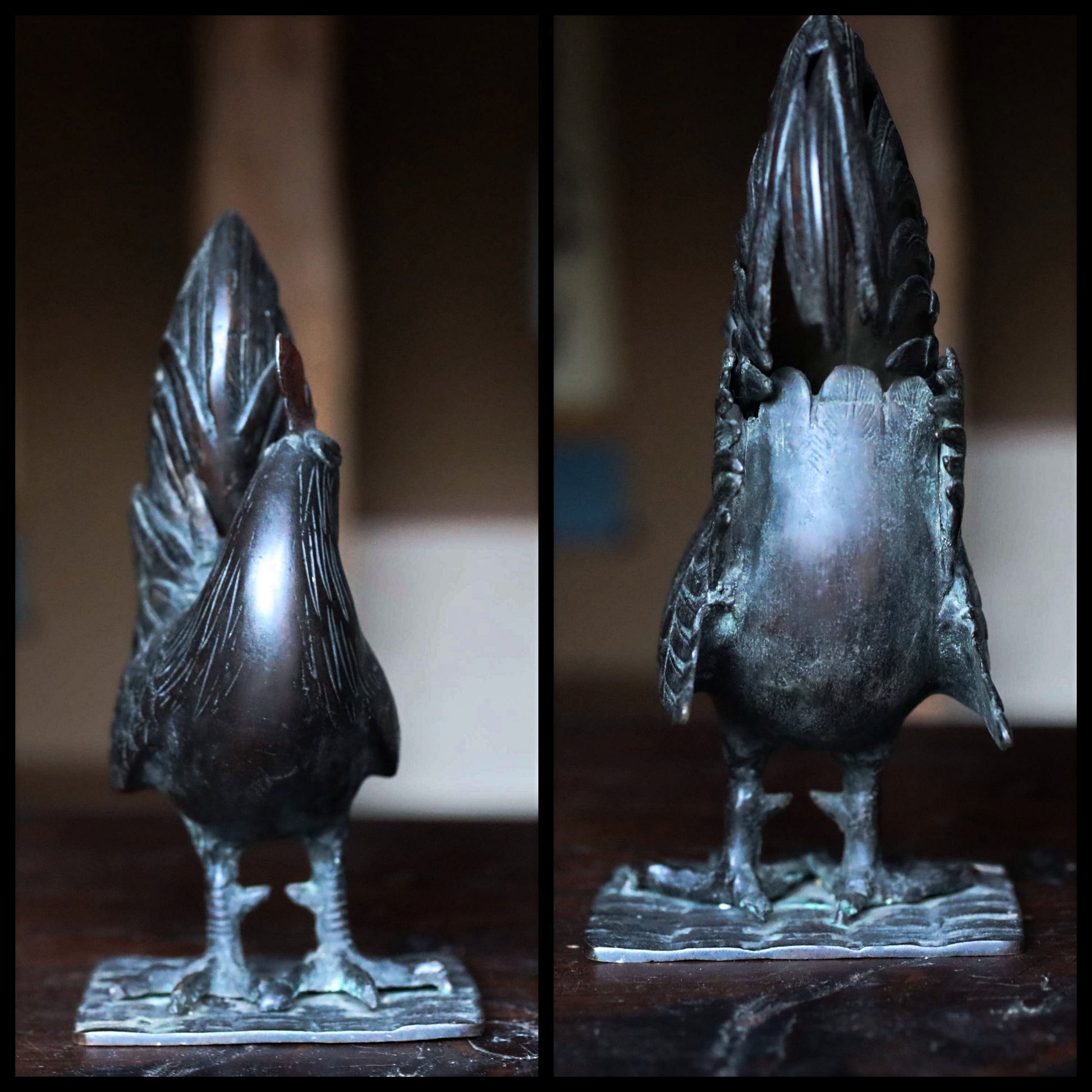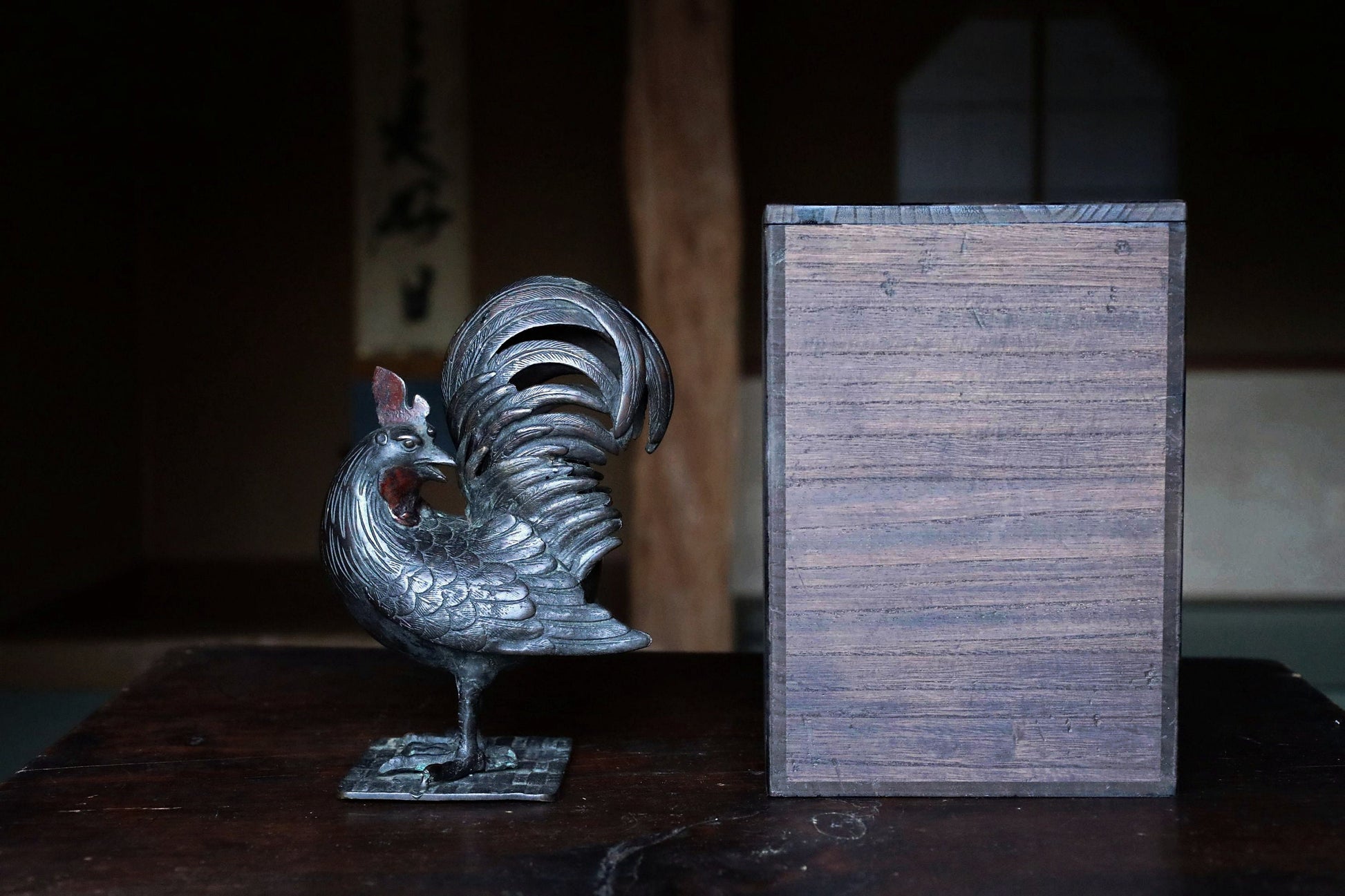 FINE! Japanese antique 1910s Bronze bird statue censer Koro cock Ondori rooster with wooden, animal Incense burner For GIFT H9.3in/H23.5cm.