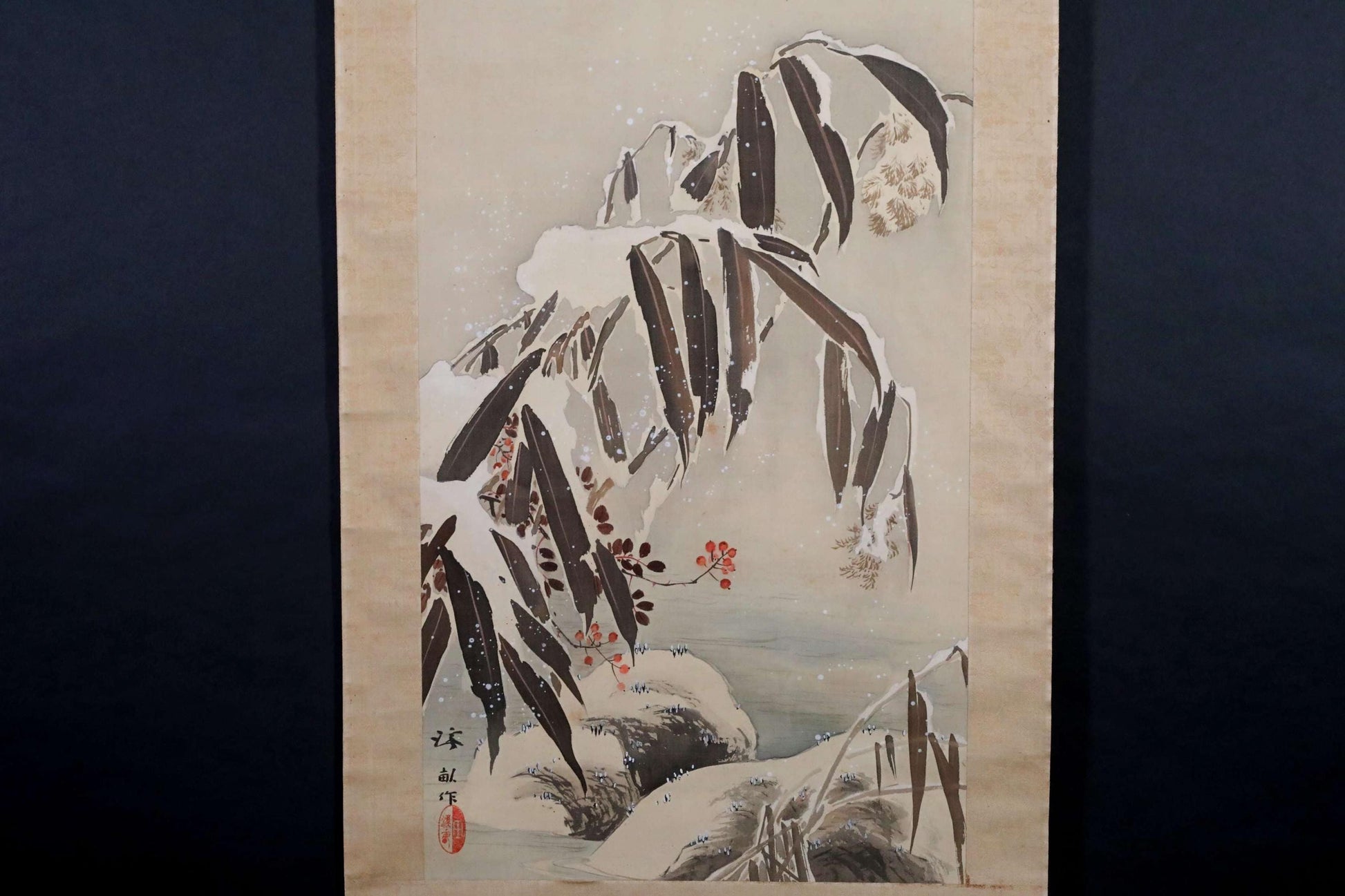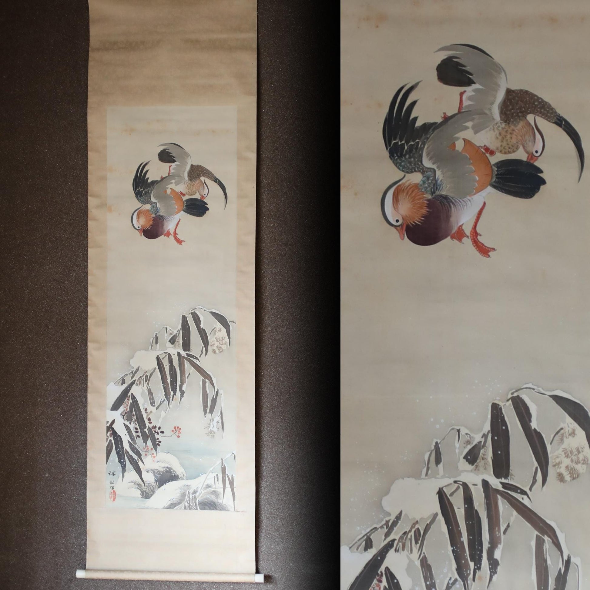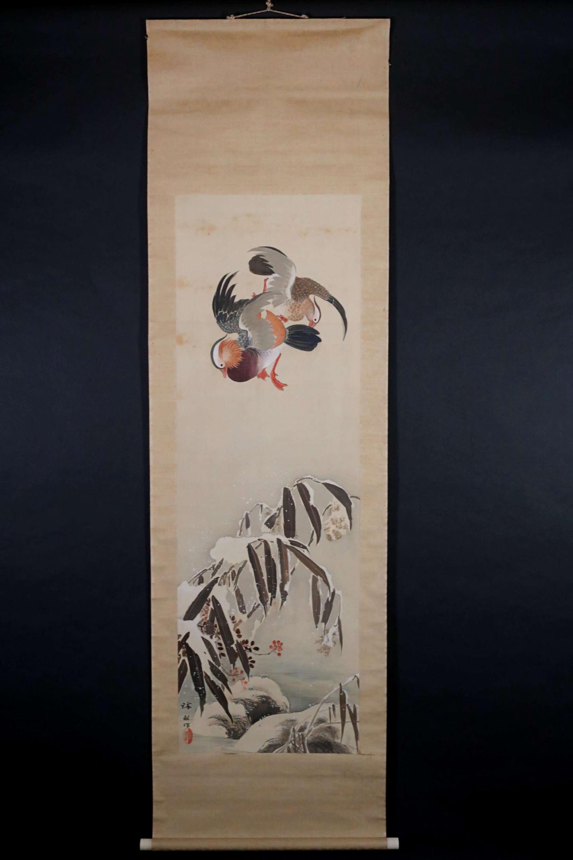 This is a beautiful hanging scroll depicting a winter scenery with a pair of mandarin ducks and bamboo leaves. In Japan, mandarin ducks are known as birds that announce the arrival of winter, and since they are always in pairs, they also represent loving couples. You can feel the harsh cold from the bamboo leaves heavily covered in snow, but the fruit of the Smilax china peeking out beneath them is likely a precious food source for the mandarin ducks. The moment when two ducks are playfully about to swoop straight down to peck at the berries is dynamically and effectively captured within the proportions of a long, narrow hanging scroll.
