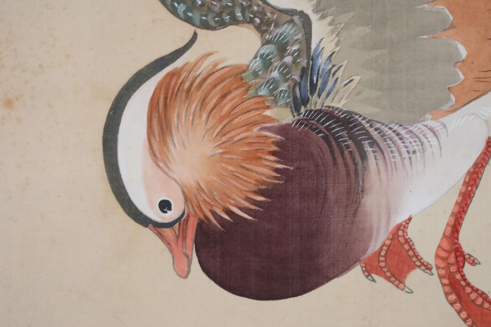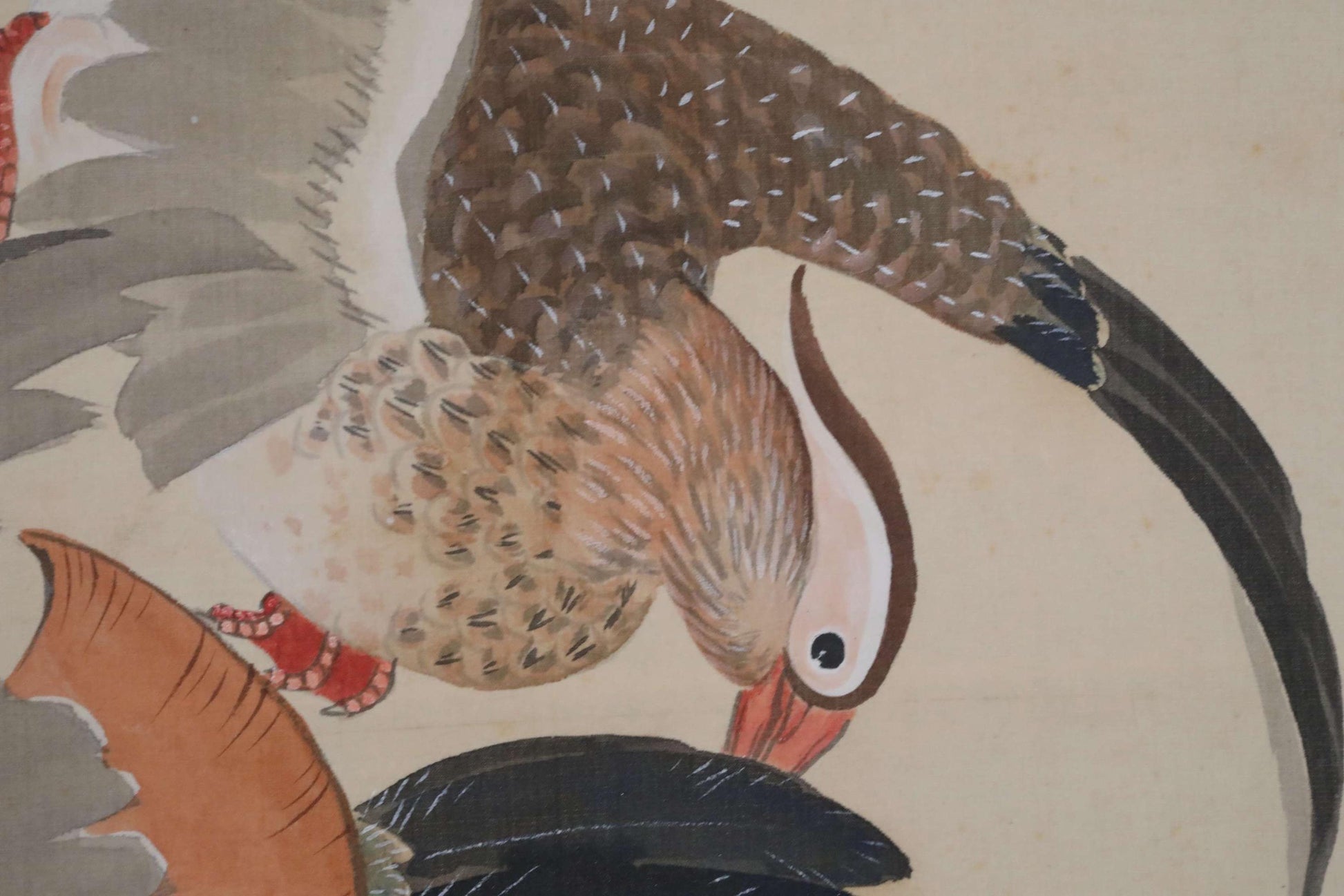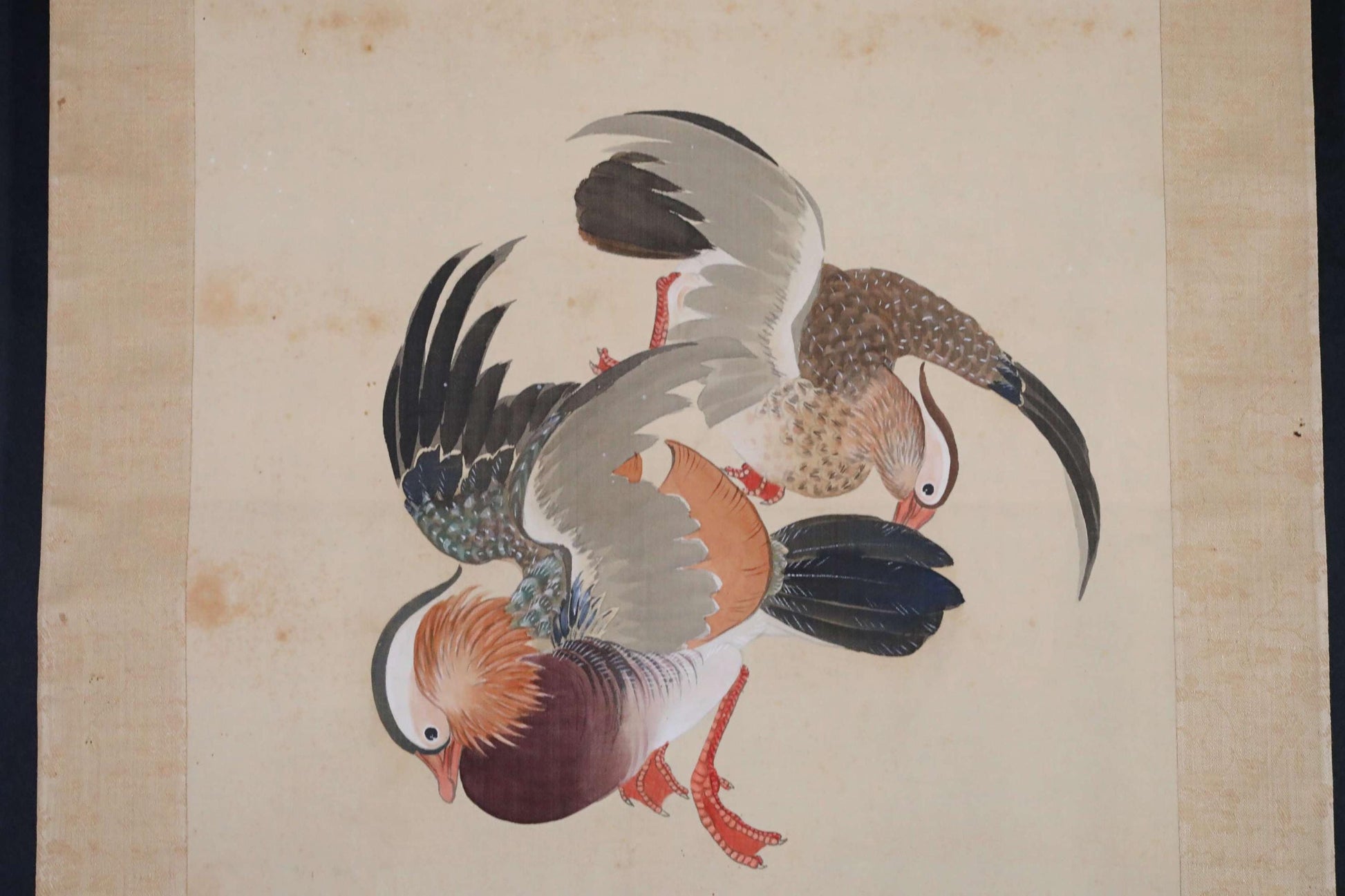 This is a beautiful hanging scroll depicting a winter scenery with a pair of mandarin ducks and bamboo leaves. In Japan, mandarin ducks are known as birds that announce the arrival of winter, and since they are always in pairs, they also represent loving couples. You can feel the harsh cold from the bamboo leaves heavily covered in snow, but the fruit of the Smilax china peeking out beneath them is likely a precious food source for the mandarin ducks. The moment when two ducks are playfully about to swoop straight down to peck at the berries is dynamically and effectively captured within the proportions of a long, narrow hanging scroll.