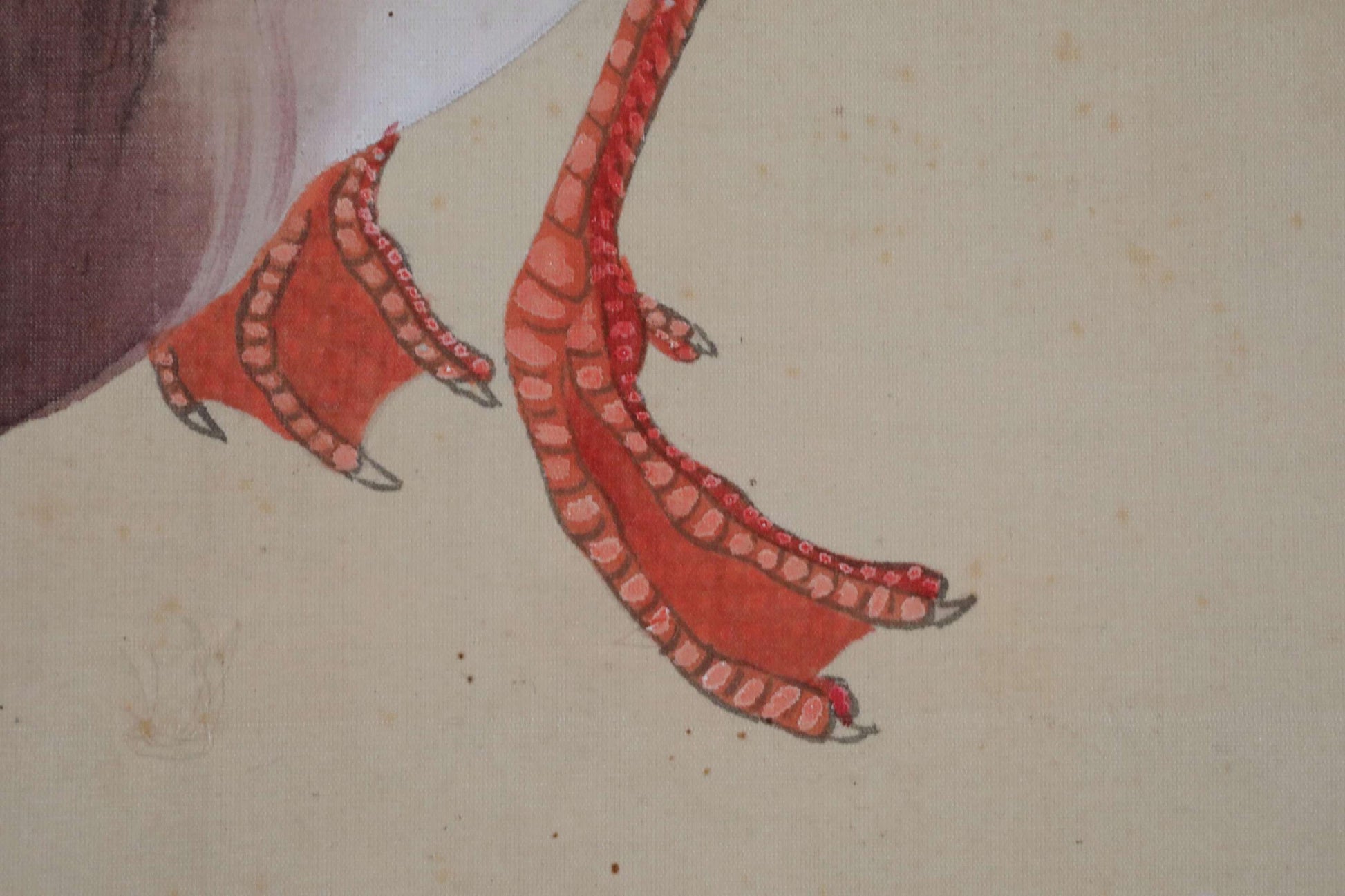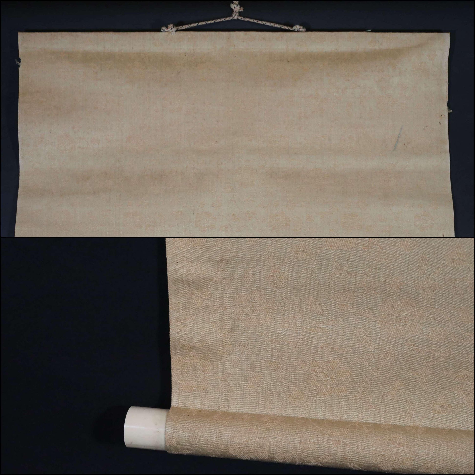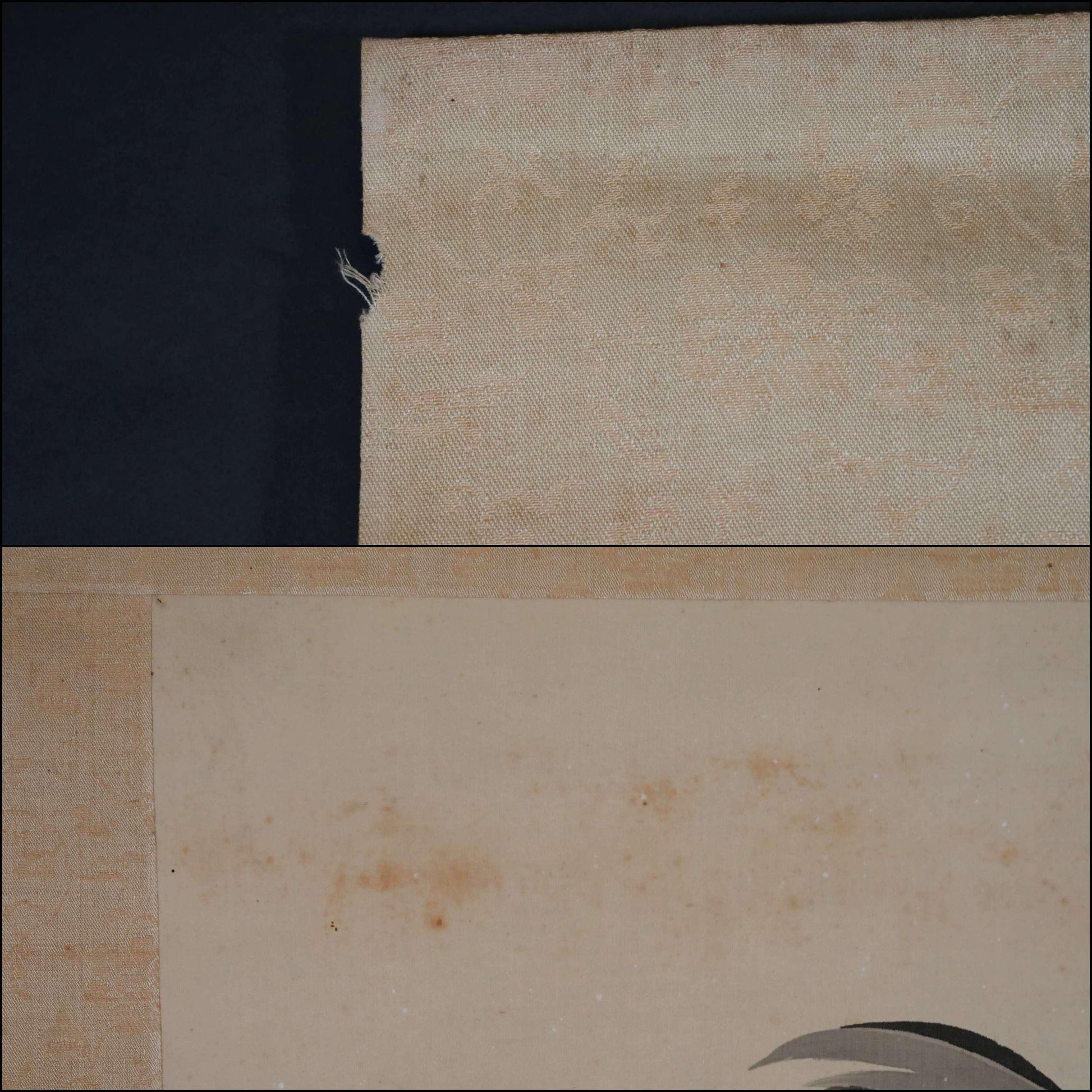 There are stains and torn at edges of the silk cloth.