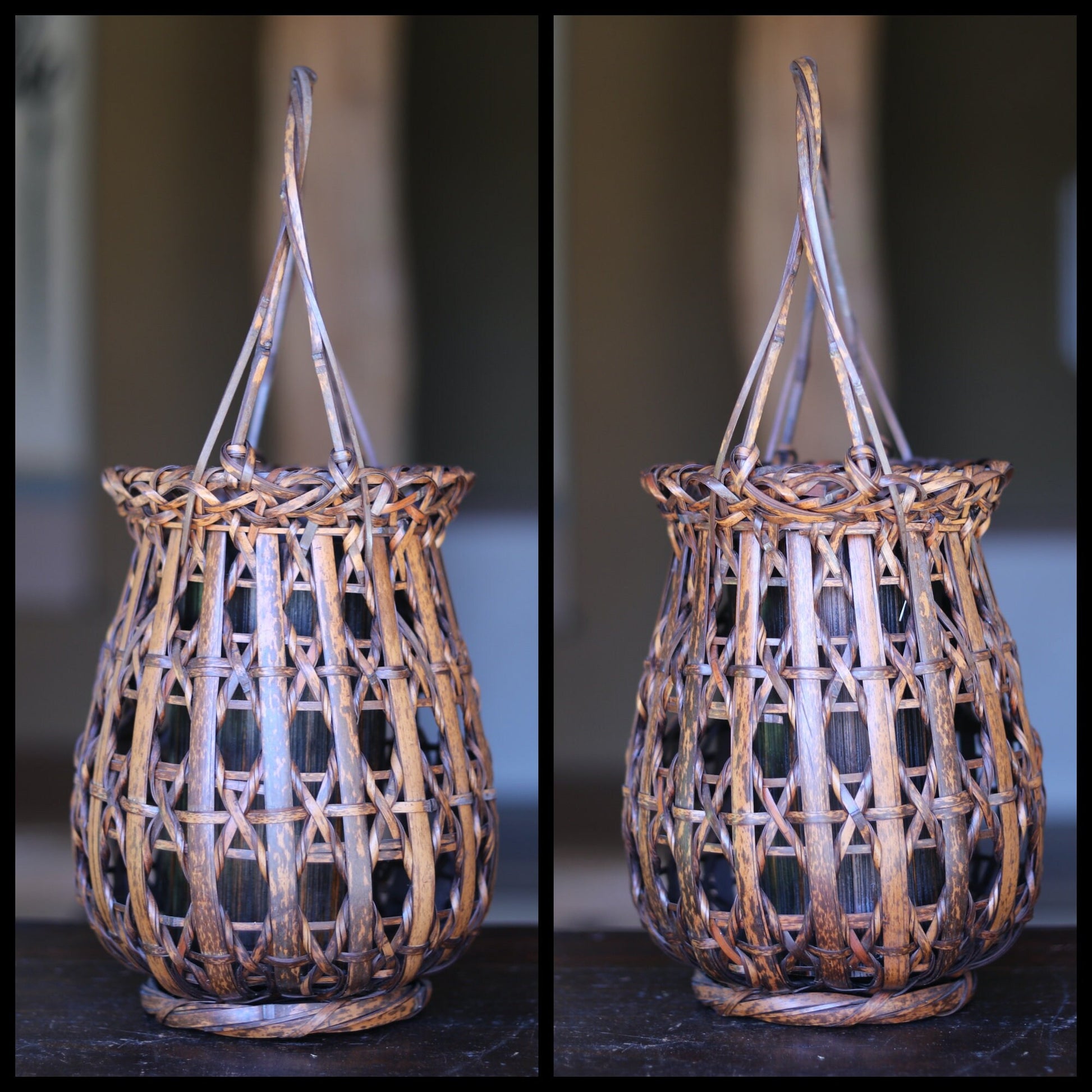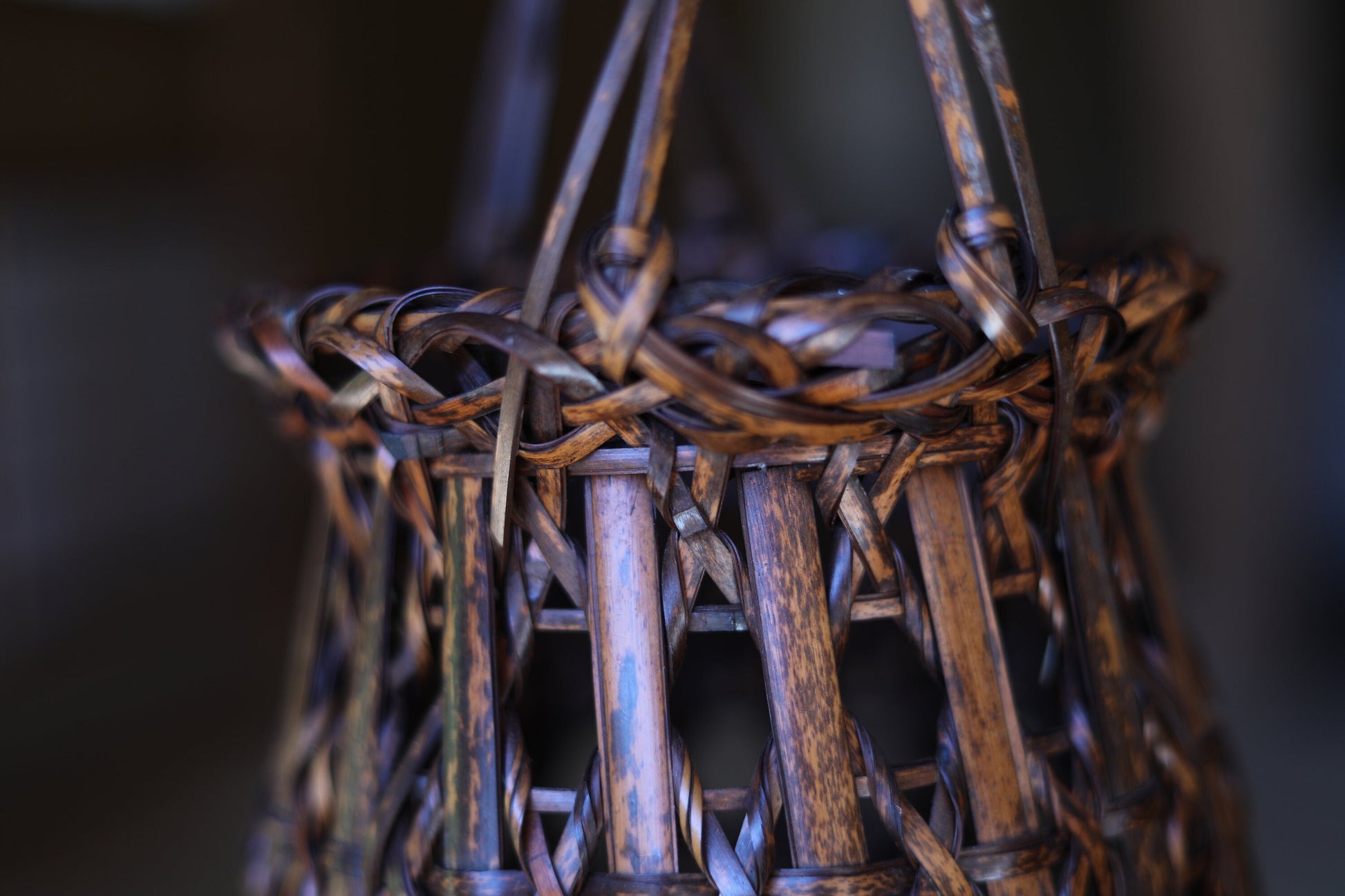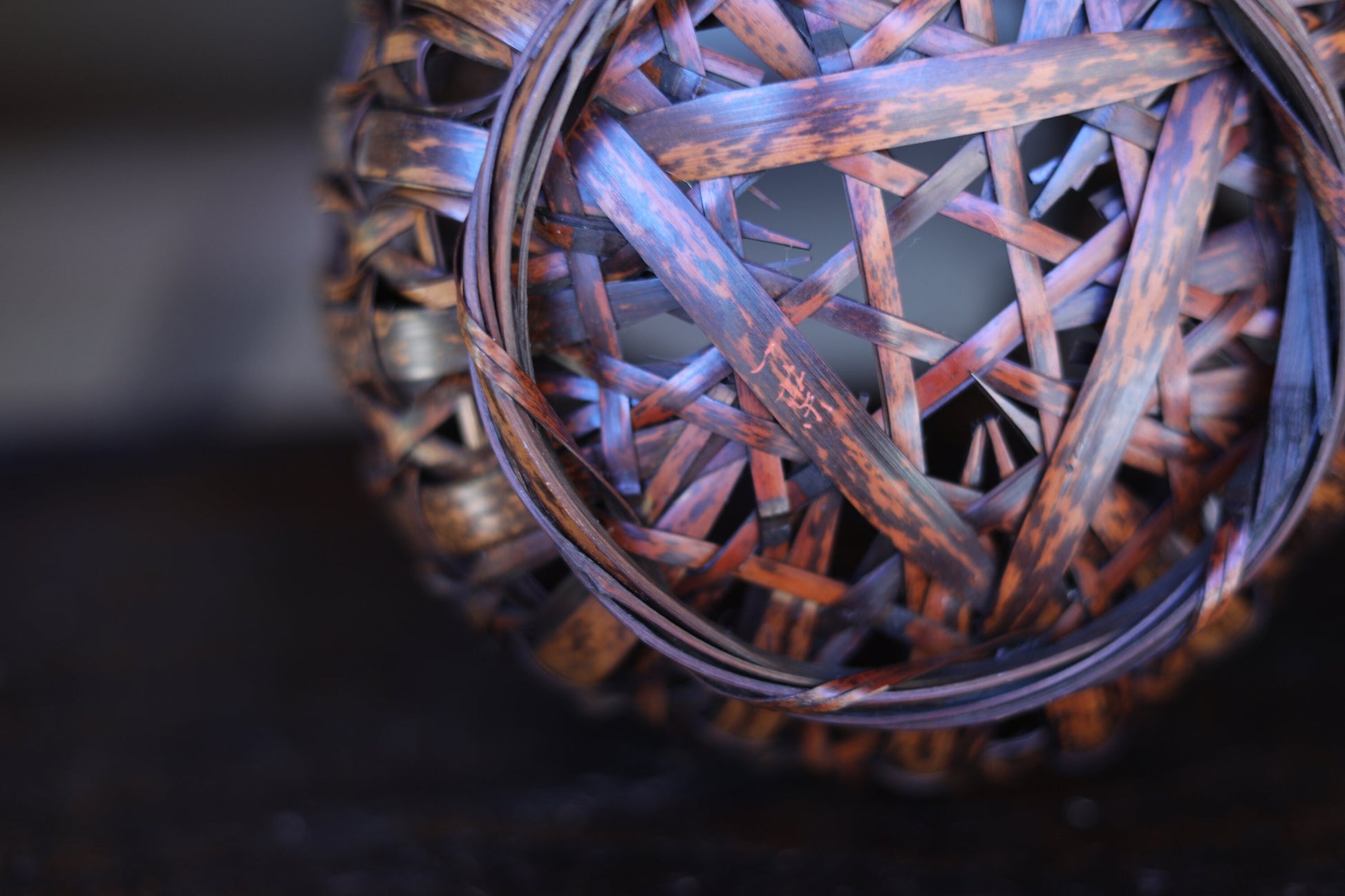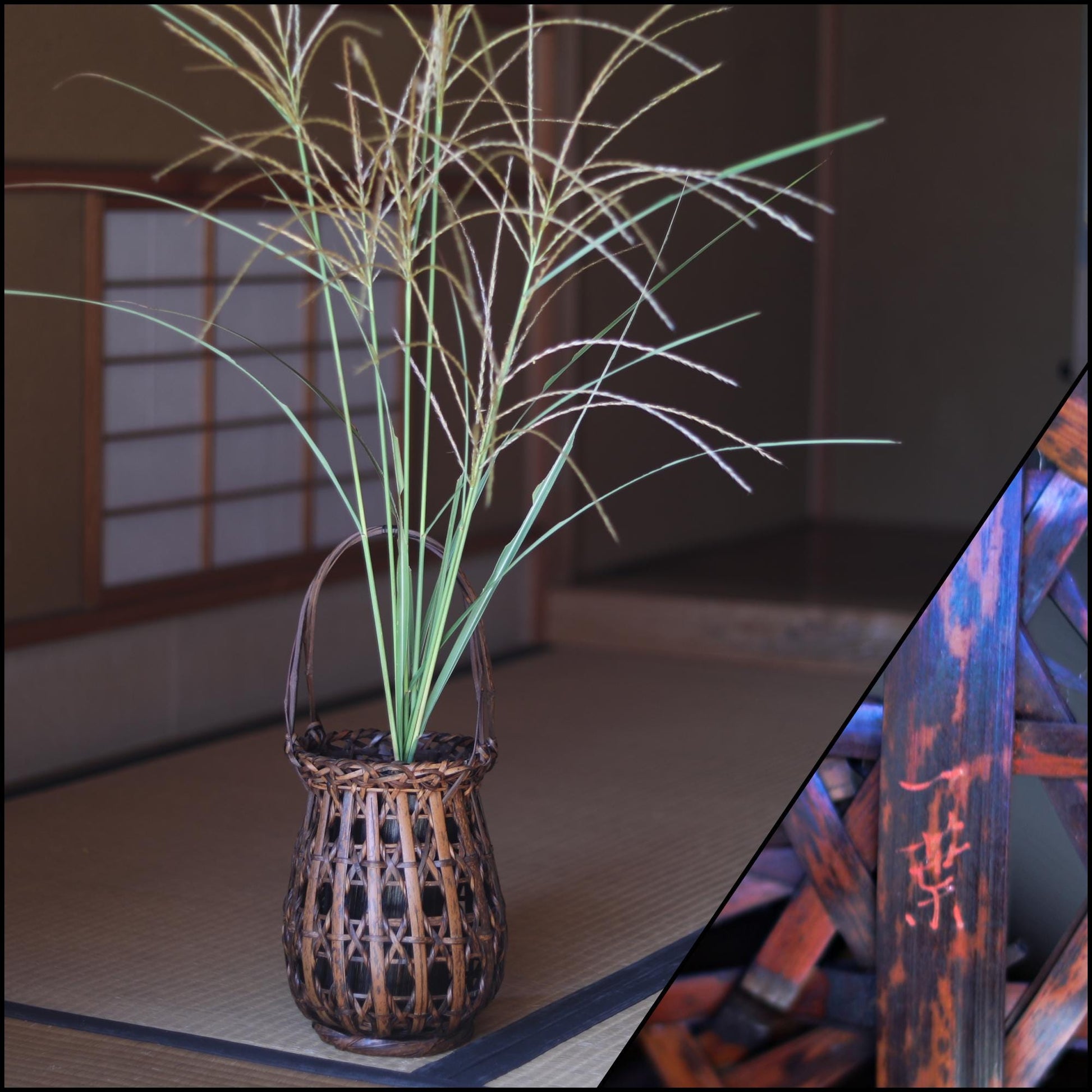 The bamboo used is called "sooty bamboo," which has been smoked over an open hearth for 10 to 100 years. The color is very cool and has a speckled pattern.