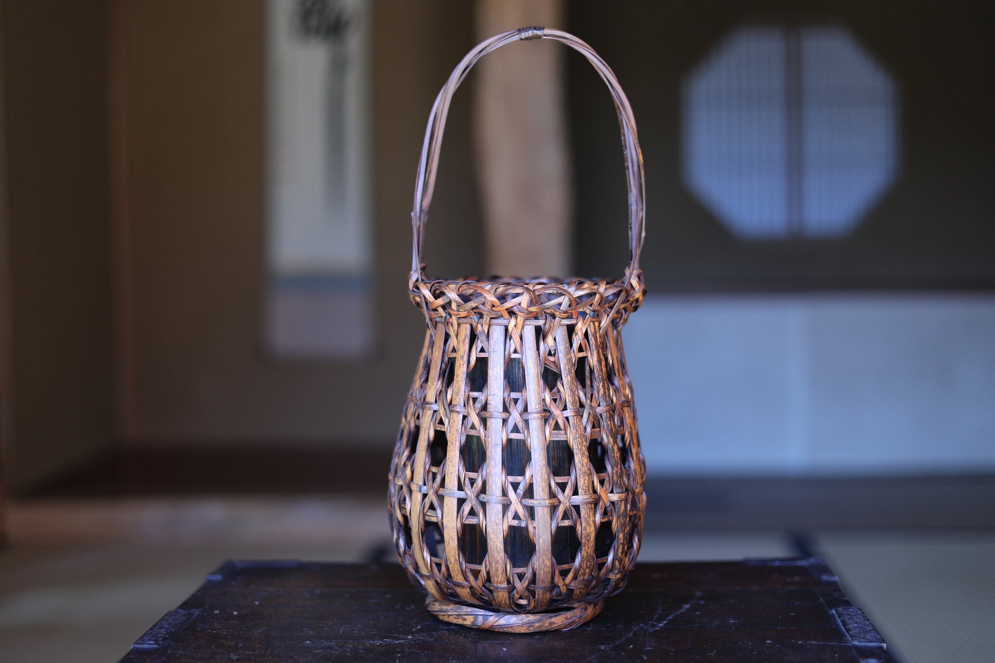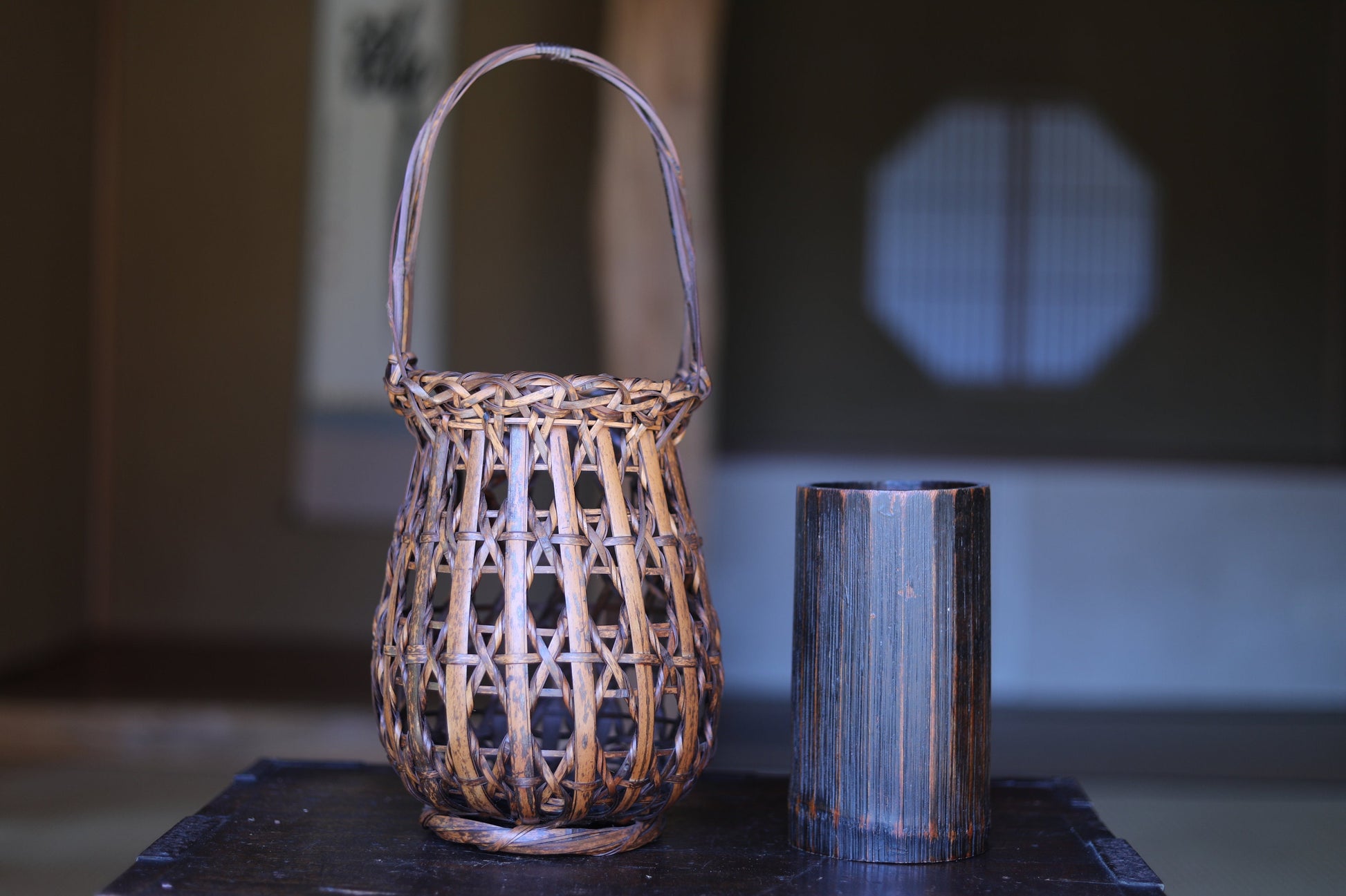 FINE! Japanese antique bamboo woven basket in smoke stained color with Kanji signature ,For IKEBANA, Tea ceremony H15.7x6.7in/40×17cm
