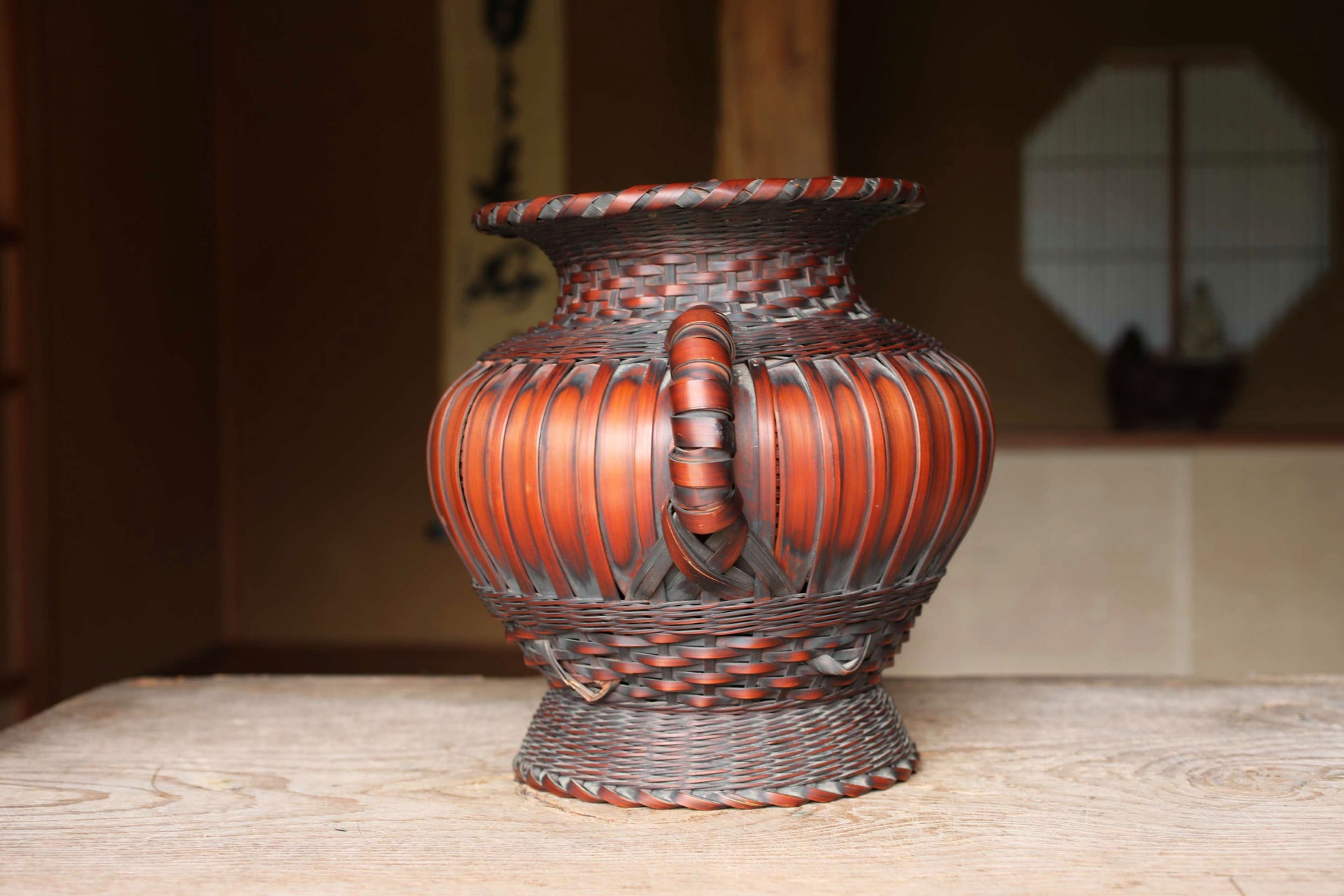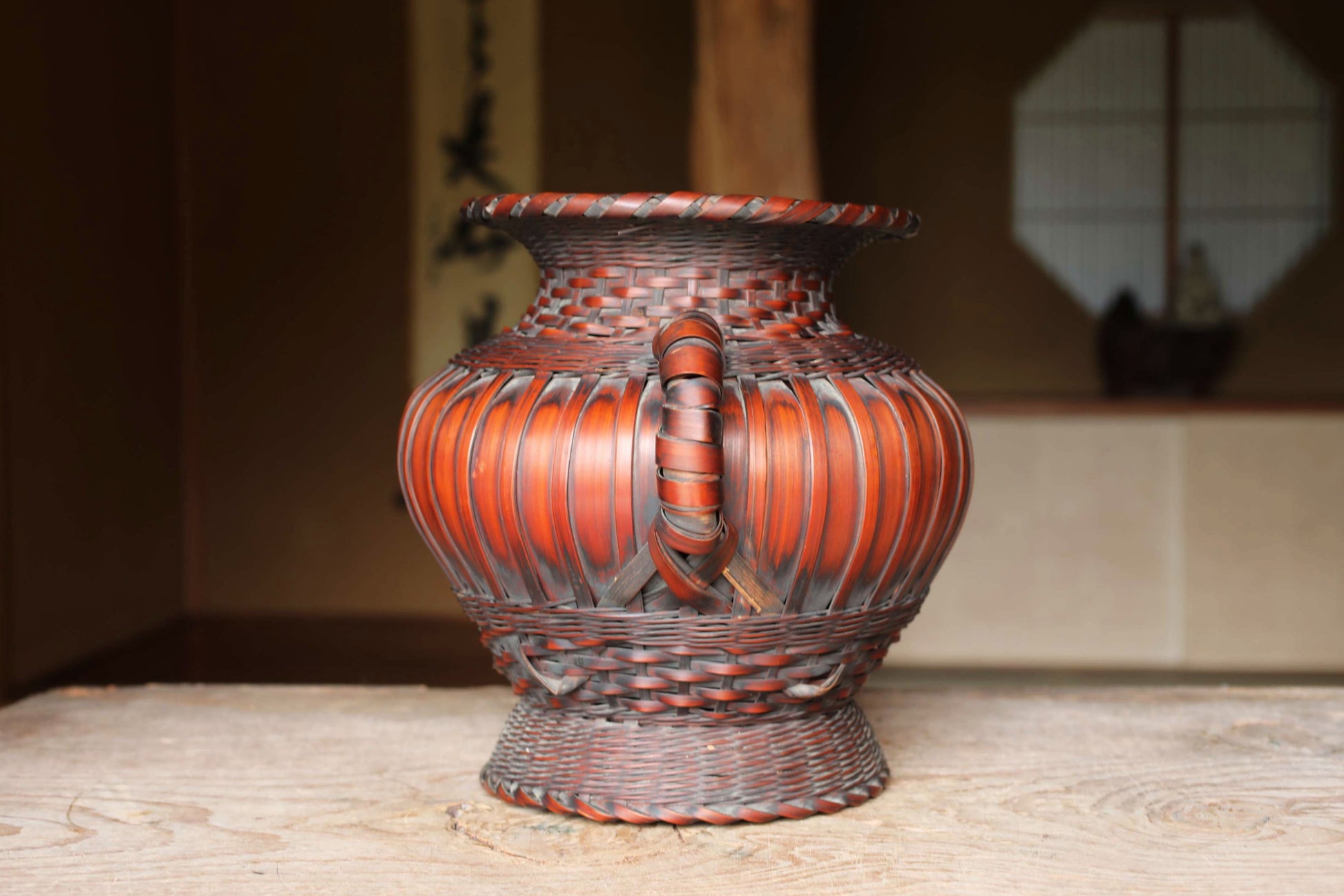 LARGE! Japanese vintage bamboo woven vase with two handles in smoke stained color, IKEBANA, Tea ceremony, Hana-kago W13.4in/W34cm