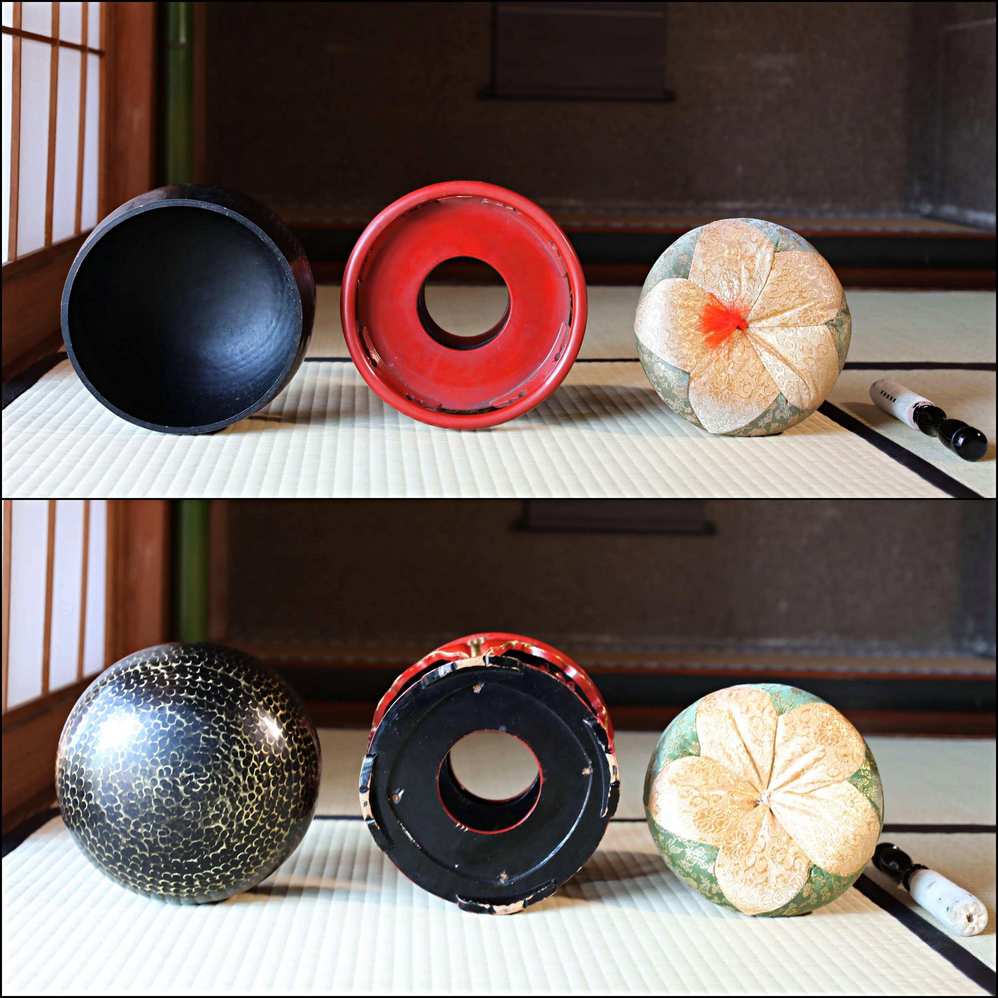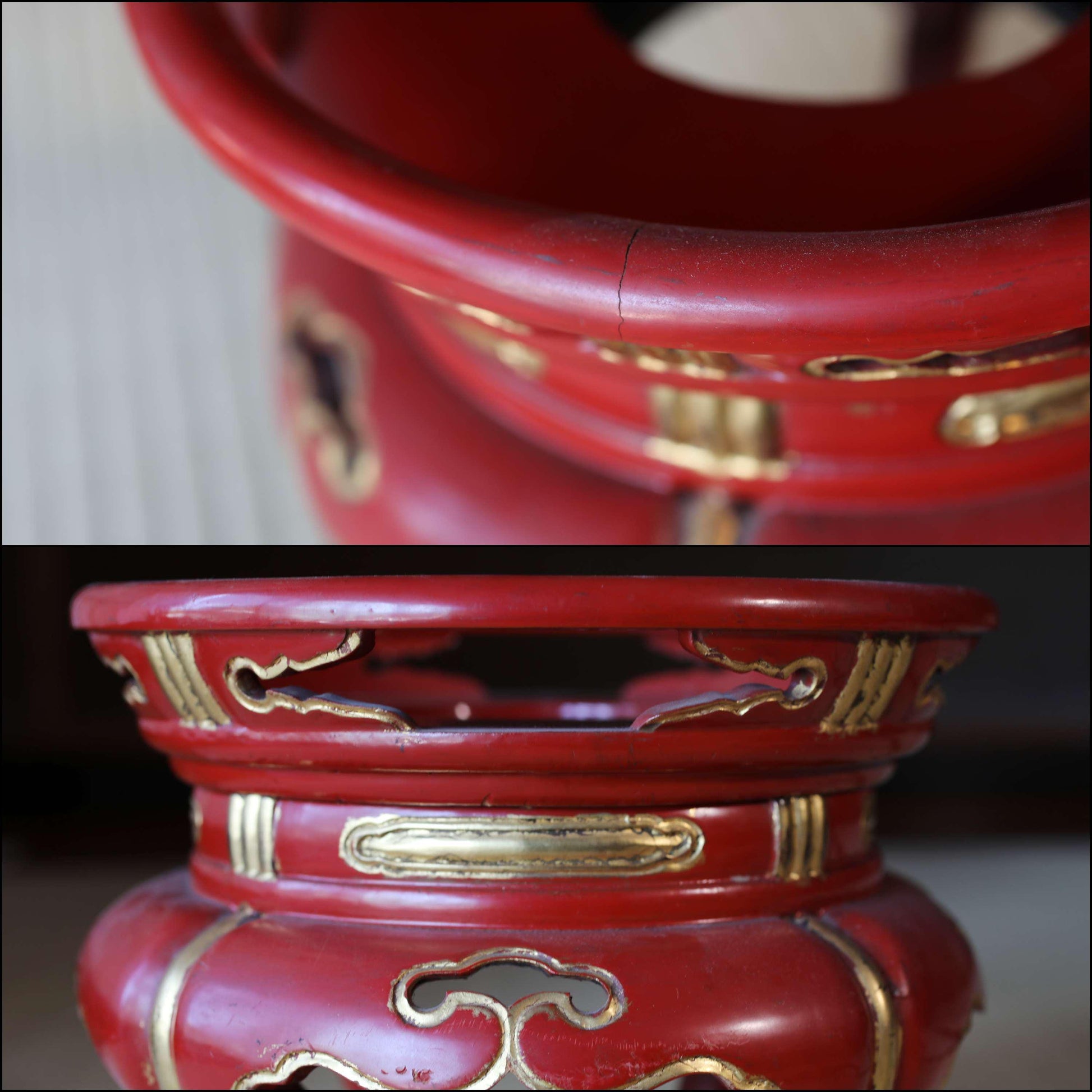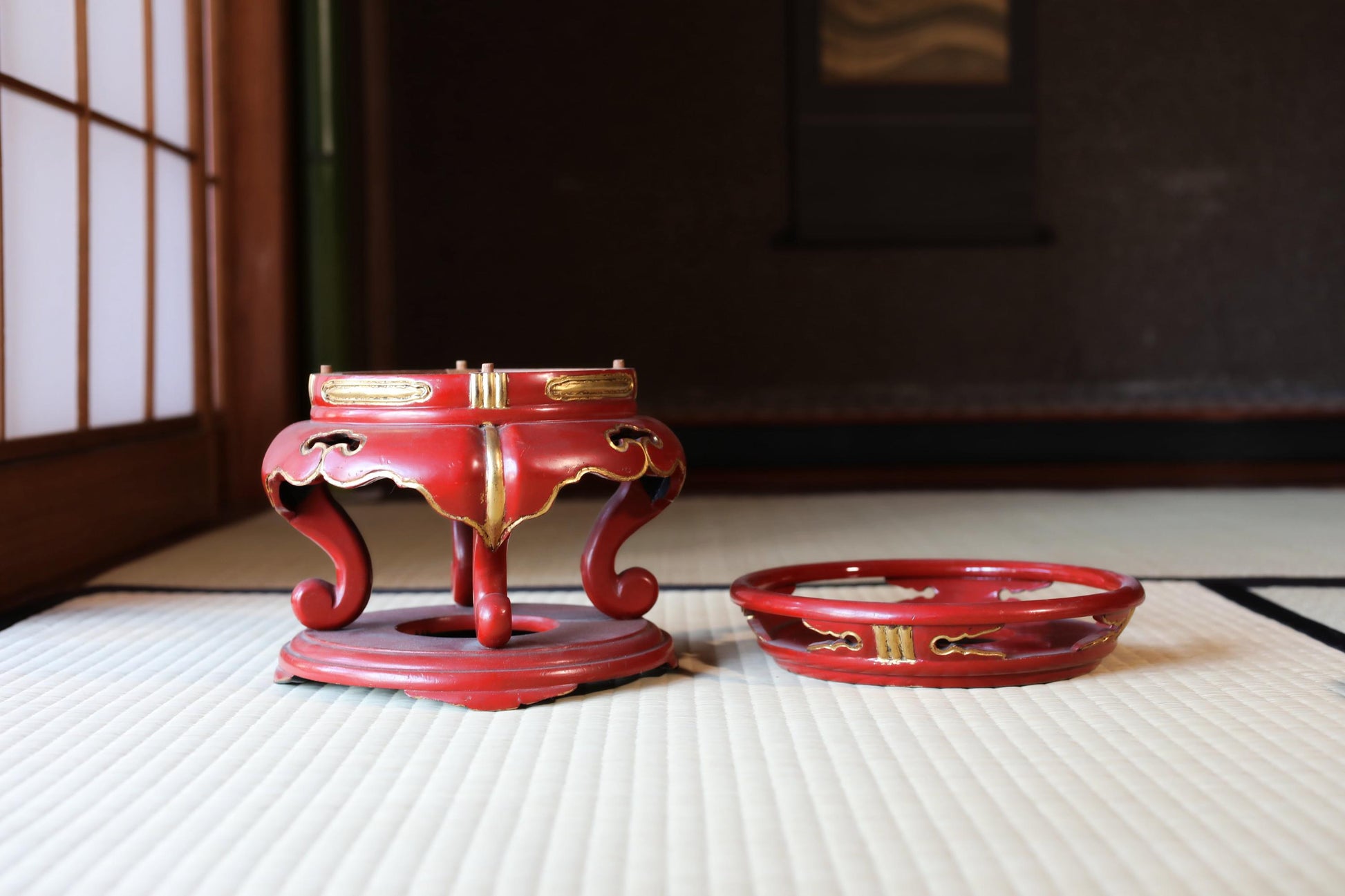 The stick is made of wood and leather. The bell is signed “妙龍” in Kanji characters. The stand with cat legs is gorgeously covered in vermillion lacquer and outlined in gold.
