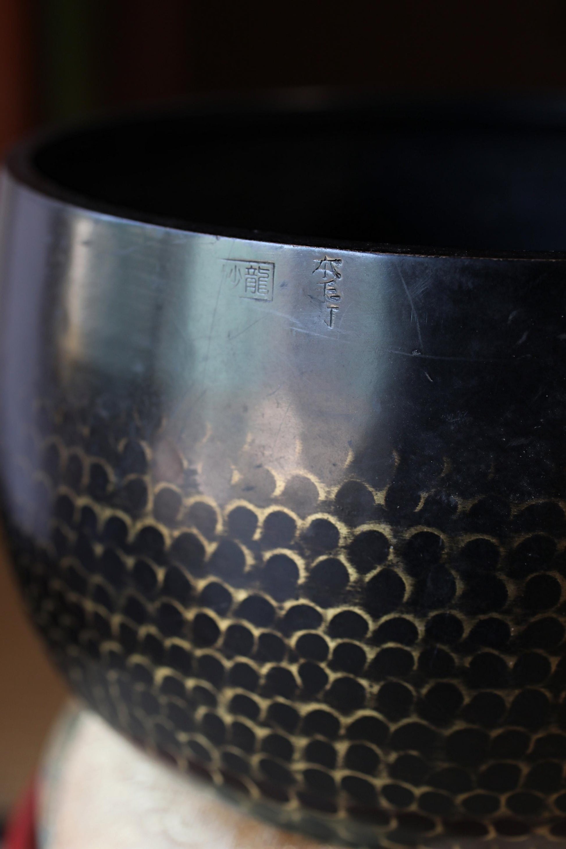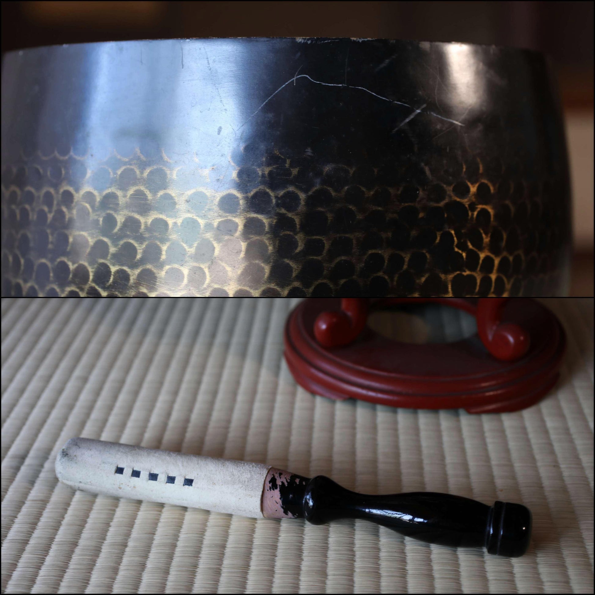 FINE! Japanese antique Bronze buddhist chanting bell with sign妙龍, Singing Bowl, ORIN Buddhist with wooden stand cushions stick W9.1in/W23cm