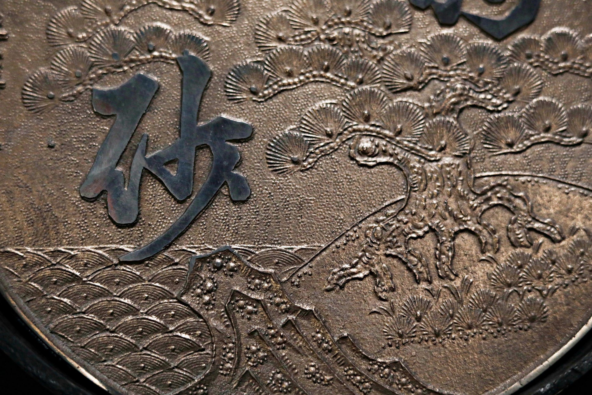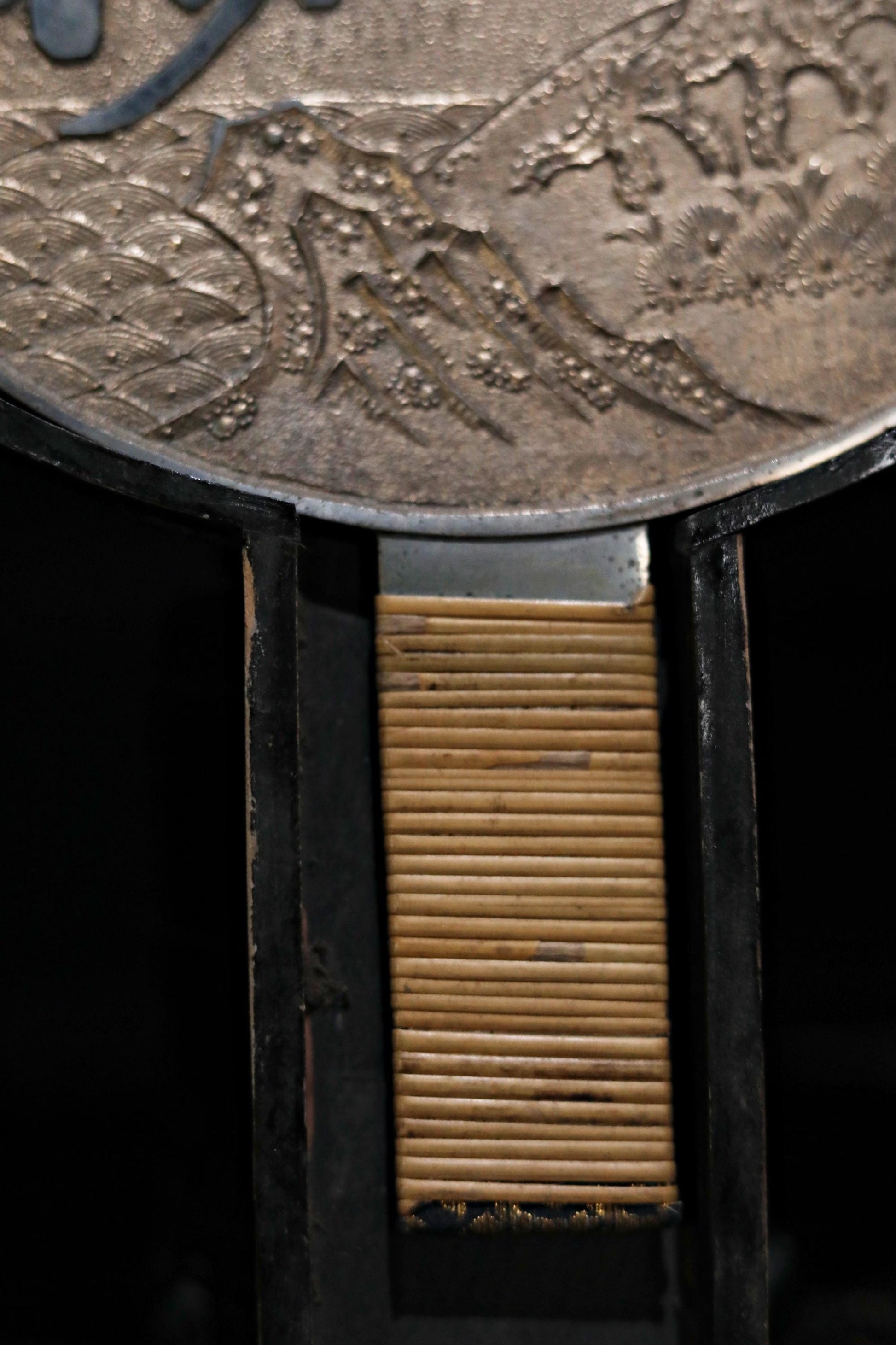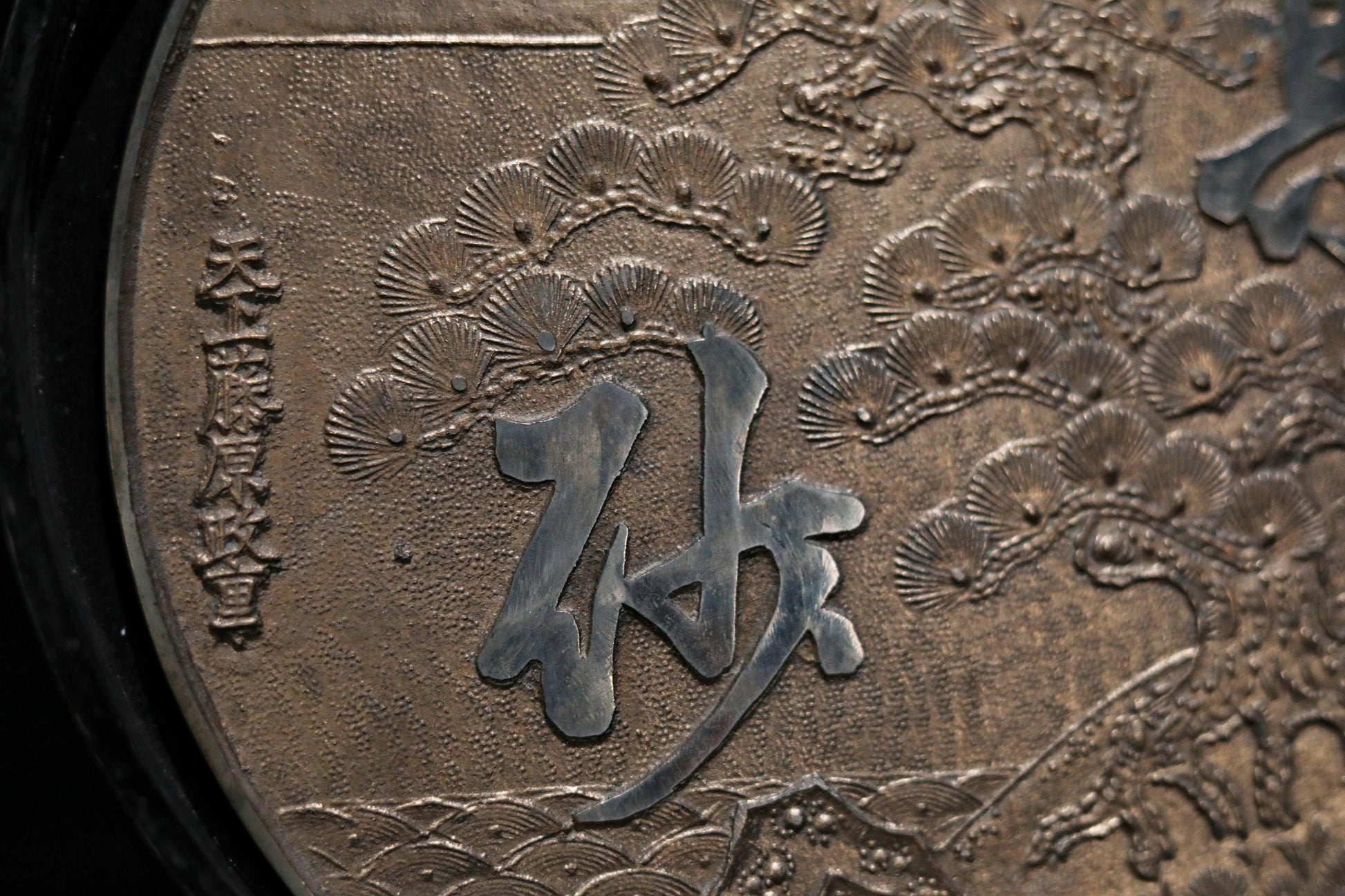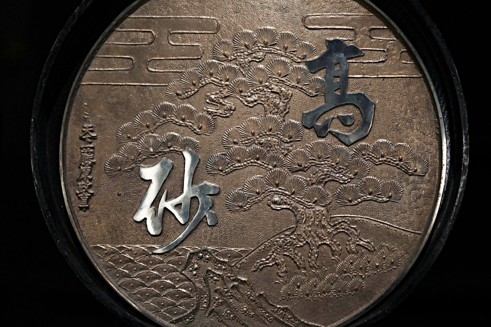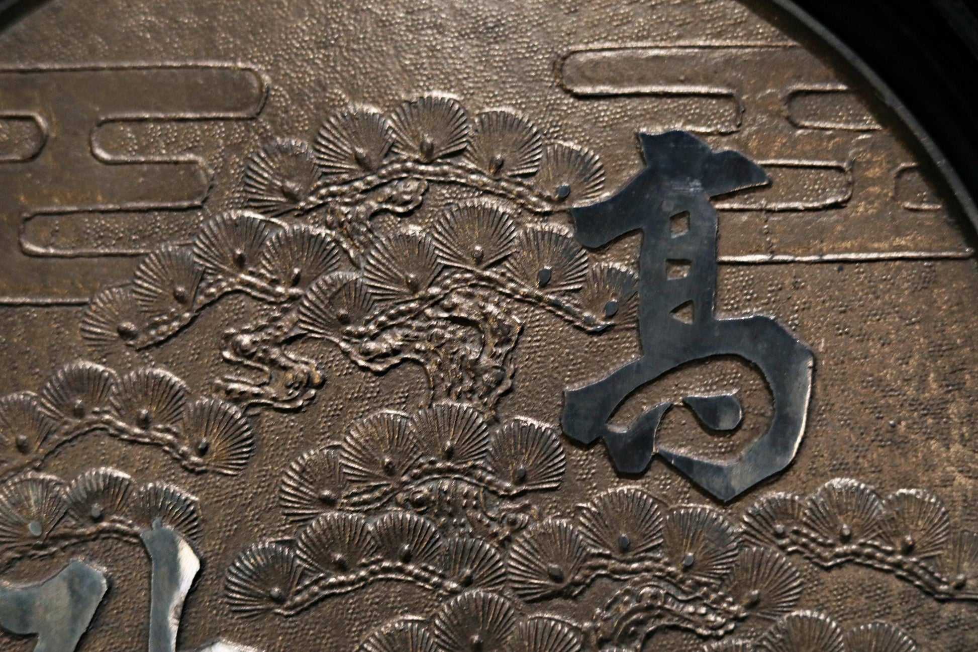 Pine trees are beautifully relieved. Inscribed in the center is "高砂Takasago" in Kanji characters. Takasago" is one of the Noh plays. The pine tree called "Aioi no Matsu" is located at Takasago Shrine in Takasago City, Hyogo Prefecture. The story is a very happy Noh play that celebrates the love between a married couple and their long life.
