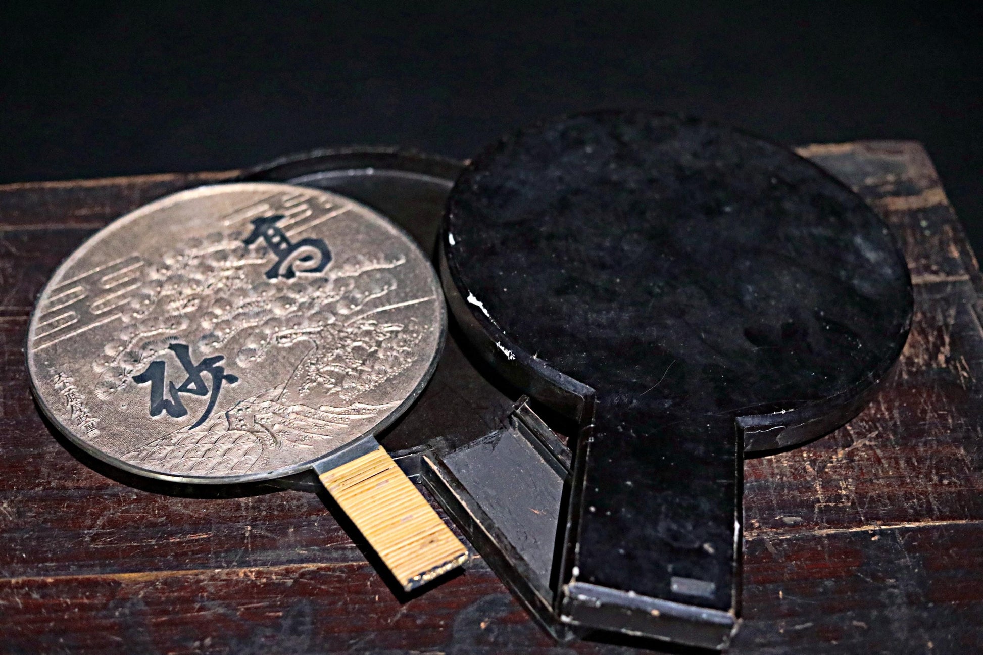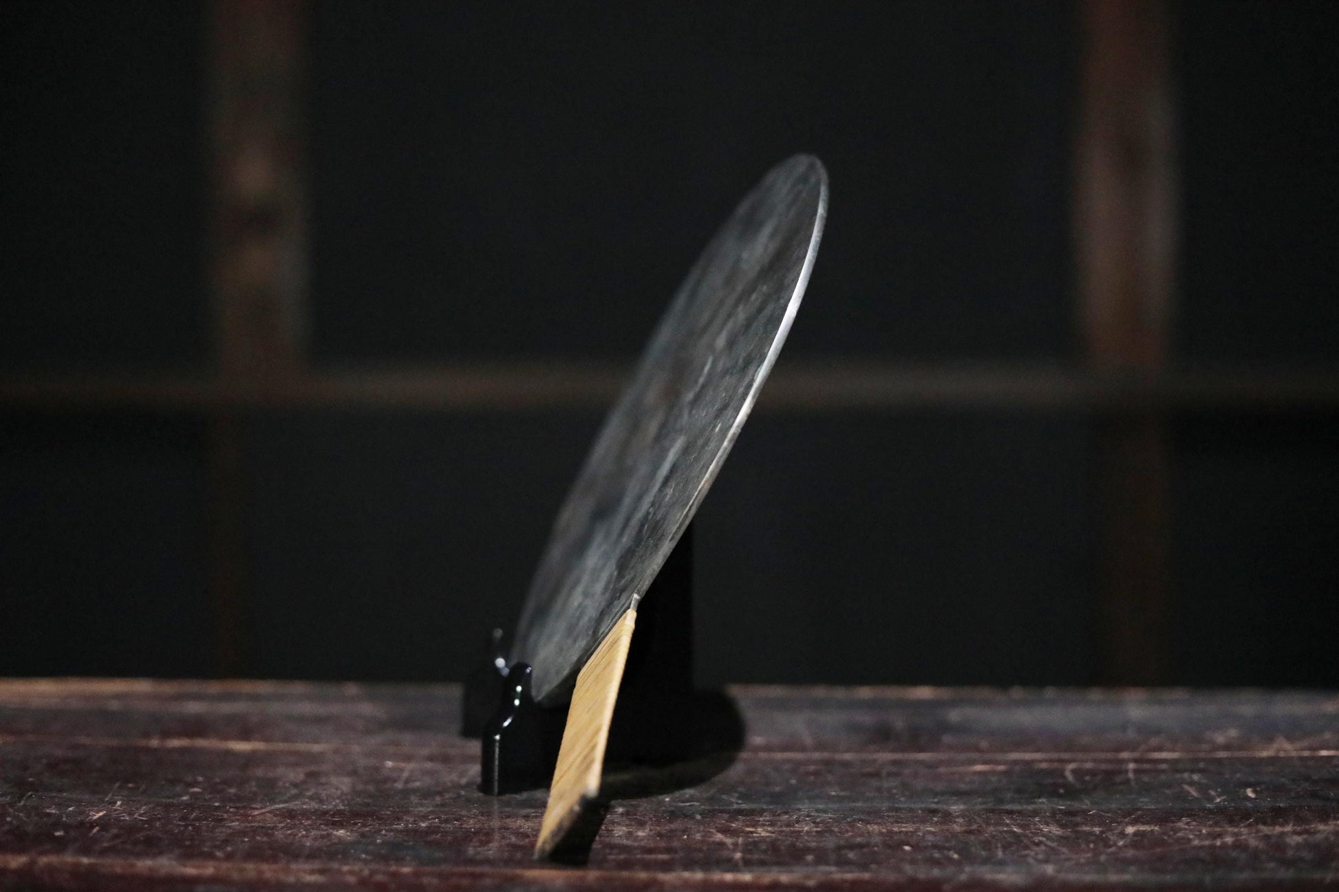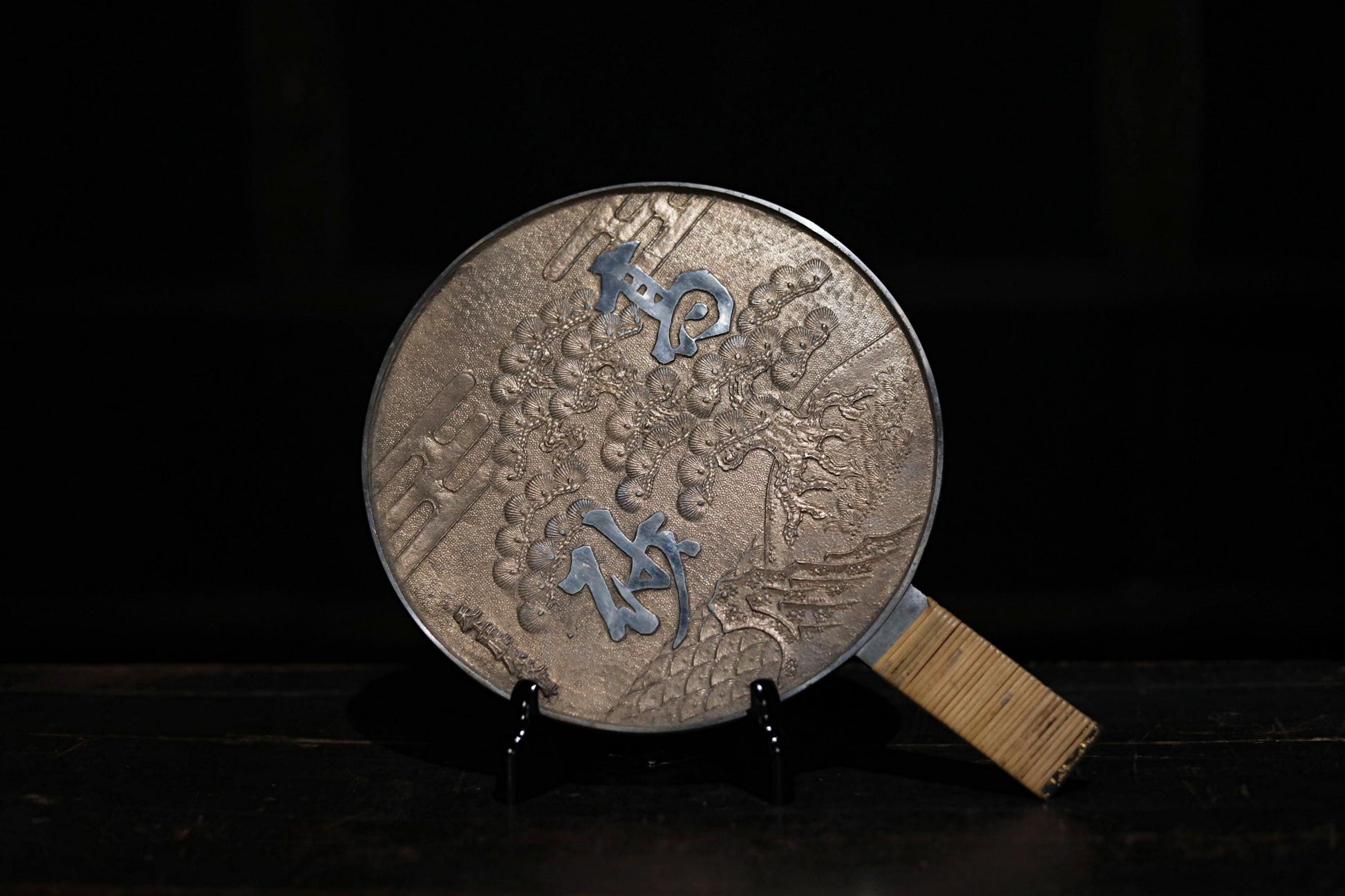 FINE! Japanese antique bronze mirror Kagami with relief of old pine Kanji with wooden case Geisha accessory SAMURAI 1800s H12.7in/H32.3cm