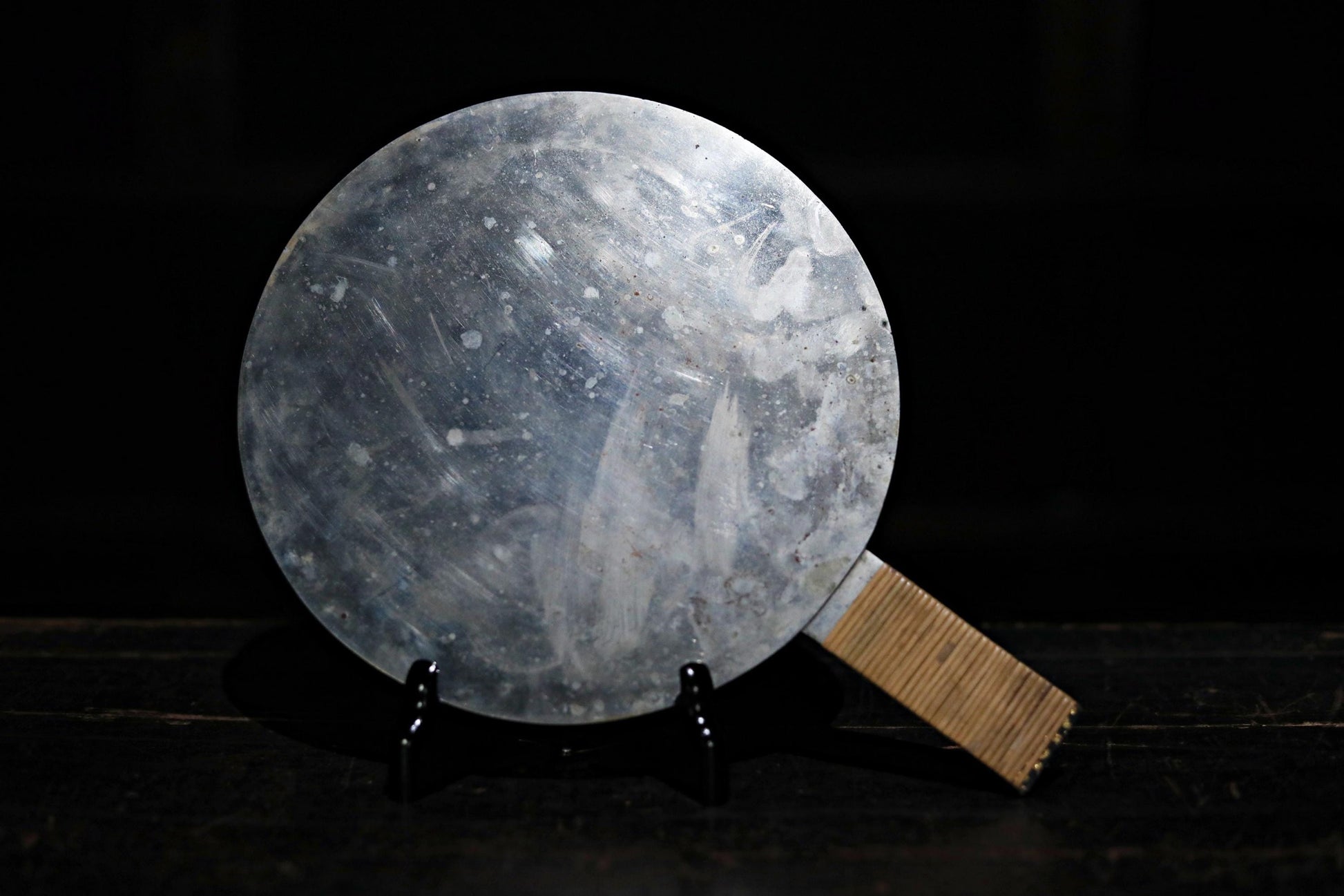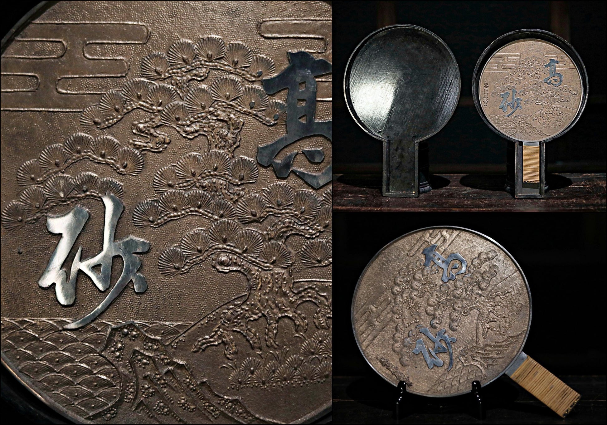 Japanese antique bronze mirror Kagami with relief of old pine tree and Kanji with wooden case Geisha accessory SAMURAI Edo 1800s H12.7in/H32.3cm.