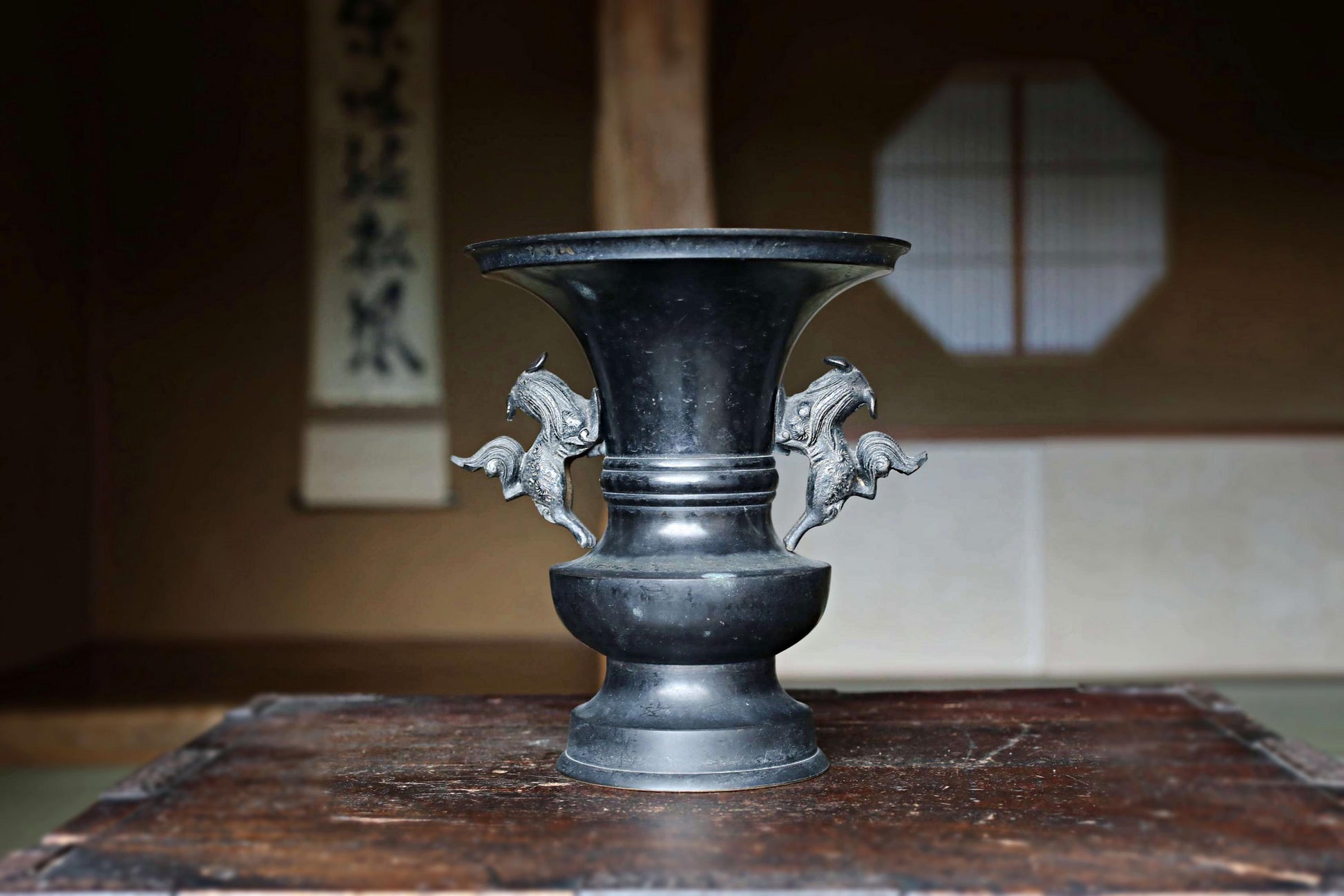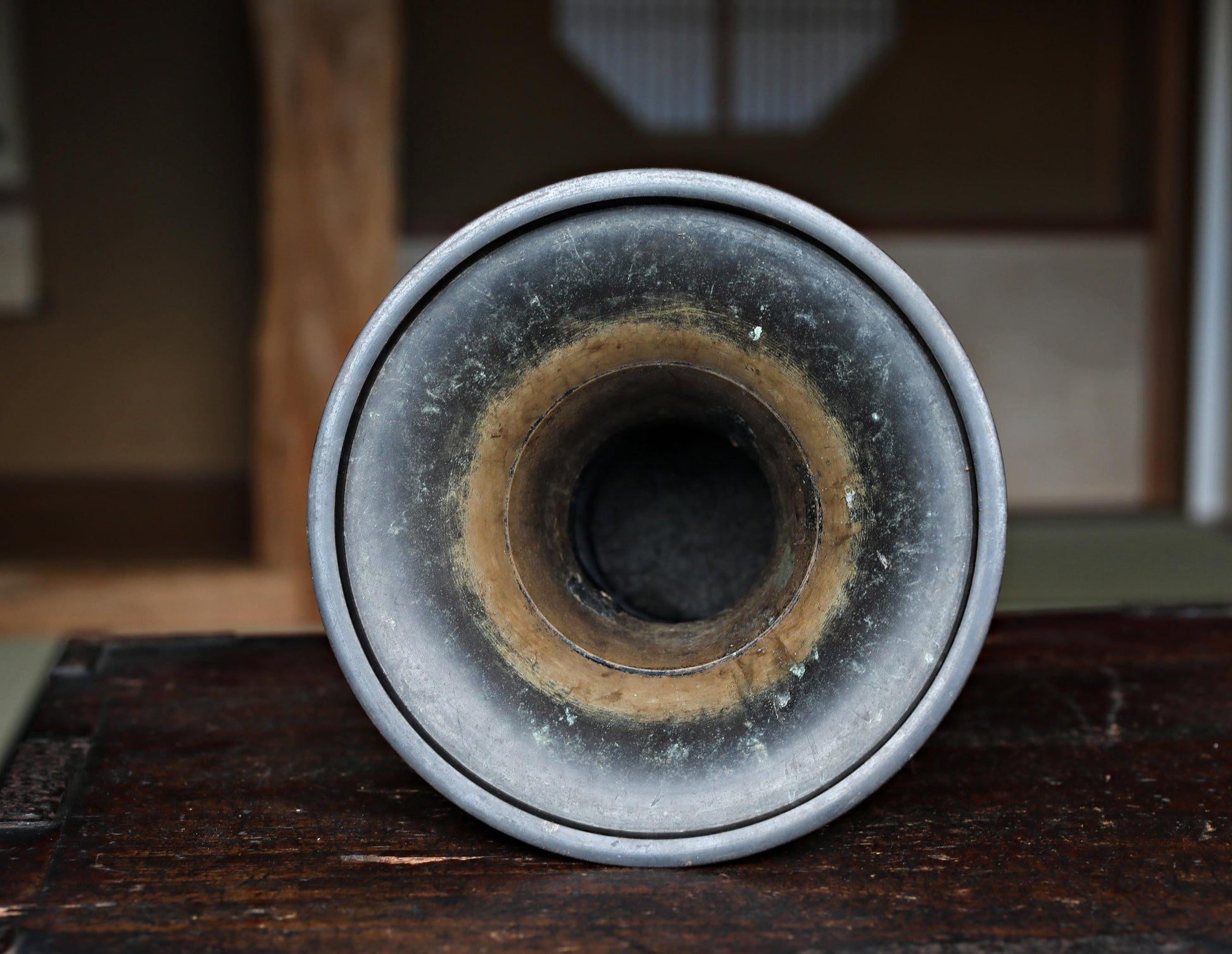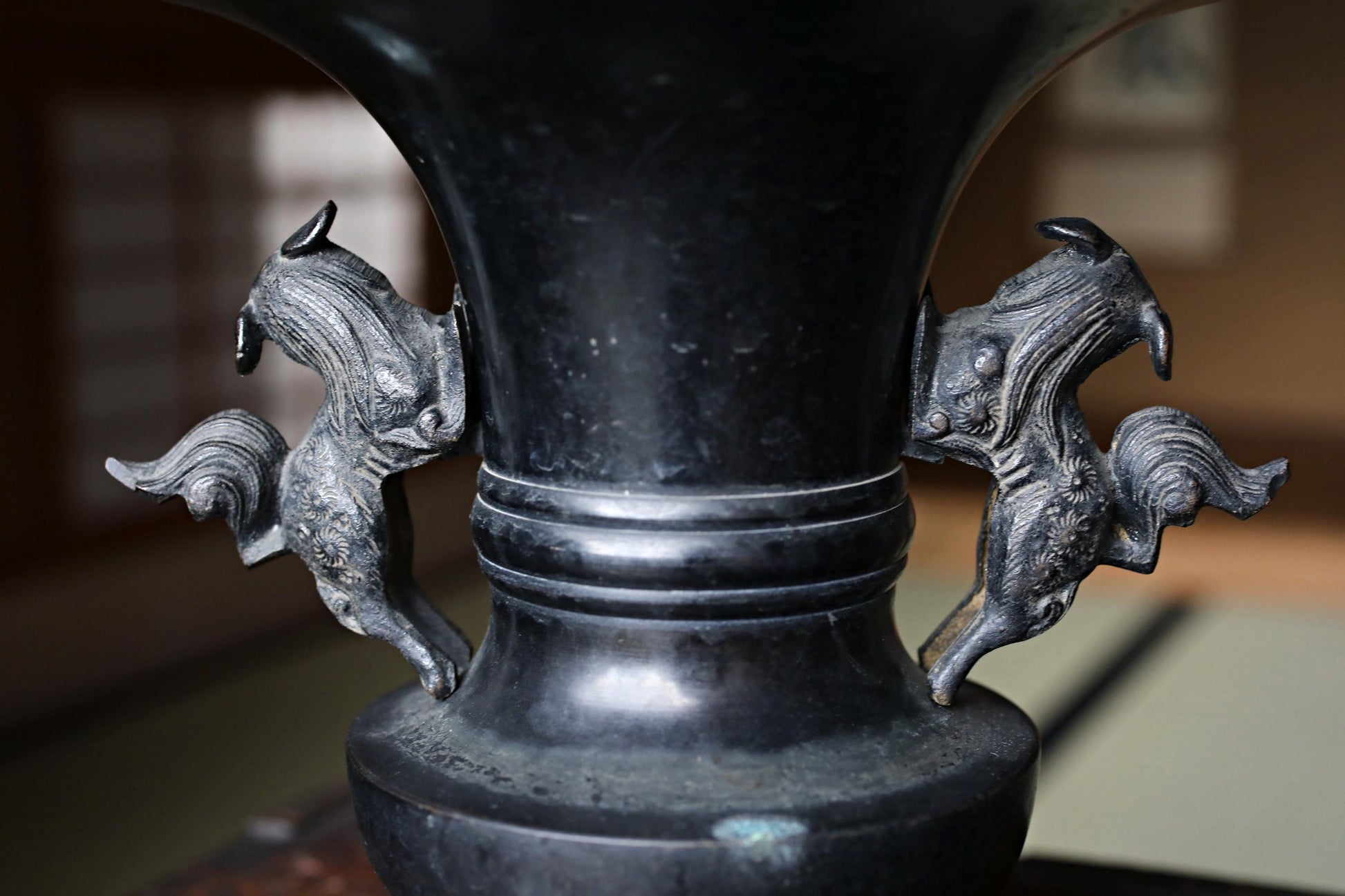 These bronze vessels were displayed in pairs in front of the Buddha, the principal object of worship in temples. They originated in the Heian period (9th-12th century), when esoteric Buddhism was practiced. Graceful curves and proportions were paramount. After the Heian period, Buddhist altars became more intricately decorated.
