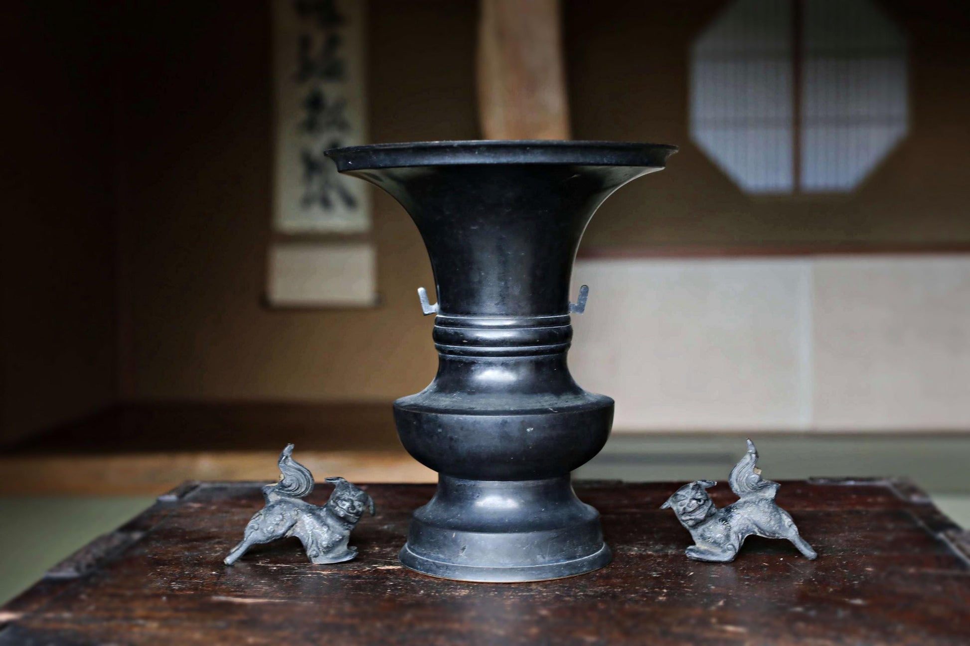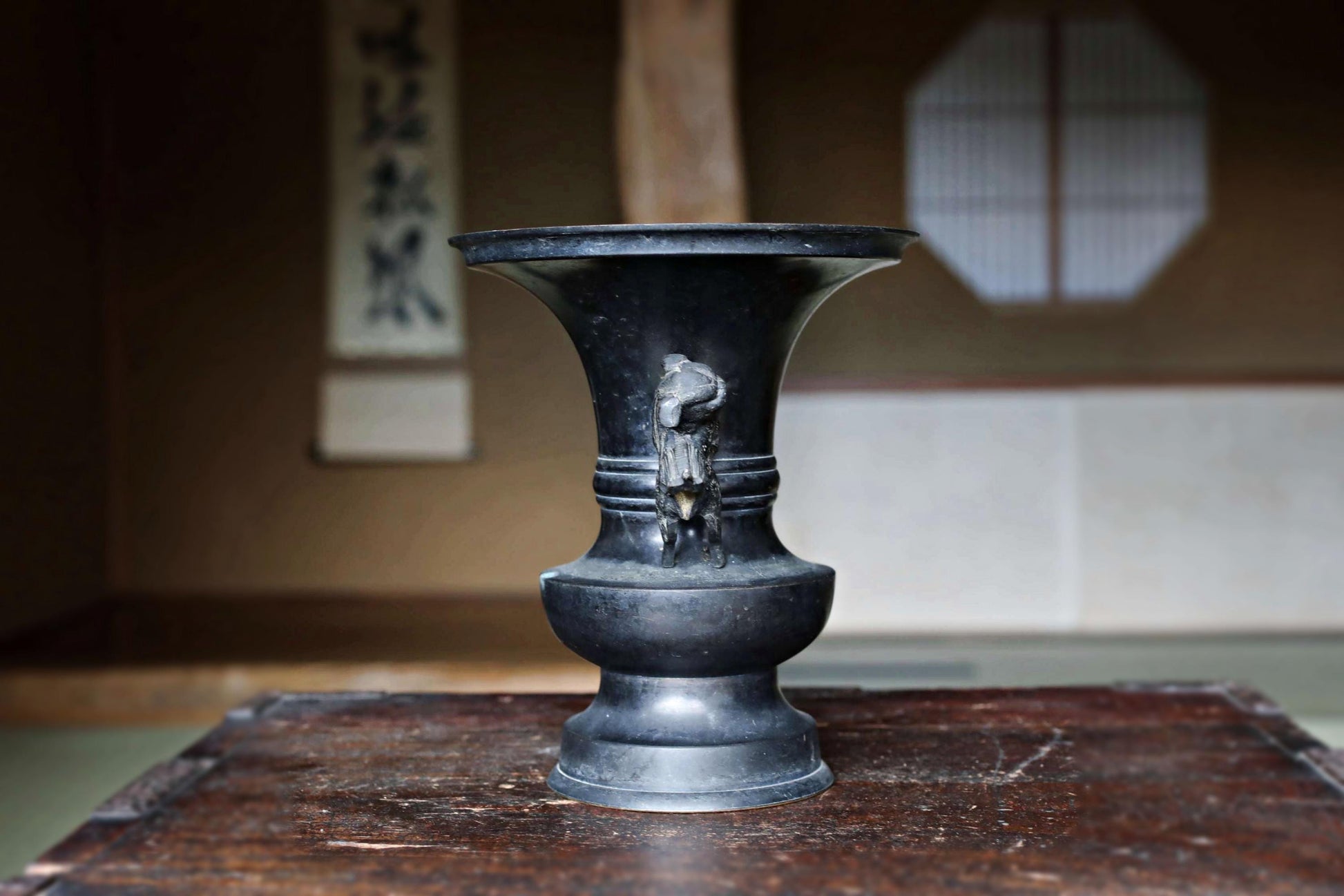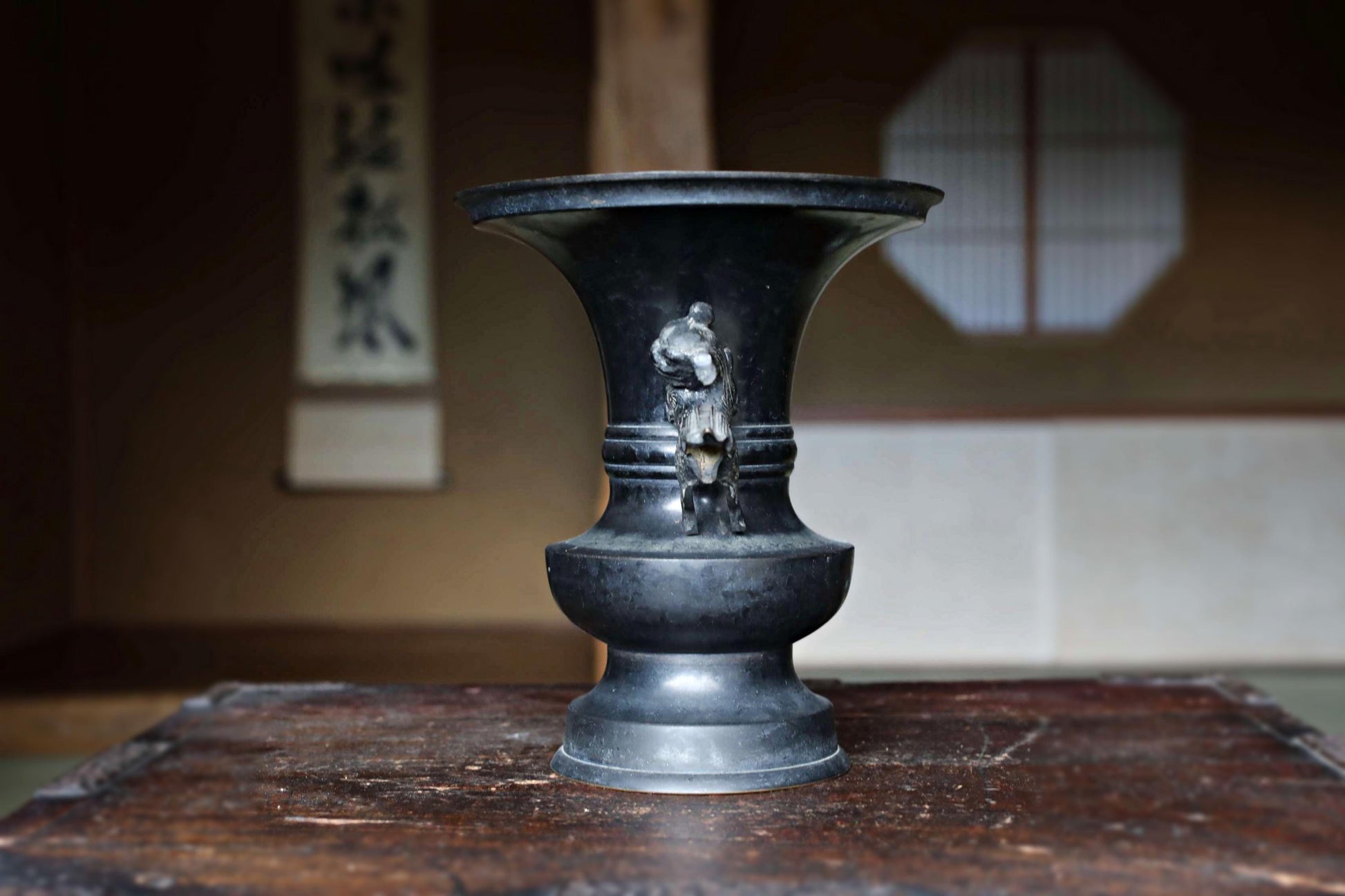 These bronze vessels were displayed in pairs in front of the Buddha, the principal object of worship in temples. They originated in the Heian period (9th-12th century), when esoteric Buddhism was practiced. Graceful curves and proportions were paramount. After the Heian period, Buddhist altars became more intricately decorated.