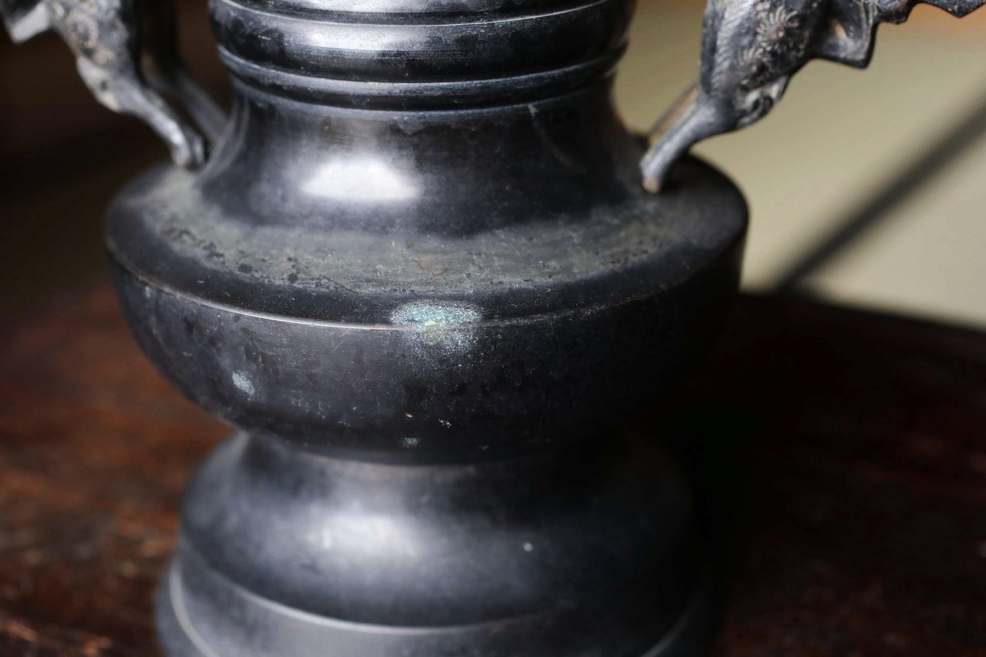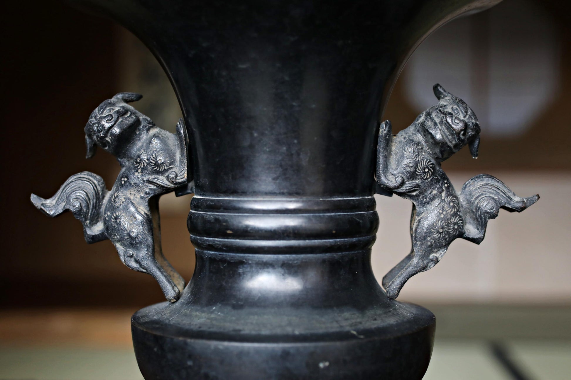 Large! Japanese antique bronze vase with little lions from a buddhist temple with a signature, ikebana utensil 1800s H8.3×7.7in/H21×19.5cm.
