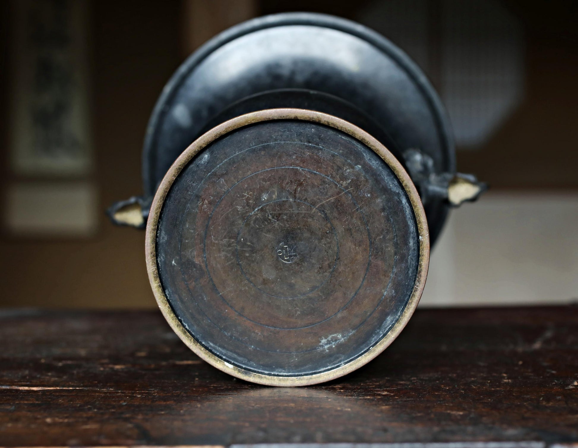 The color of copper over time creates a cool atmosphere. The lions on both sides are also beautifully crafted. These can be easily removed. On the bottom is the maker's signature.