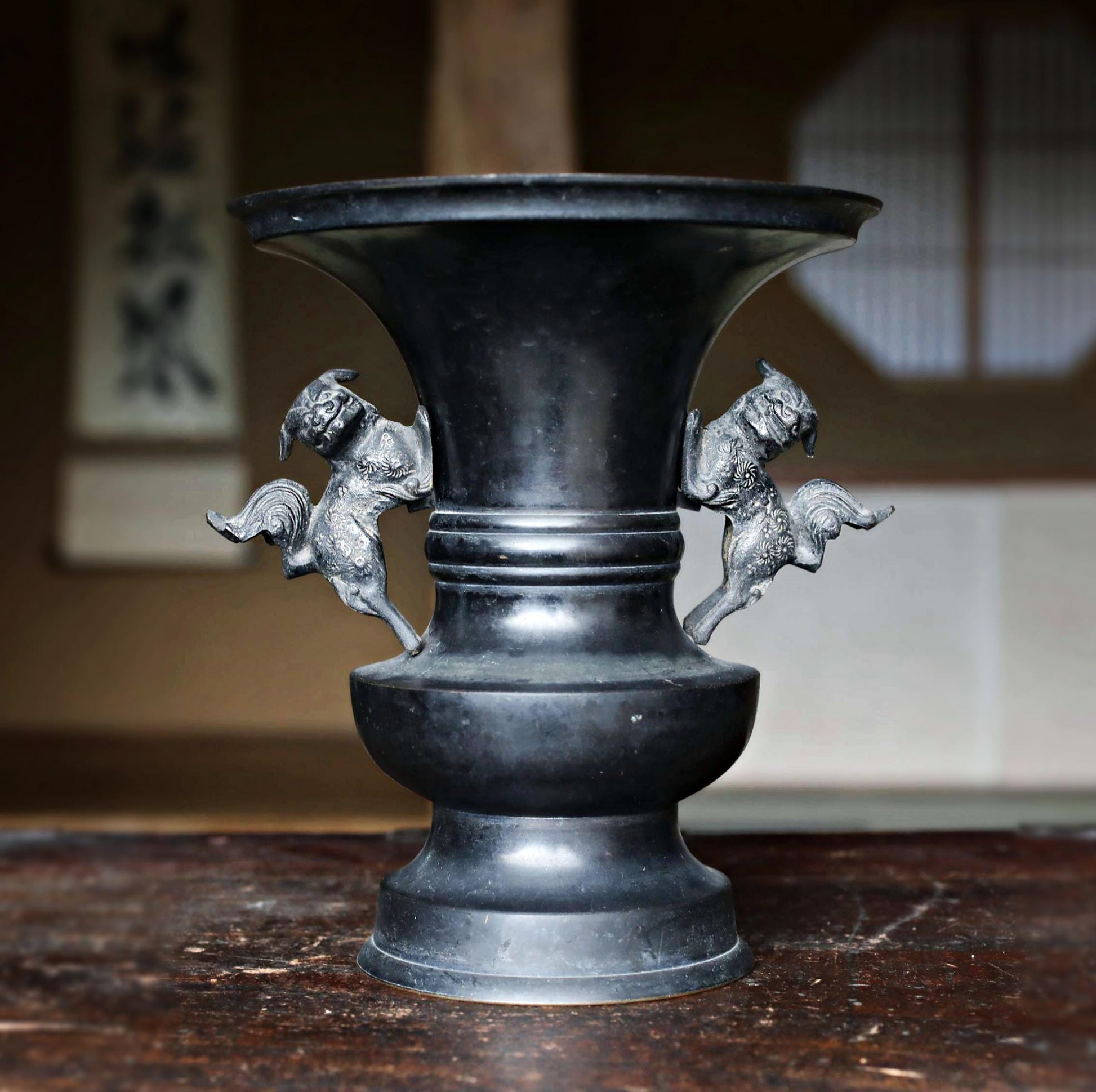 FINE! Japanese antique bronze vase with little lions from a buddhist temple with a signature, ikebana utensil 1800s H8.3×7.7in/H21×19.5cm