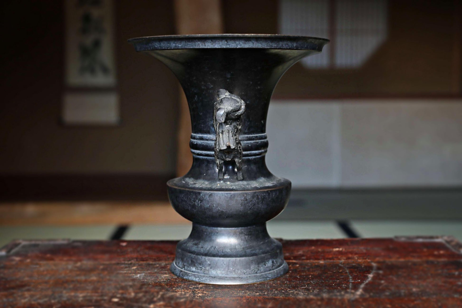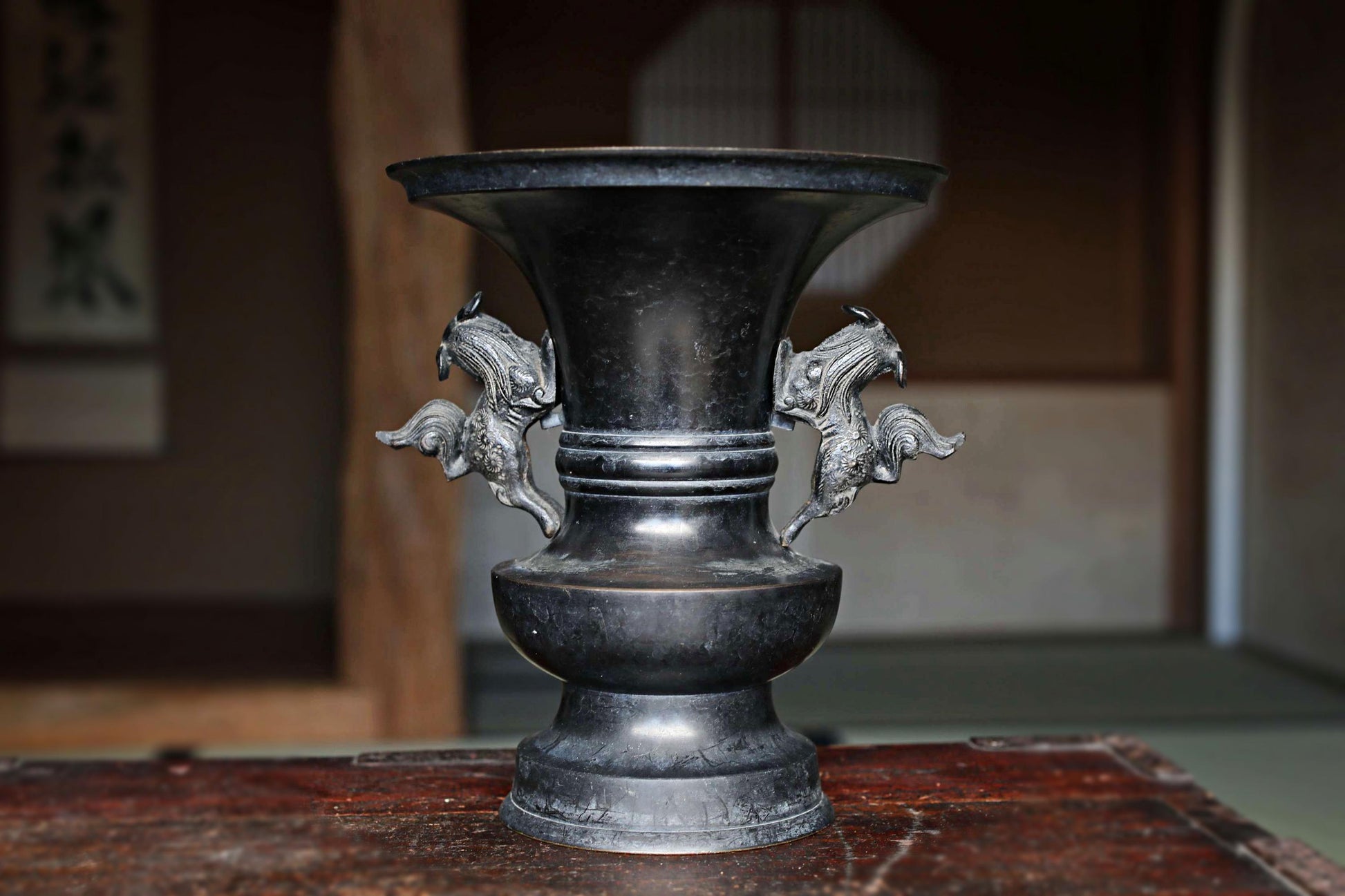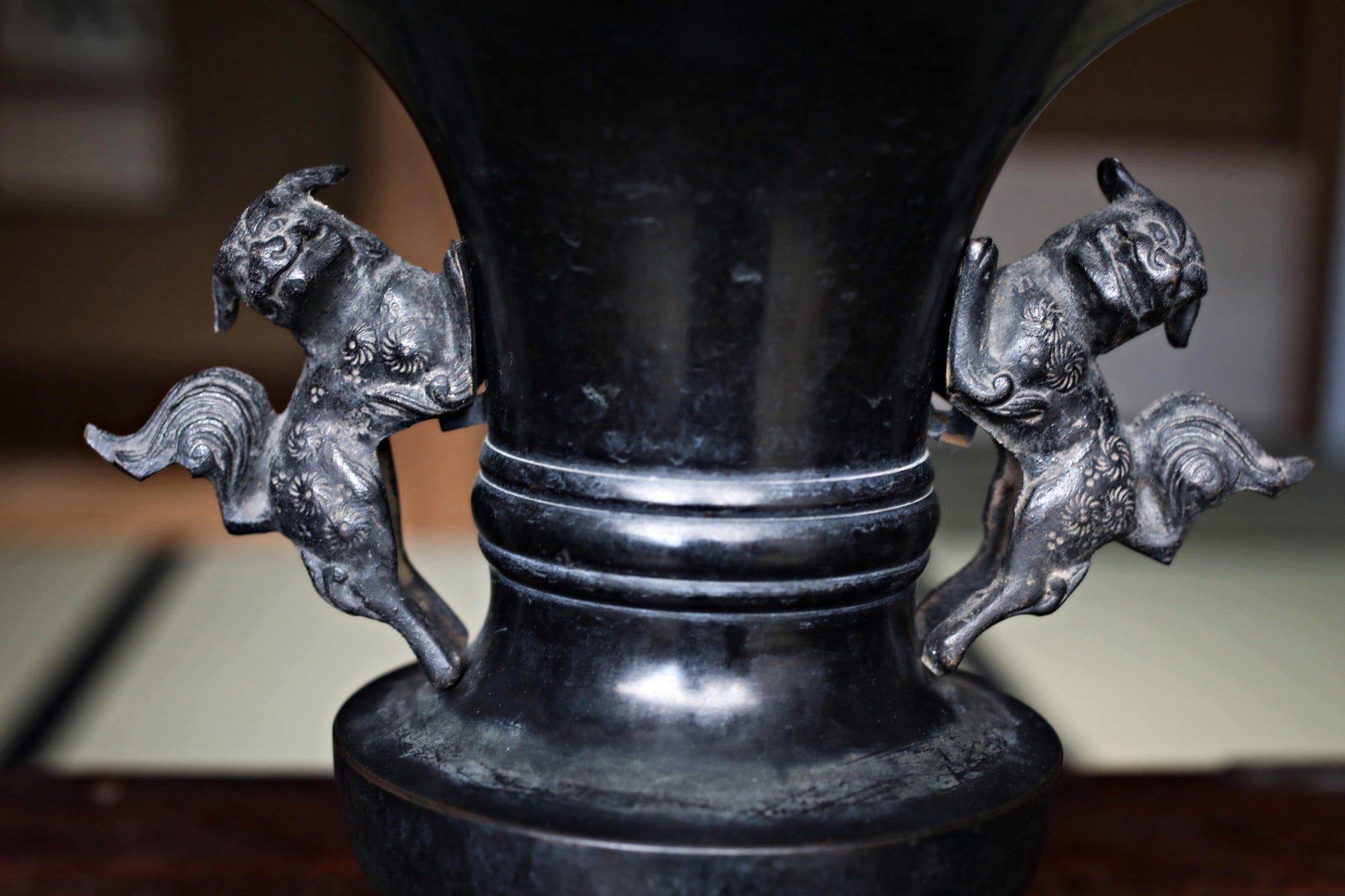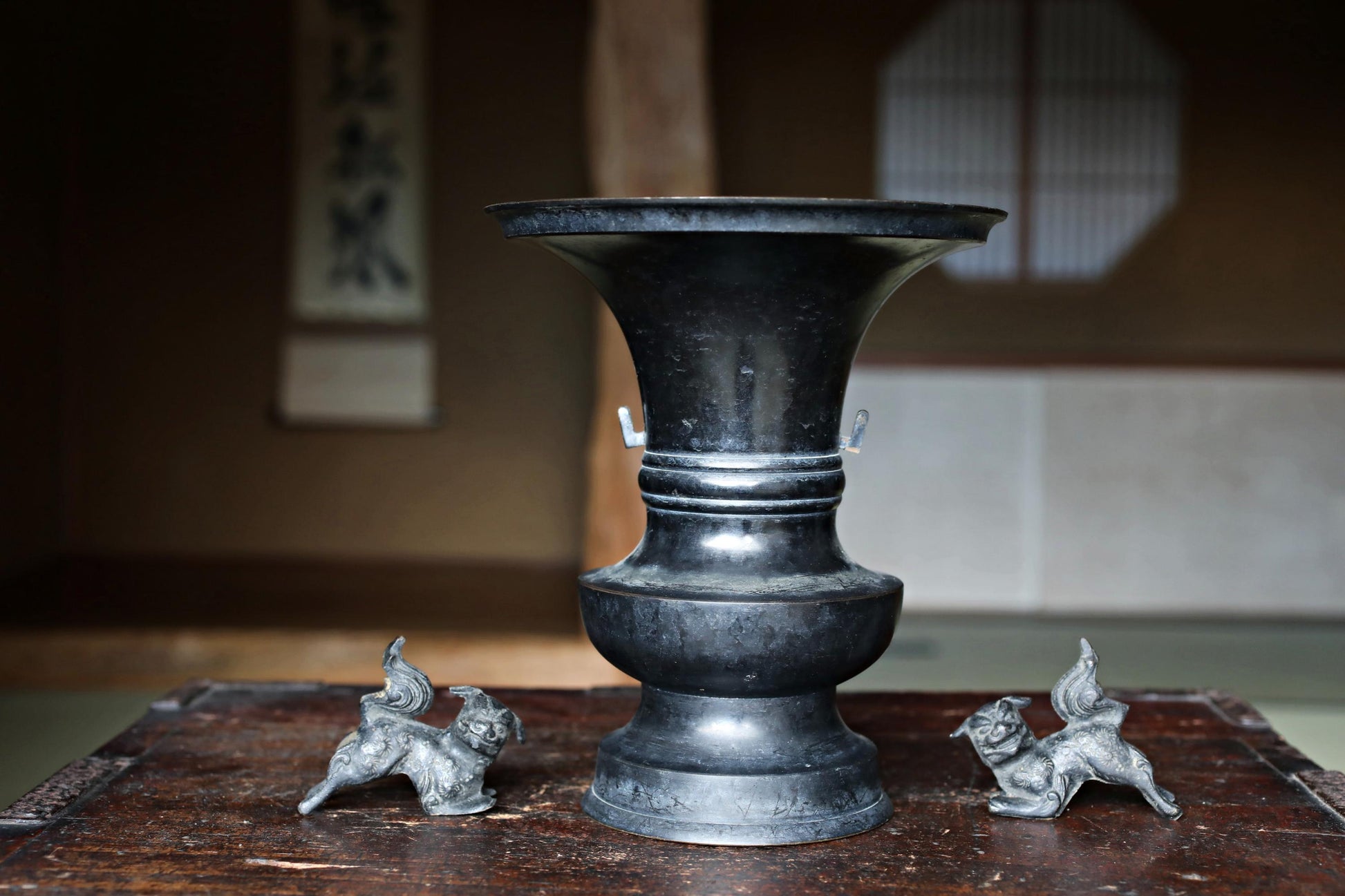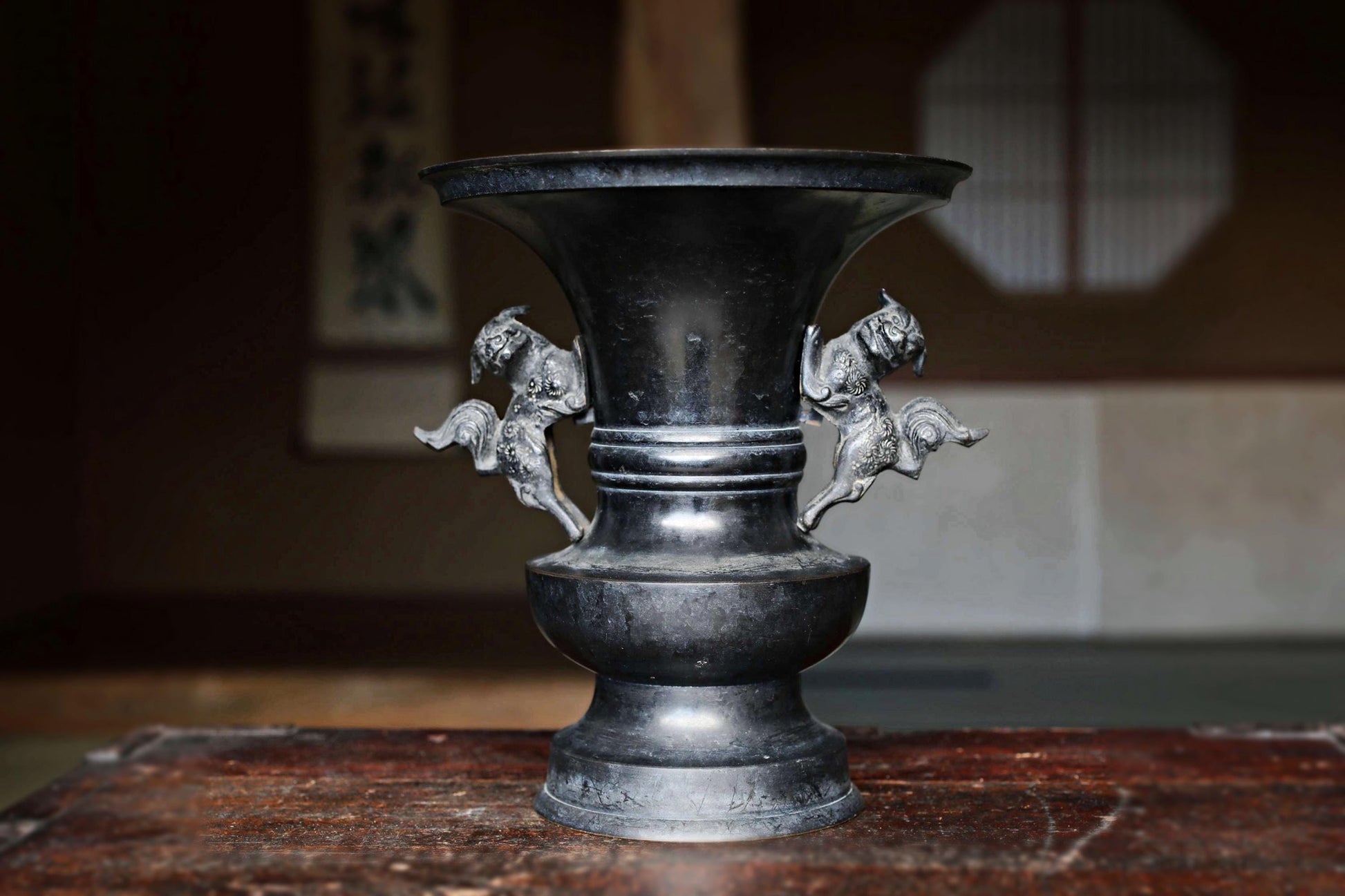 Large! Japanese antique bronze vase with little lions from a buddhist temple with a signature, ikebana utensil 1800s H8.3×7.7in/H21×19.5cm.