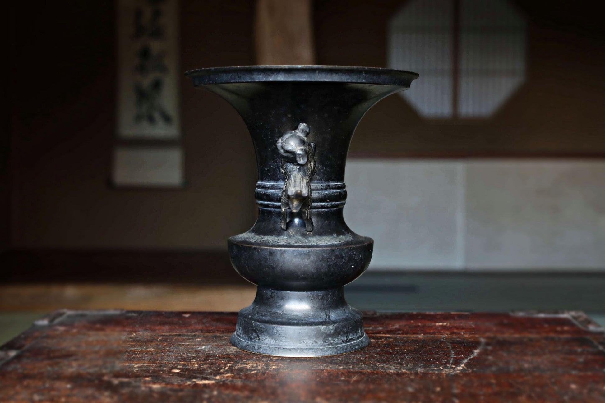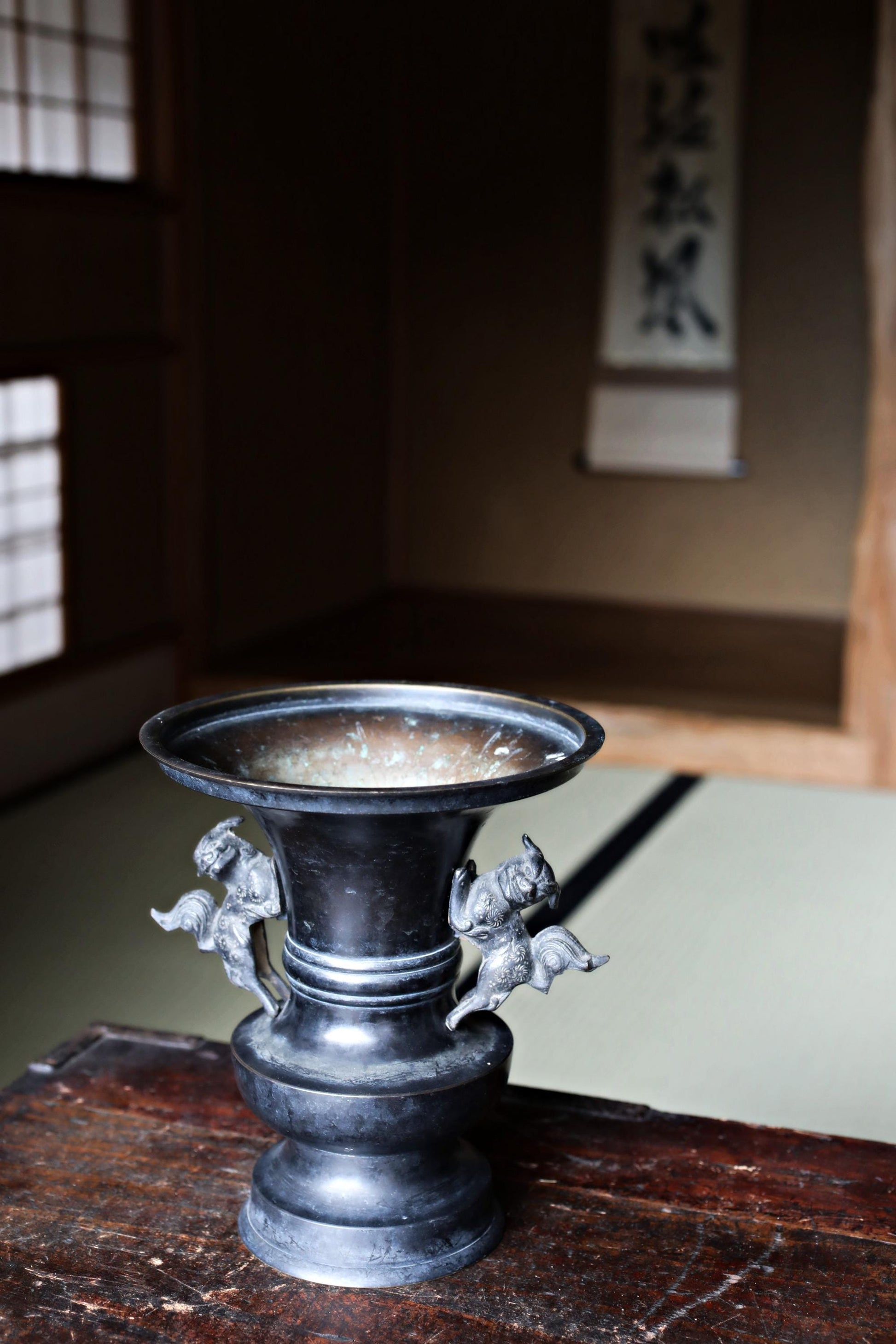 FINE! Japanese antique bronze vase with little lions from a buddhist temple with a signature, ikebana utensil 1800s H8.3×7.7in/H21×19.5cm