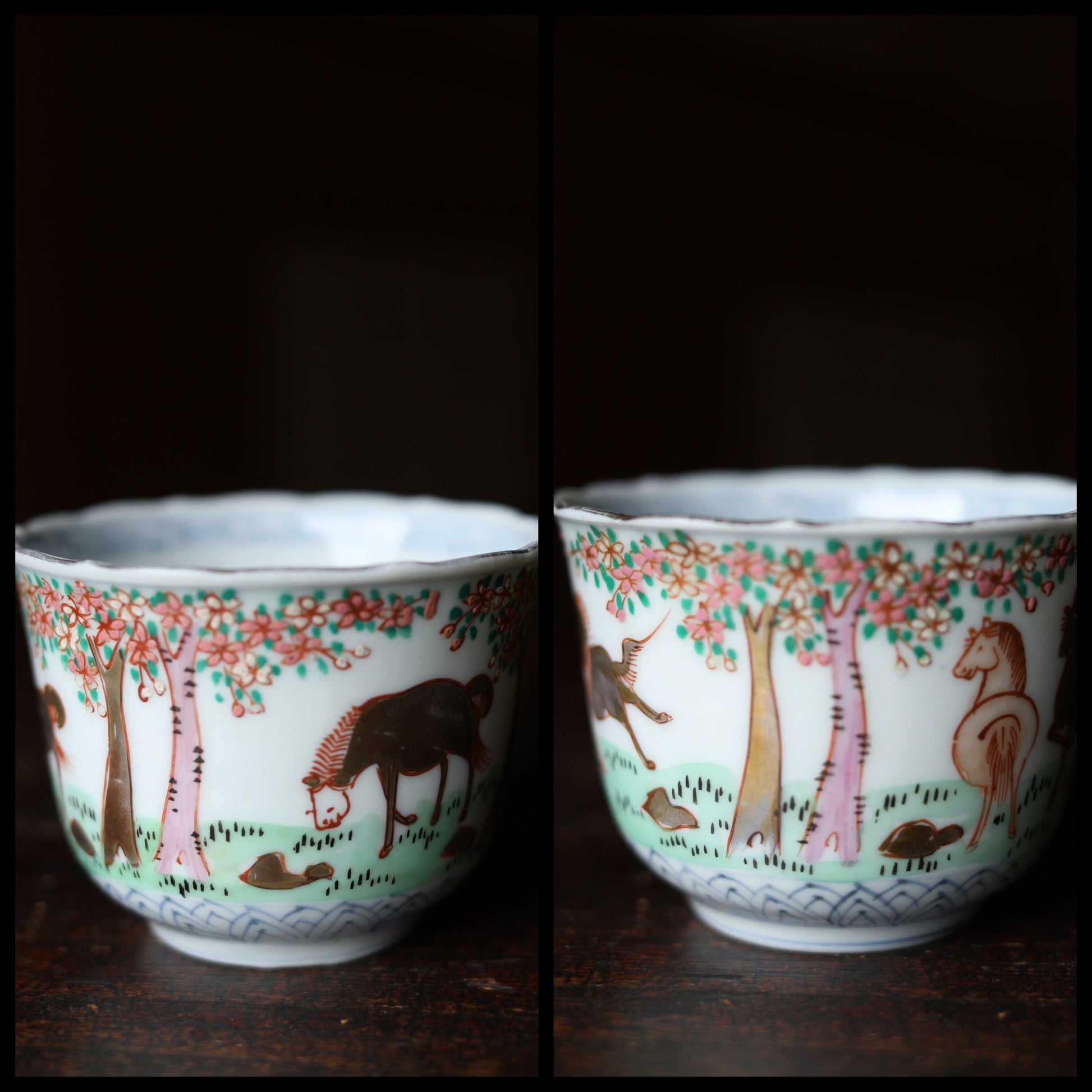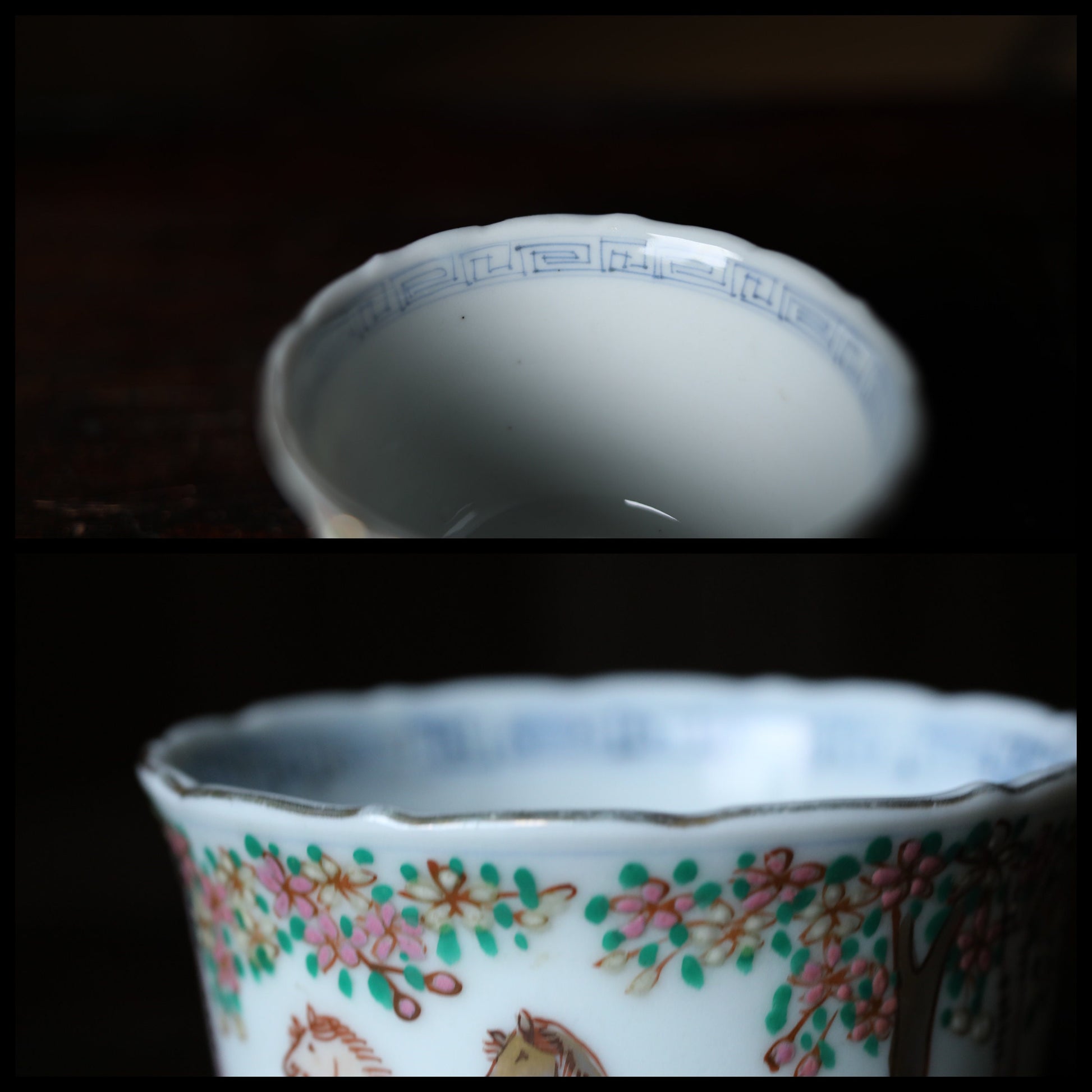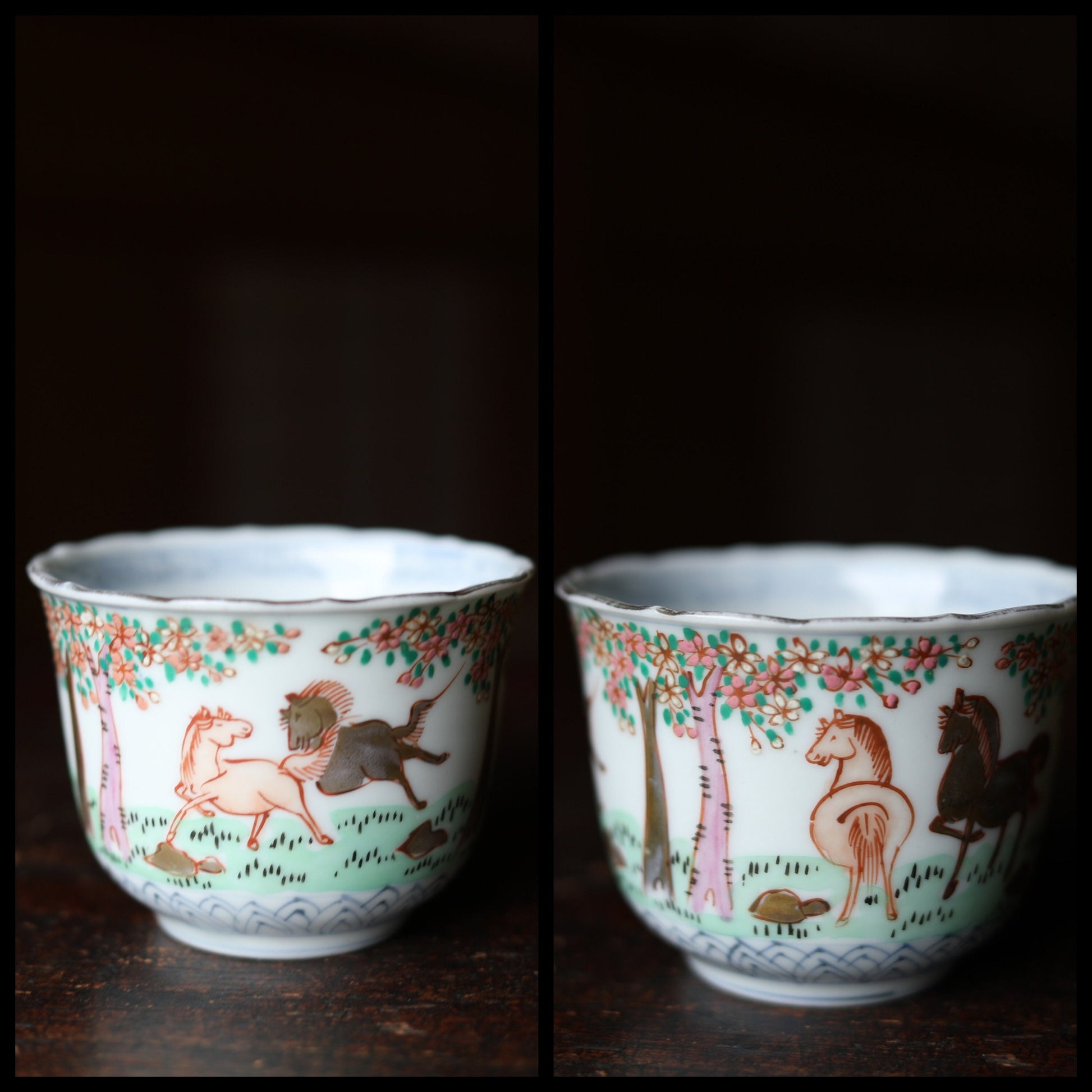 The items came from the storehouse of an aristocratic family, and there are 10 more identical cups. They were made to order and have a very lovely depiction of a couple of horses playing. The rim is made in the shape of a flower, and the inside also has a fine hand-drawn pattern in pale indigo color. The animal design is rare and highly recommended.